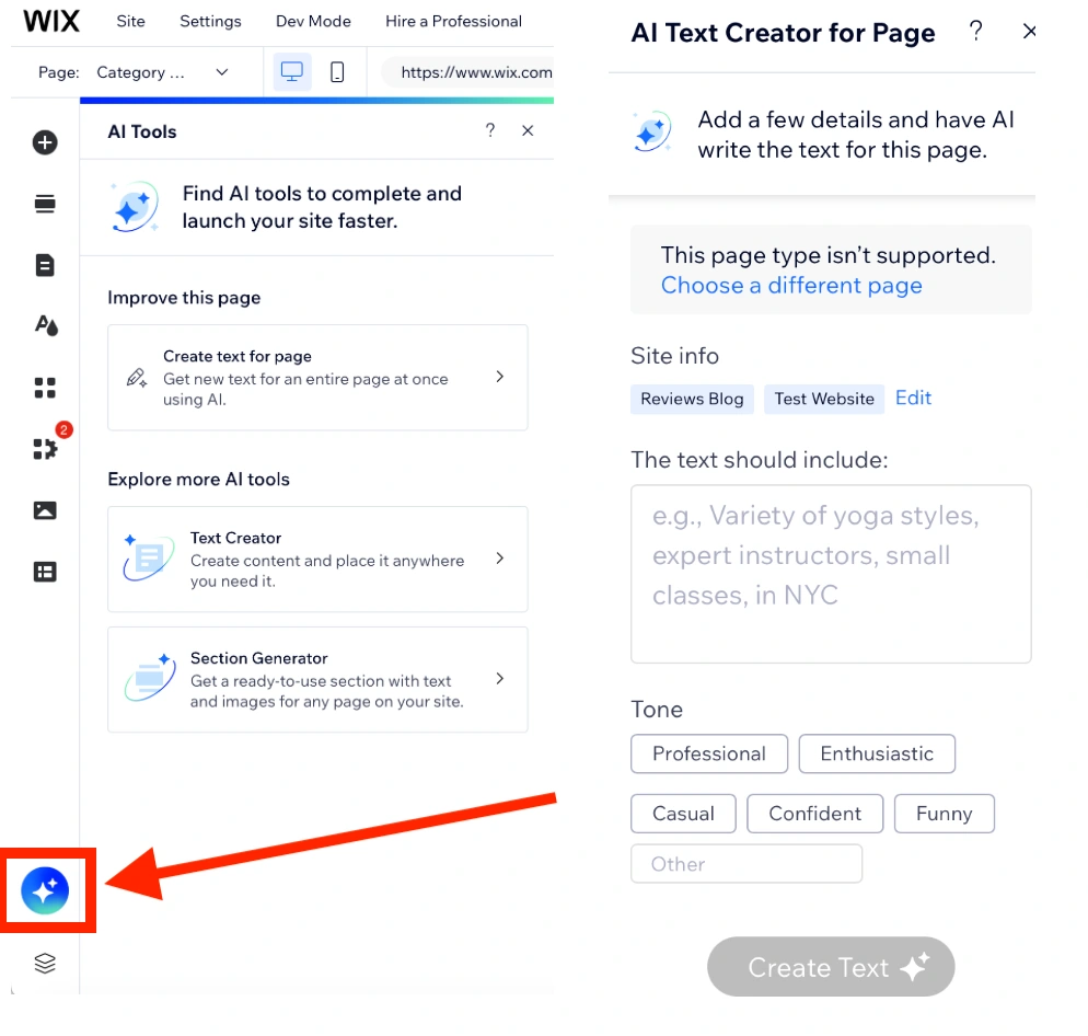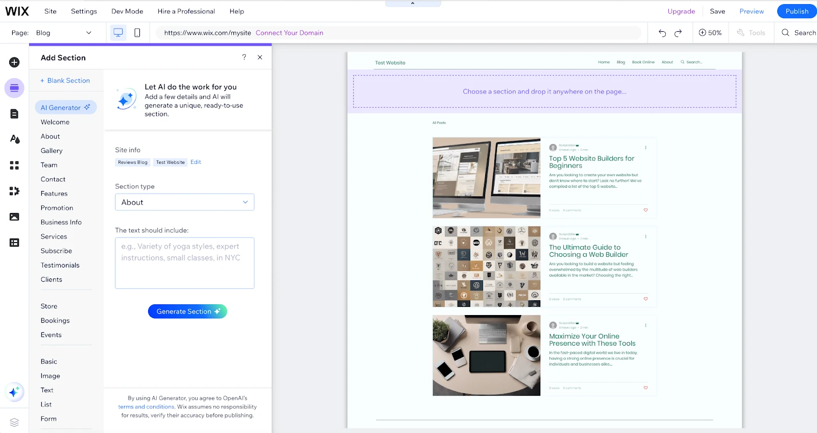 One of the reasons we love Wix is its AI section generator, which allows you to quickly add ready-to-use sections with text and images to any page on your site. Simply use the form to choose the section type, describe what the text should include, and click Generate Section.