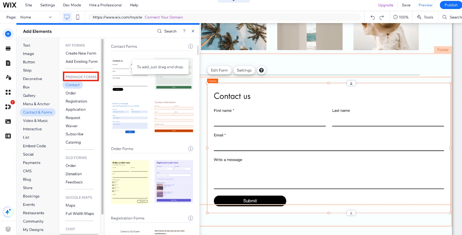 To save time, we recommend that you drag and drop Premade forms, Old forms, Google Maps and Wix chat on your site.