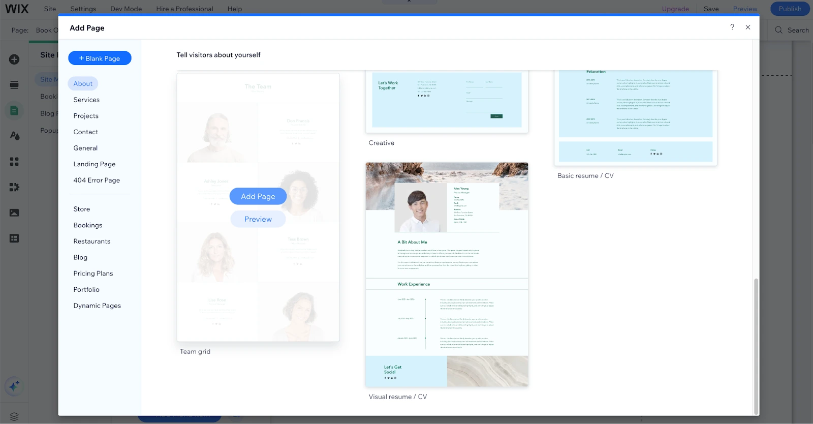 To create new site pages, navigate to and click on Add a Page. A pop-up window will appear, displaying a list of ready-to-use page templates you can add or preview.