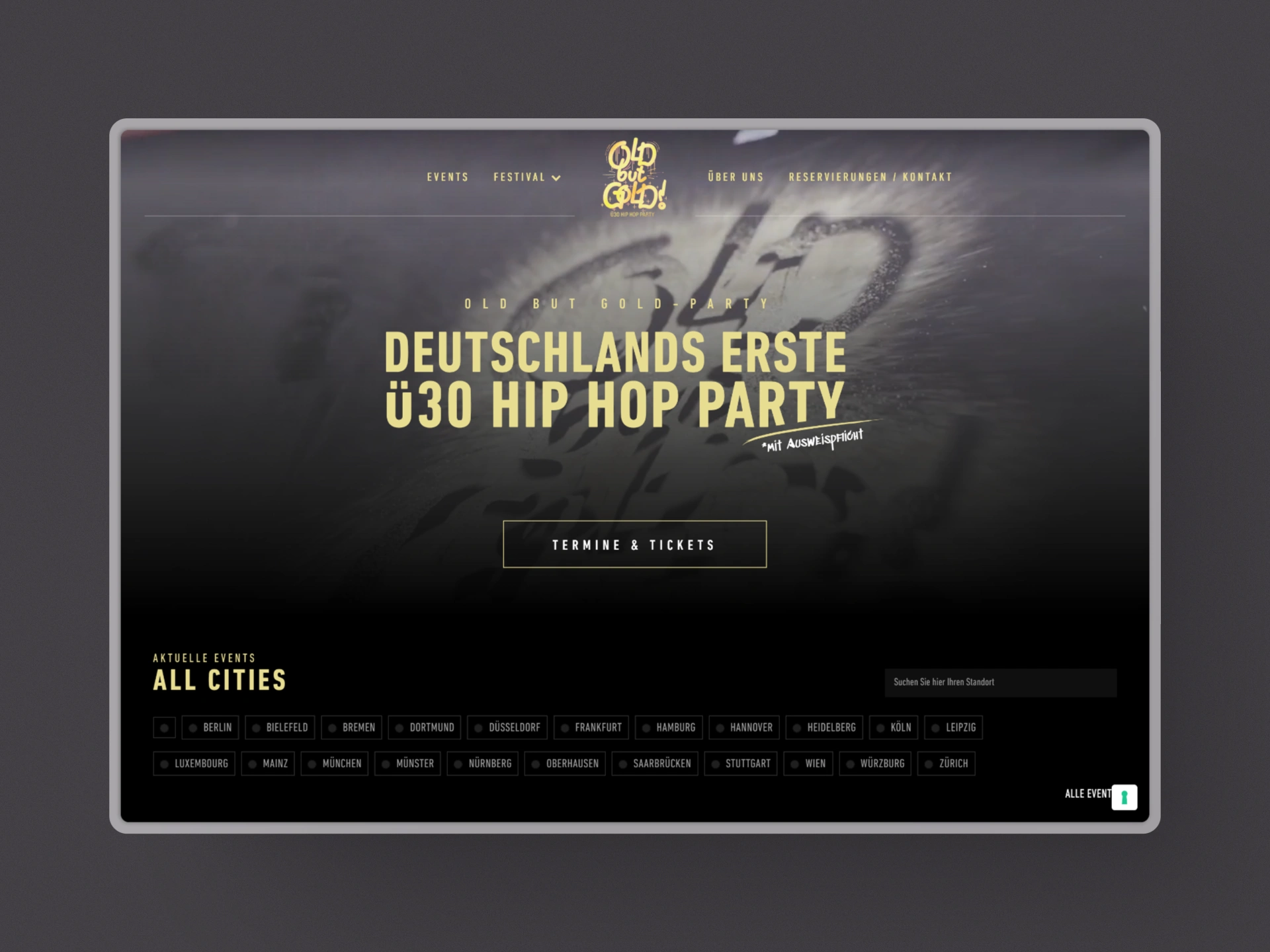 I developed the dynamic event website for Old But Gold, Germany’s first Ü30 Hip Hop party series. Built in Webflow, the goal was to deliver a seamless event discovery experience across multiple cities.