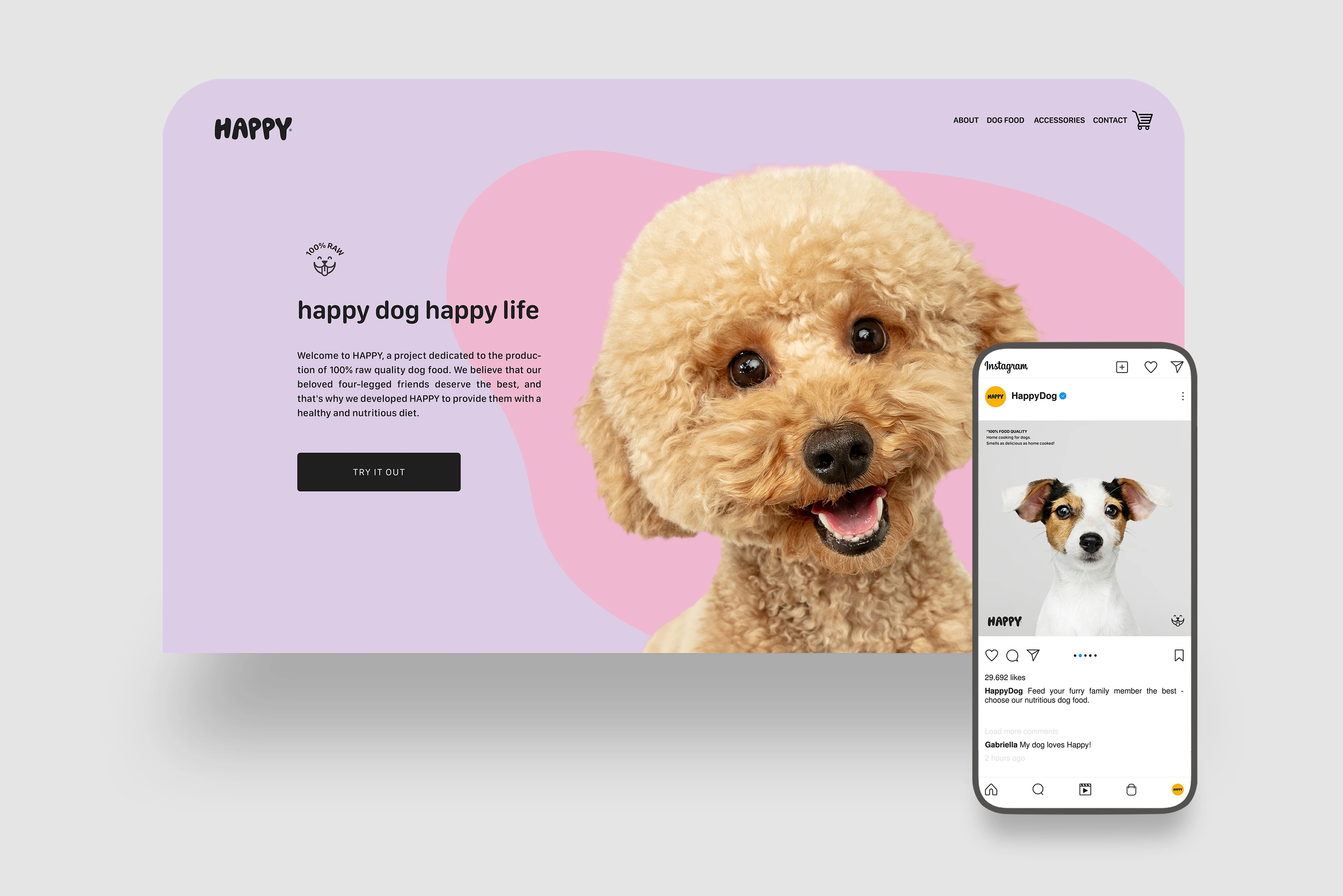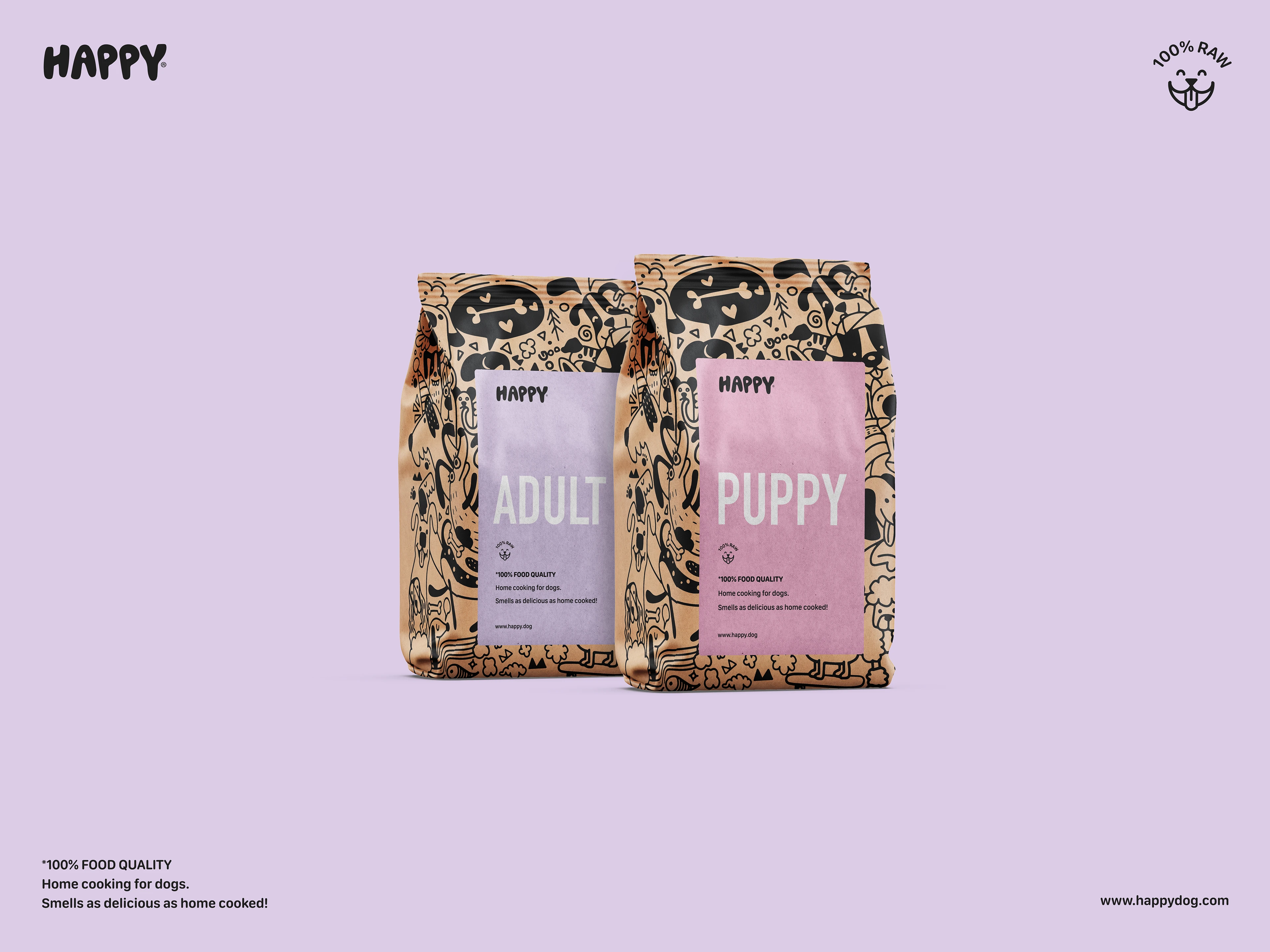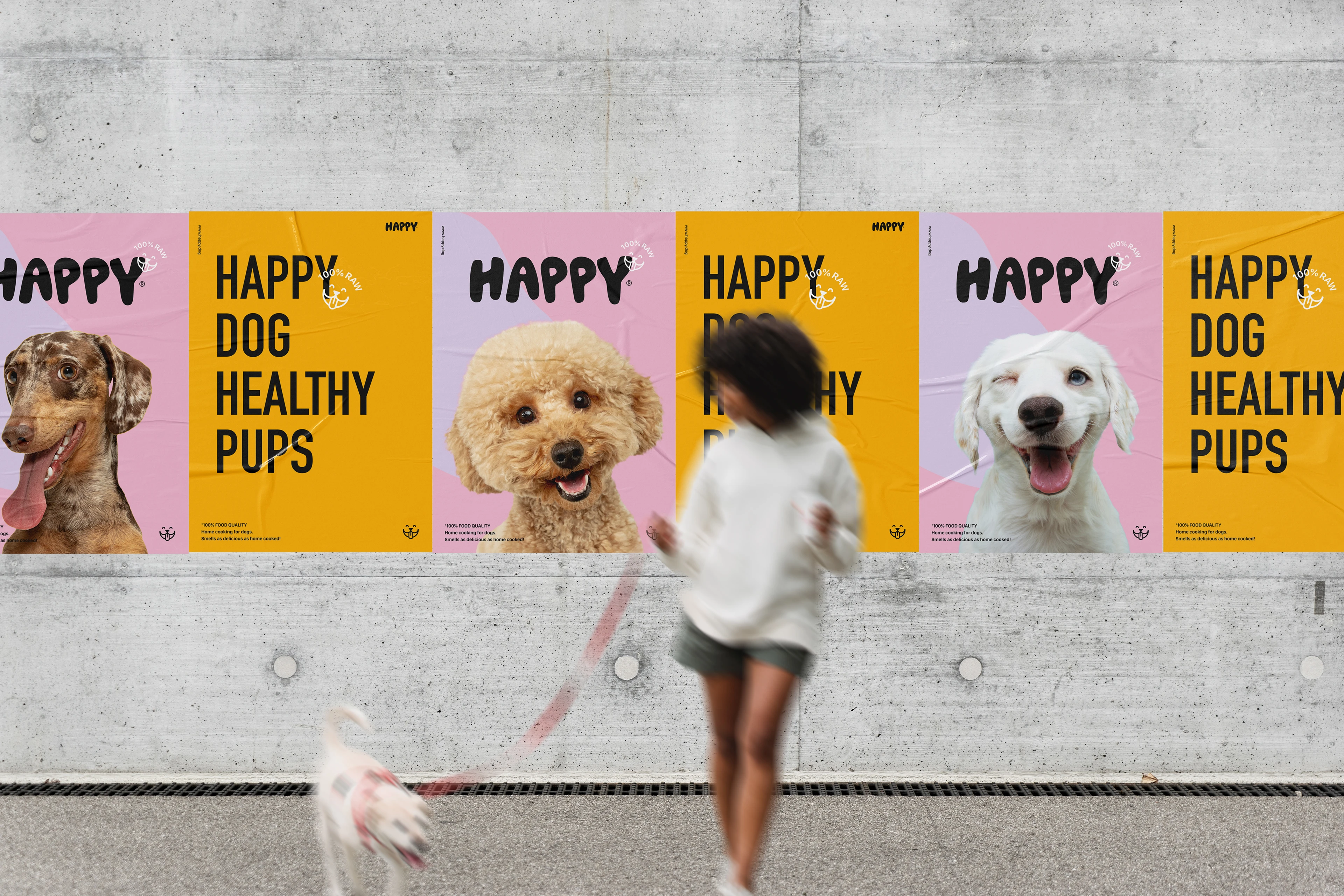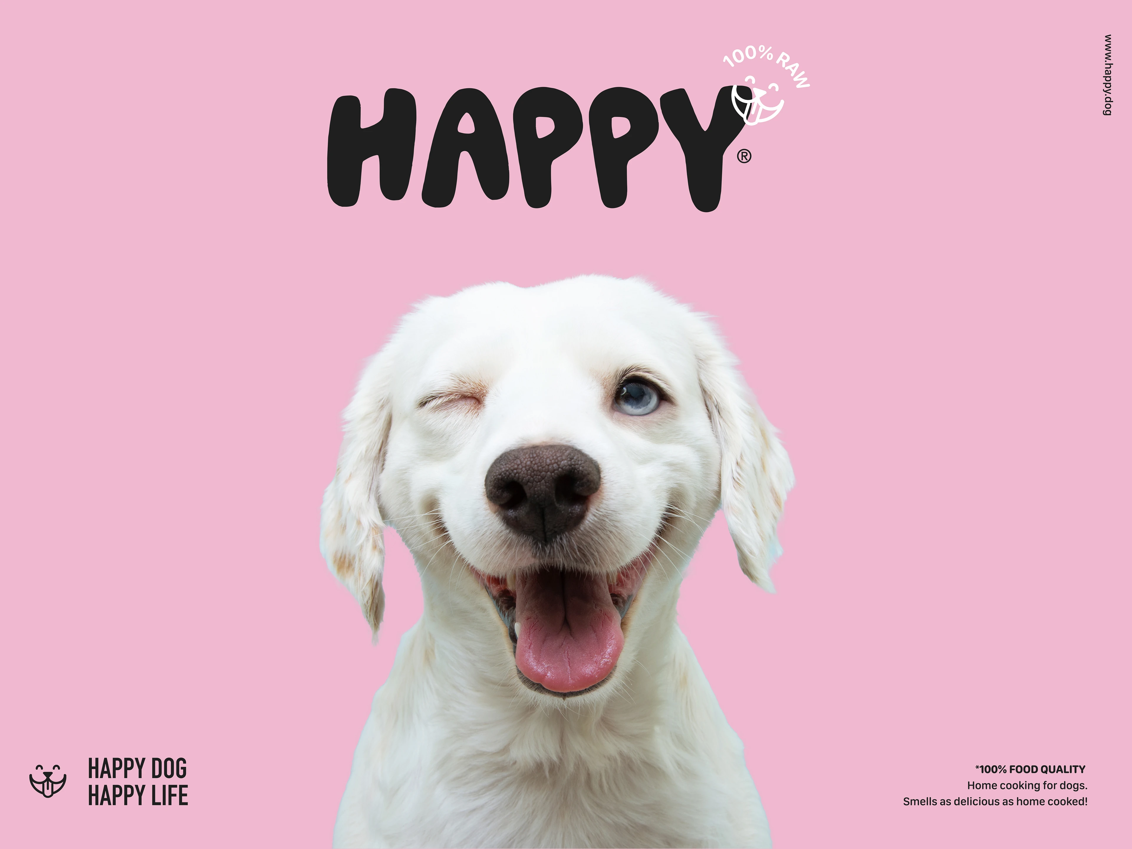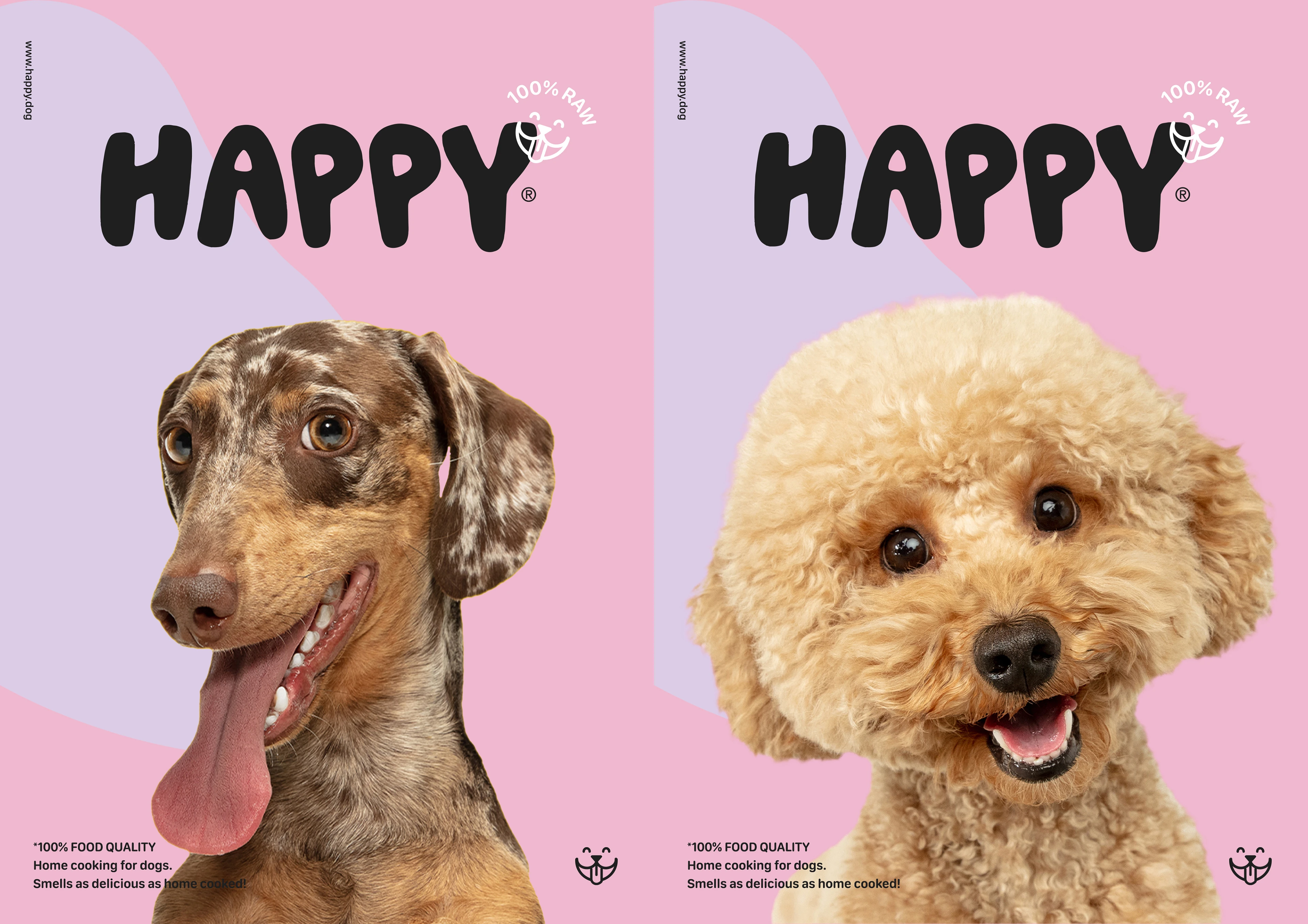 The "HAPPY" project aims to introduce a new line of dog food that boasts 100% raw quality. The branding for this dog food was designed to reflect the joy and happiness that dogs experience while consuming the product. Bright colors, eye-catching photos, and a logo with thick letters emphasize the playful nature of dogs. Design elements were harmonized to create a memorable and coherent visual concept that conveys the pleasure of eating and the bond between dogs and their owners. The goal of "HAPPY" is to establish a brand that provides the best possible nutrition for dogs while simultaneously spreading joy and fun. The branding was conceived to mirror these values and evoke positive feelings in dogs and their owners.