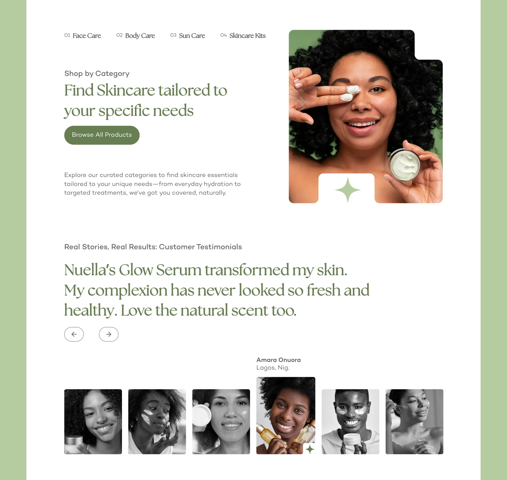 The UI direction leaned into soft, nature-inspired visuals, gentle color palettes, and breathable spacing. Typography and layout choices were intentionally minimal to let the products, ingredients, and messaging take center stage while reinforcing a calm, organic brand identity.