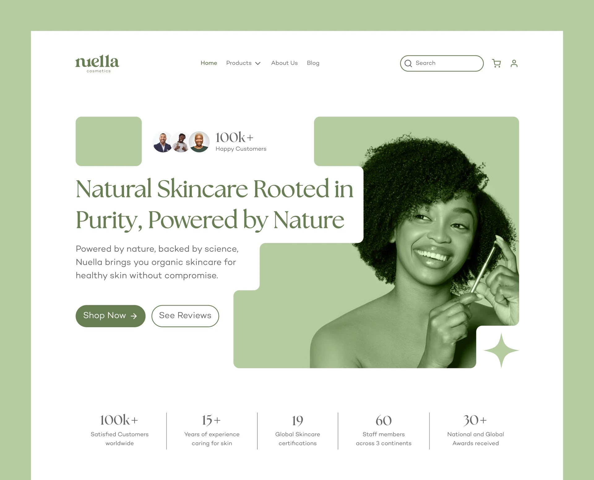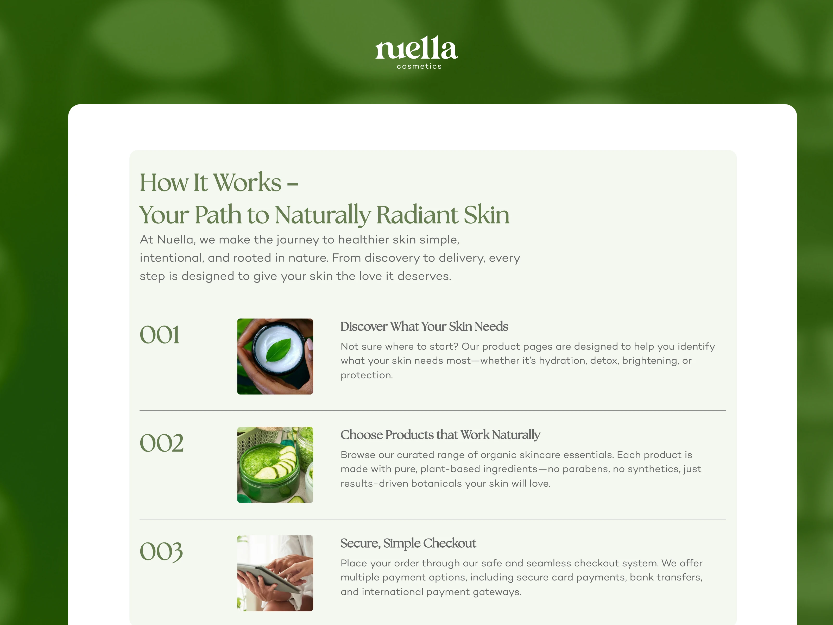 I started by defining a clear user journey that guides visitors from brand discovery to product confidence and purchase. The structure was built around key sections such as Hero, About Nuella, Bestsellers, Ingredients and Science, How It Works, Testimonials, and FAQs.