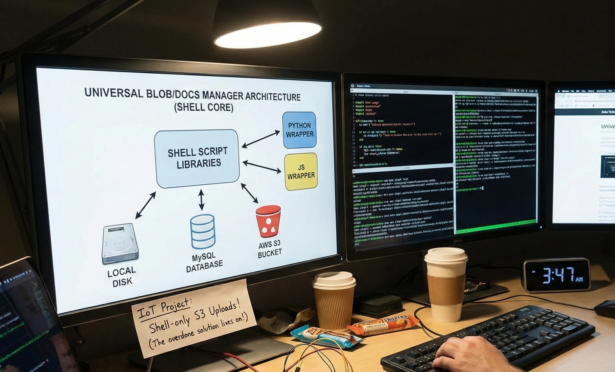 This library was the result of a happy misunderstanding a couple of years back. I was given a take-home assignment to develop a "modern language-agnostic library to manage blob storage across local disk, MySQL, and AWS S3." The actual requirement was likely to just build a standard file-manager library in any modern language, but I interpreted "language-agnostic" literally: I decided to design and develop a low-level library that sits at the system level, usable by any modern programming language.