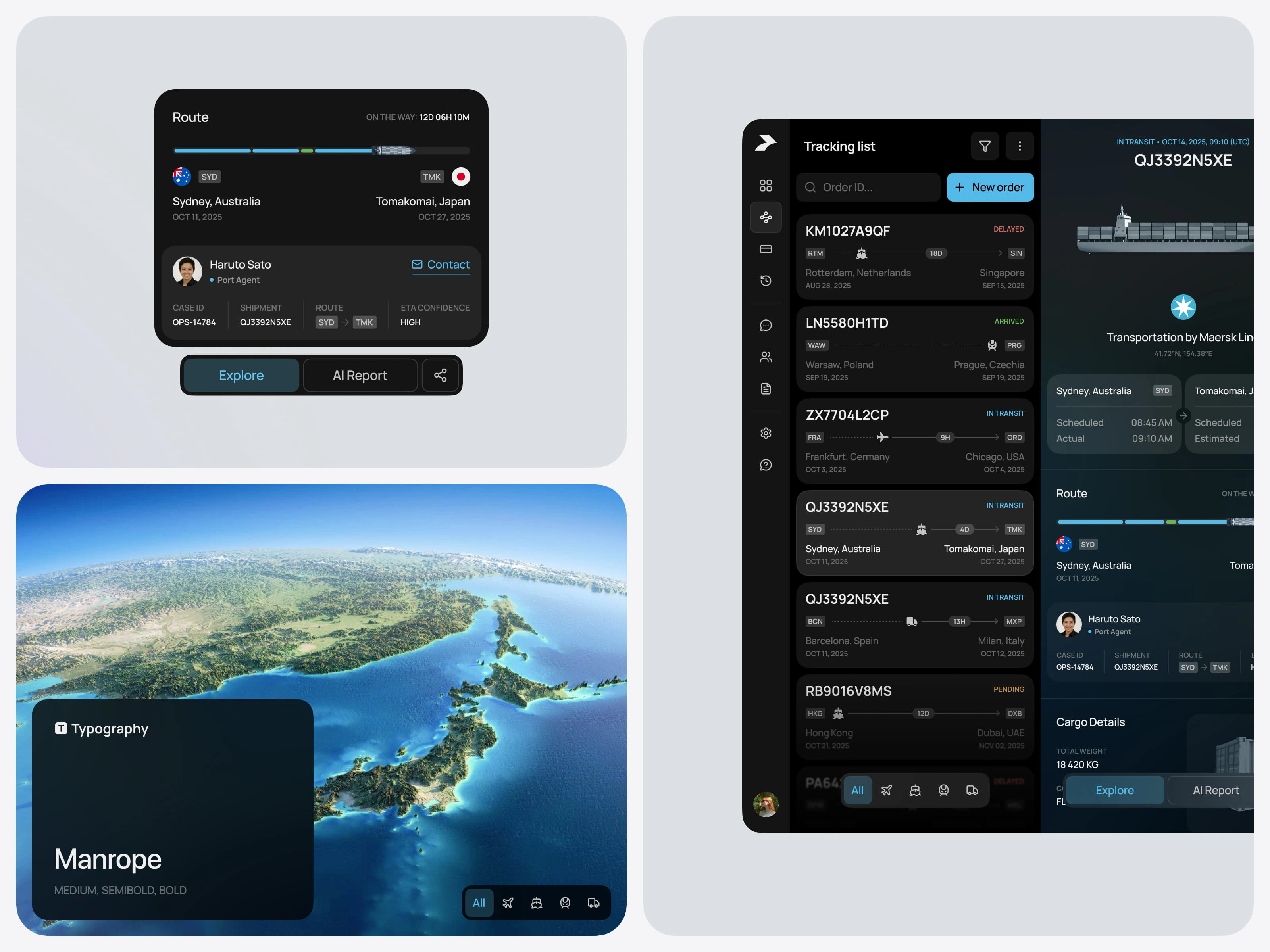 A dark UI with high-contrast data layers helps logistics teams monitor delays, review cargo details, and act quickly on changes. Interactive maps and structured tracking cards turn complex supply chain data into a clear, actionable experience.