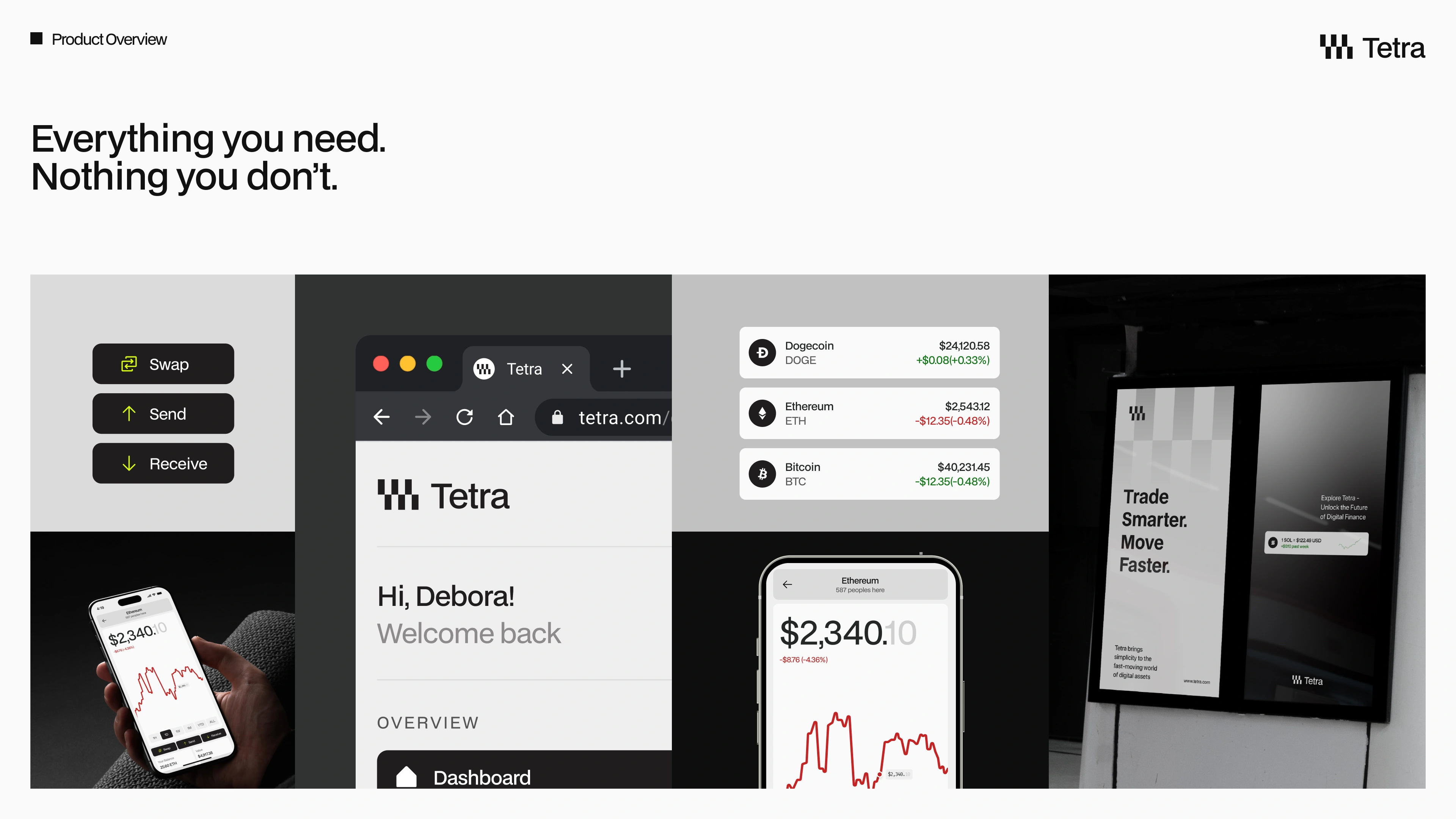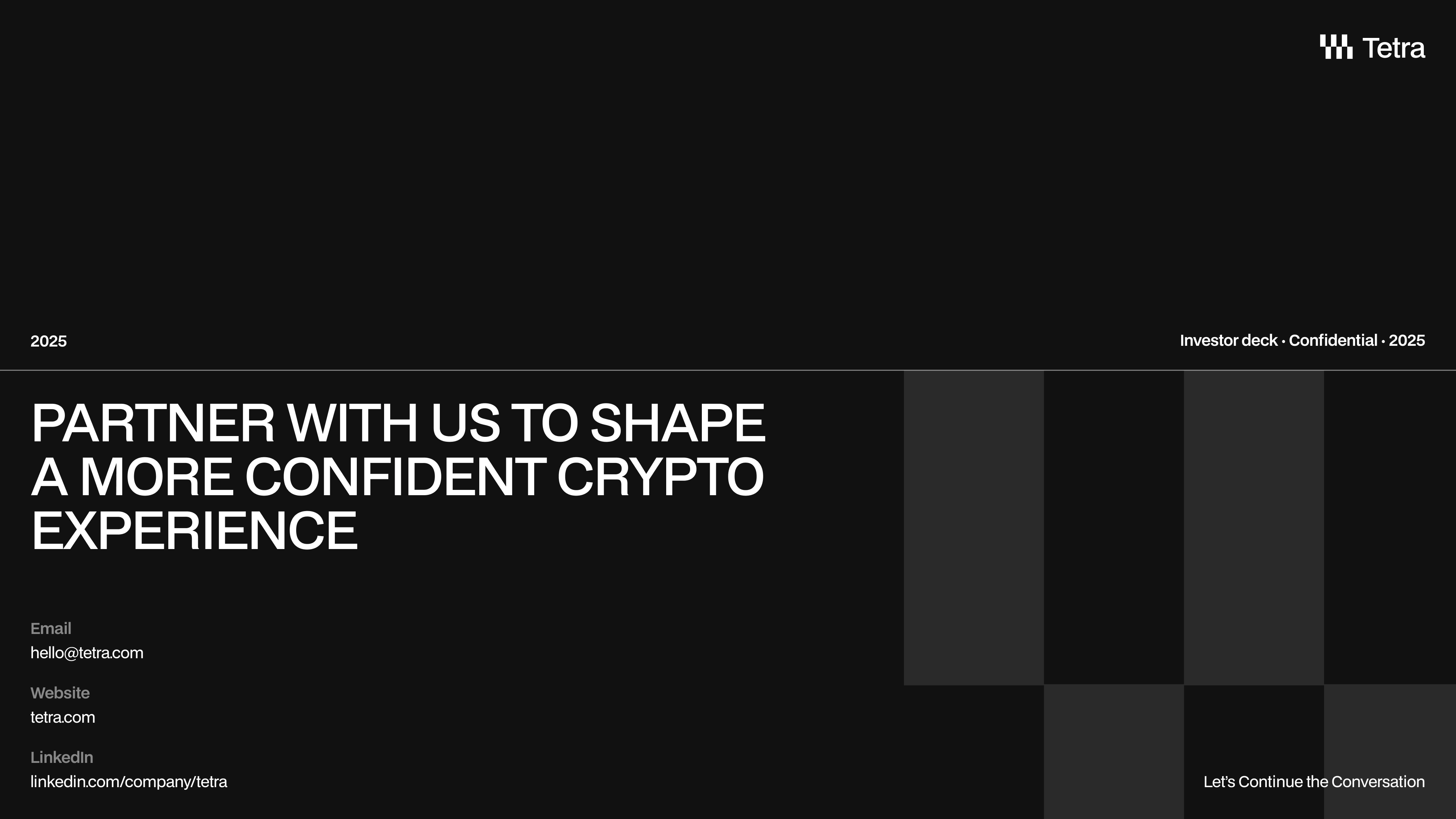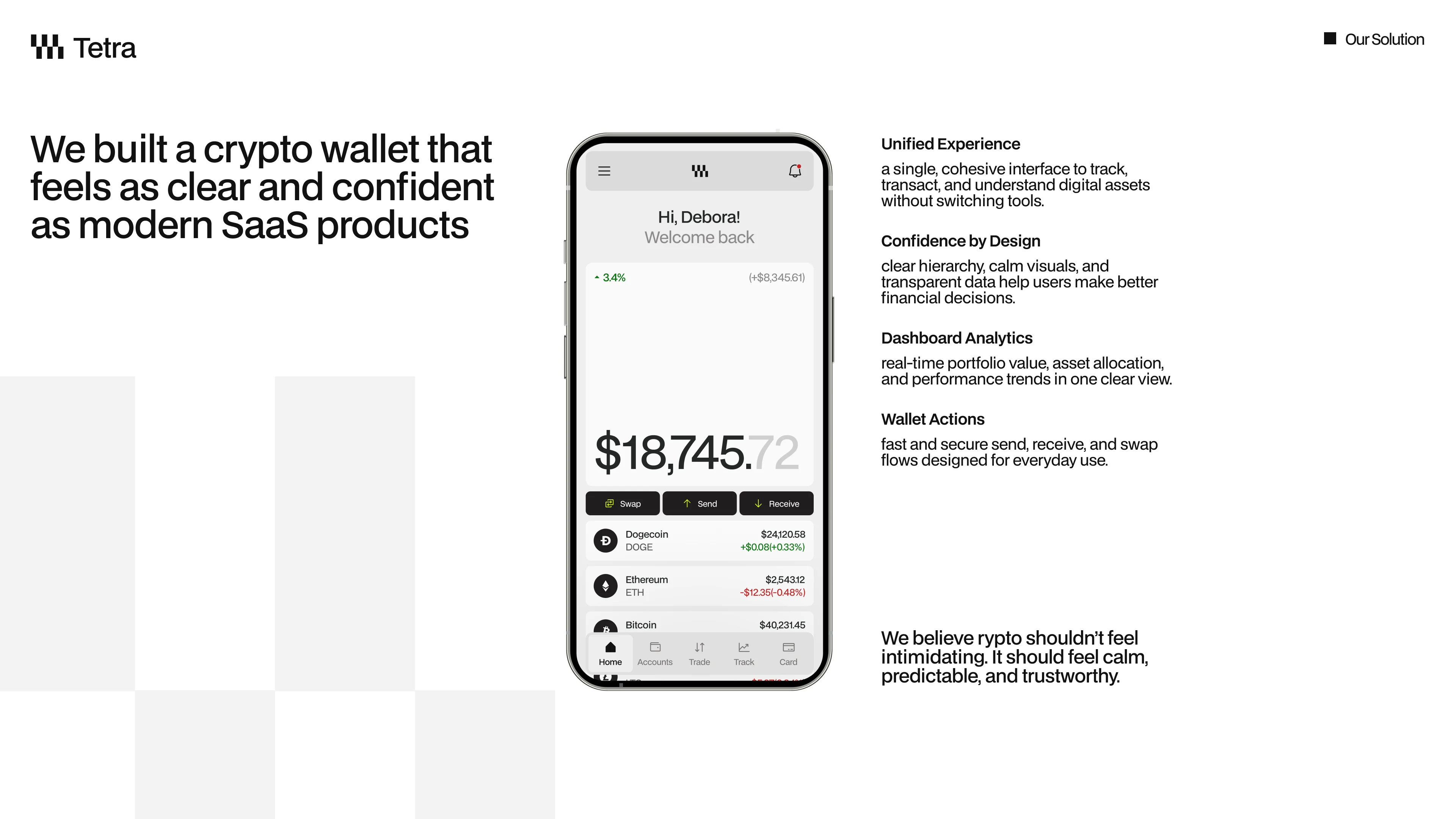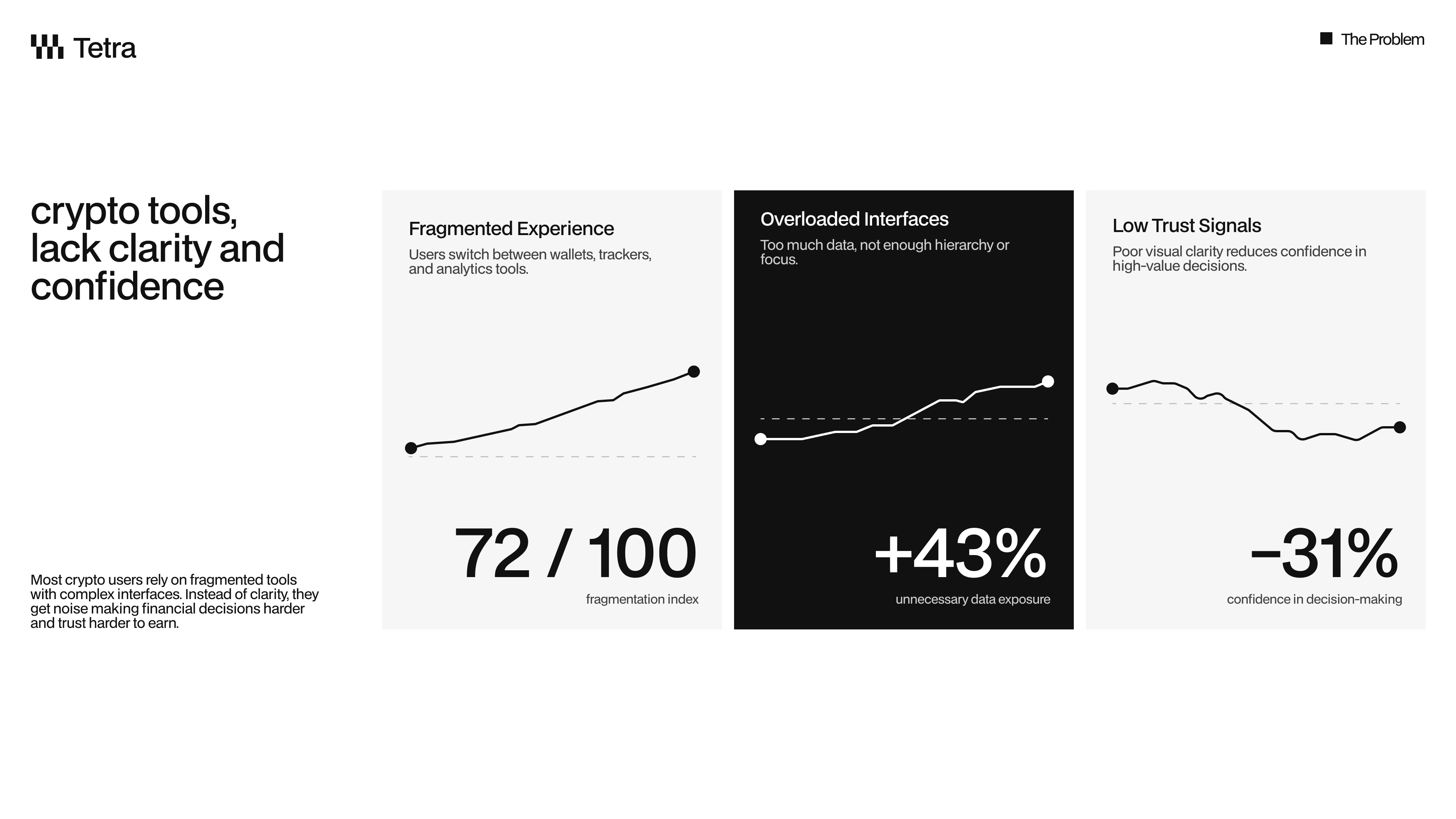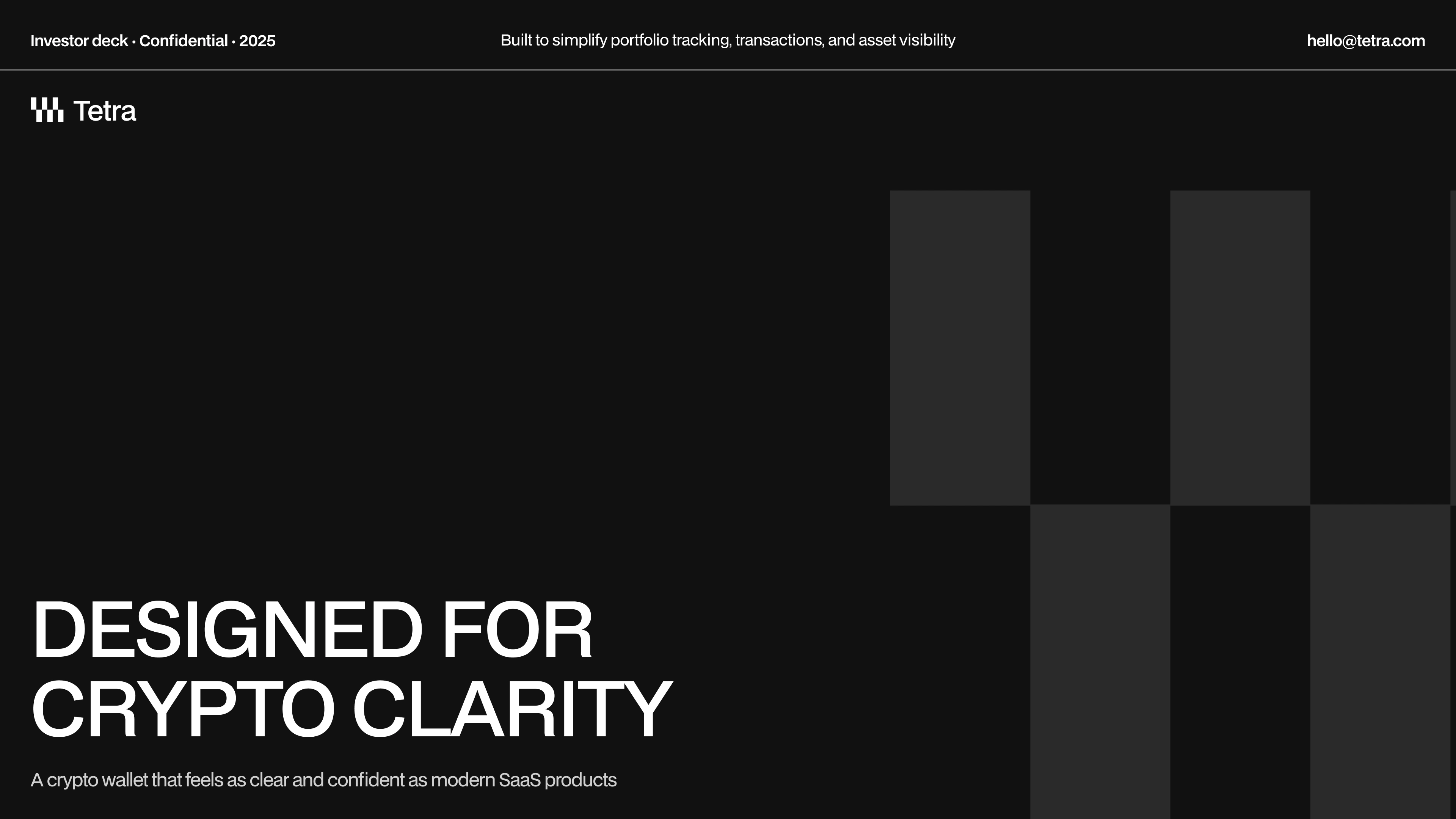 The pitch deck explain how Tetra presents a bold, minimalist crypto wallet to investors, combining product vision, UI clarity, and structured storytelling into a concise presentation format. The deck uses high-contrast layouts, strong typographic hierarchy, and modular grids to guide viewers through the problem, solution, and value proposition. Each slide is designed to stand alone while maintaining a cohesive narrative flow.