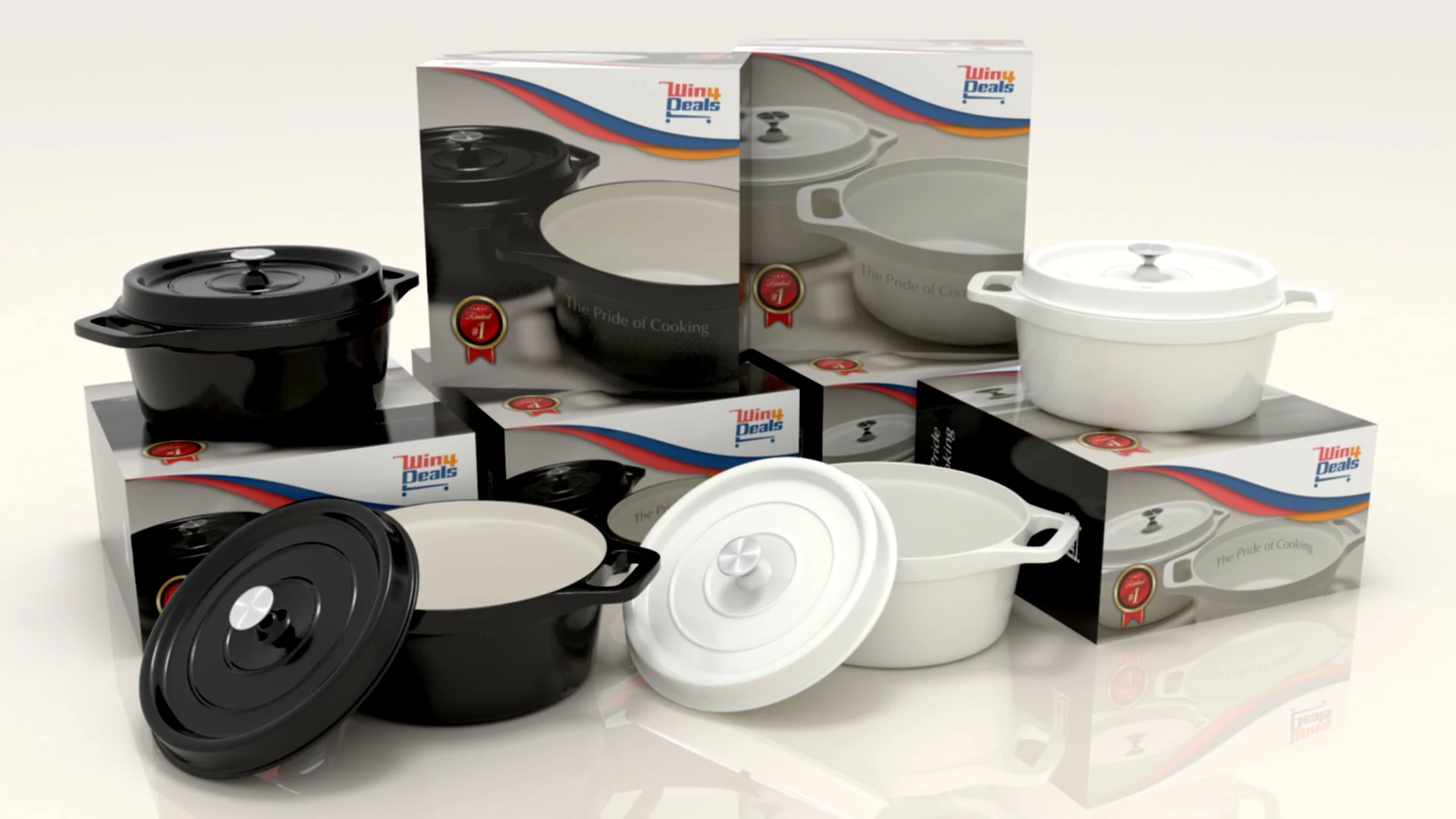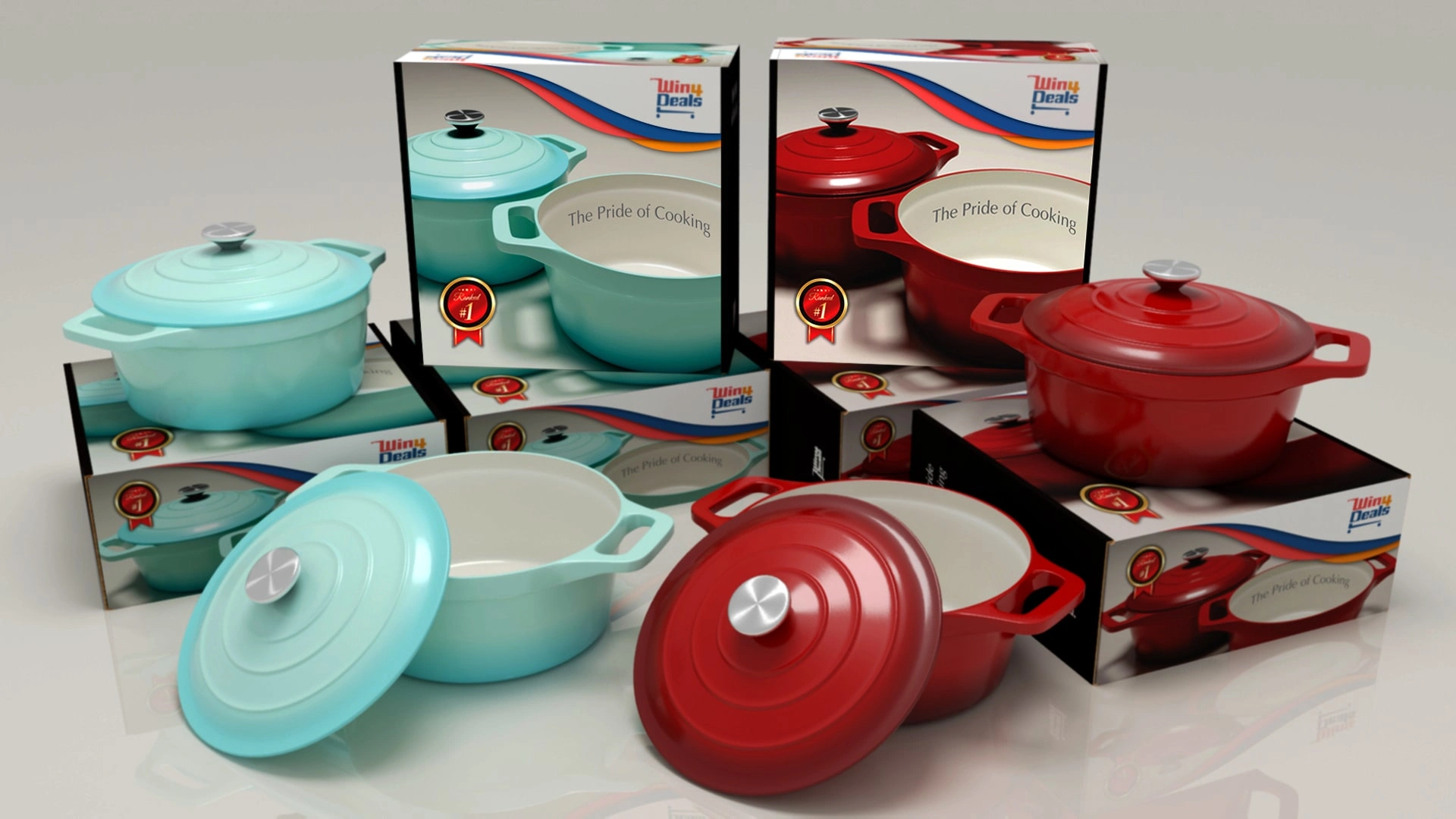 I designed the brand identity for Win 4 Deals, an e-commerce business specializing in premium cookware on Amazon. The logo features a custom-lettered wordmark cleverly shaped into a shopping trolley, immediately communicating the brand’s retail nature. This unique silhouette was designed for high memorability, ensuring the brand stands out to both casual browsers and serious buyers. To further elevate the brand's presentation, I utilized 3D modeling and rendering to create high-fidelity visualizations of their Dutch cookware, which were then integrated directly into the final packaging design.
