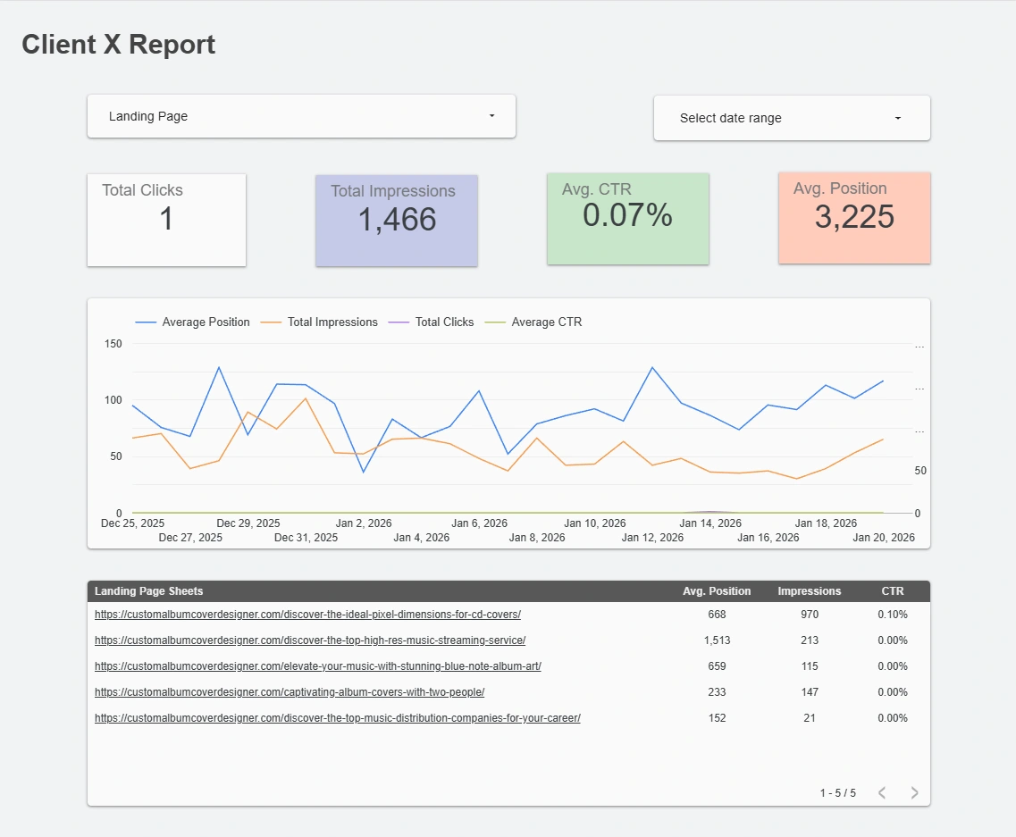 Centralized SEO dashboard blending GSC & Sheets data. A scalable template for multi-site monitoring and client reporting. Unified visibility in one place