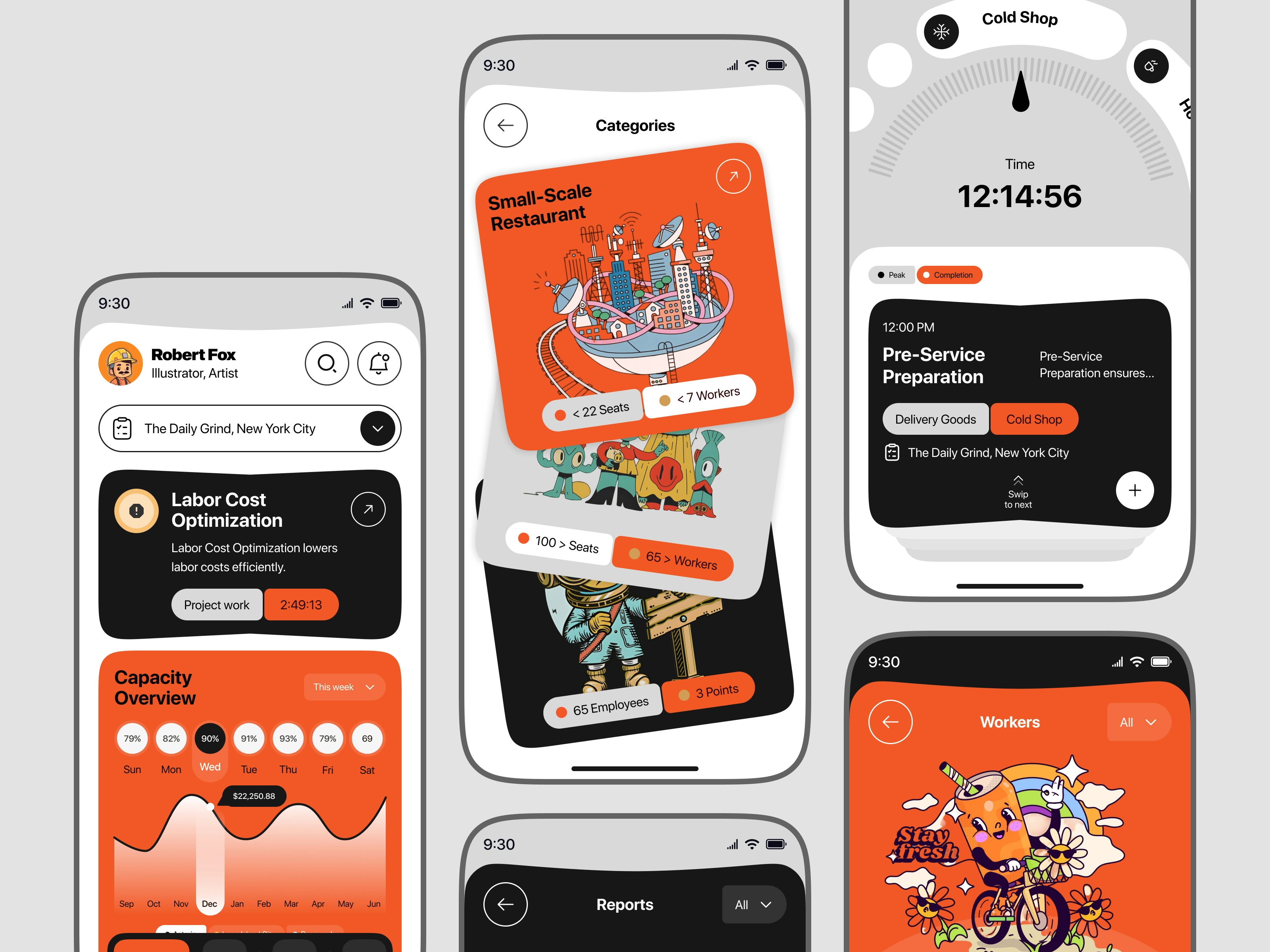 This concept explores a smart restaurant management mobile app designed to streamline daily operations, optimize labor costs, and improve workforce efficiency. The interface focuses on real-time insights such as staff capacity, task scheduling, operational stages, and performance analytics—helping restaurant owners make faster, data-driven decisions.