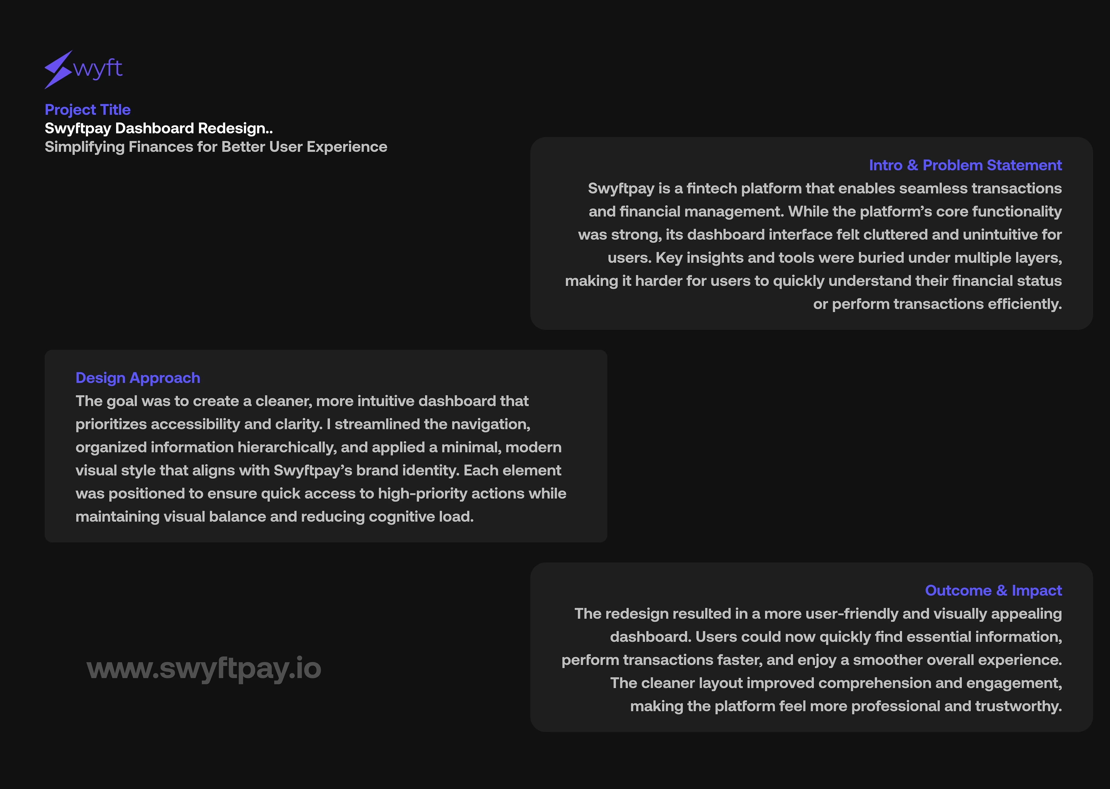 Redesigned Swyftpay’s dashboard into a cleaner, intuitive interface, making financial insights and transactions faster and easier to access.