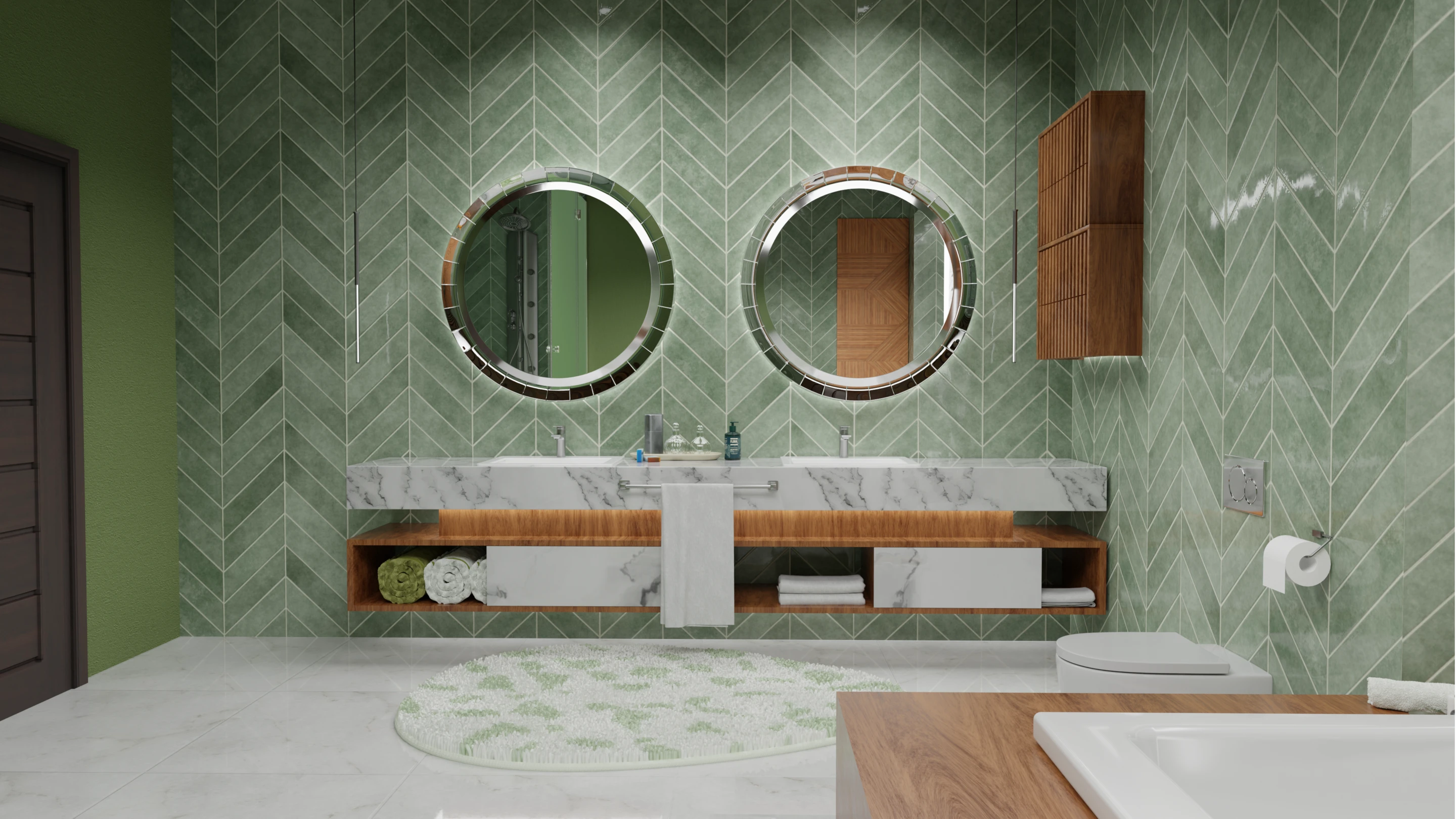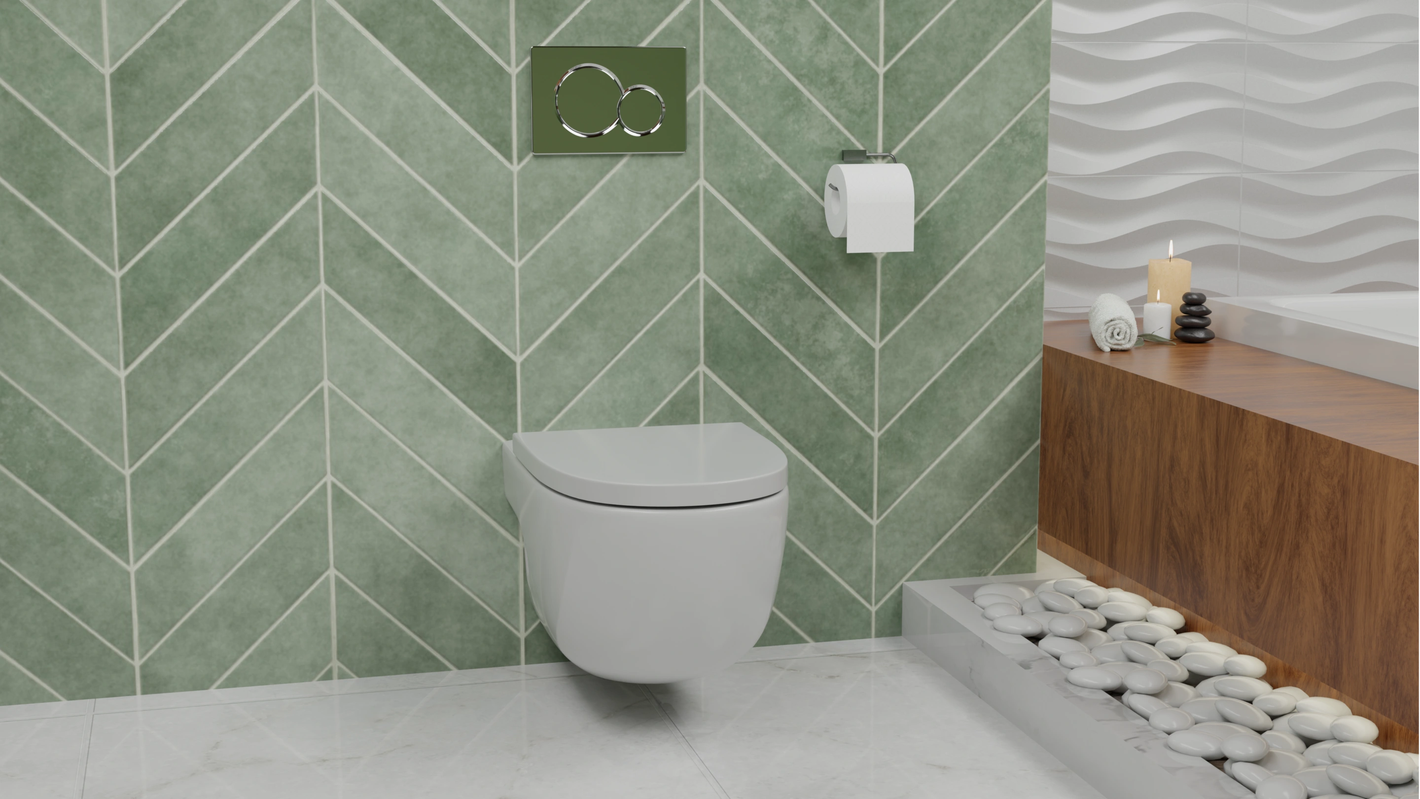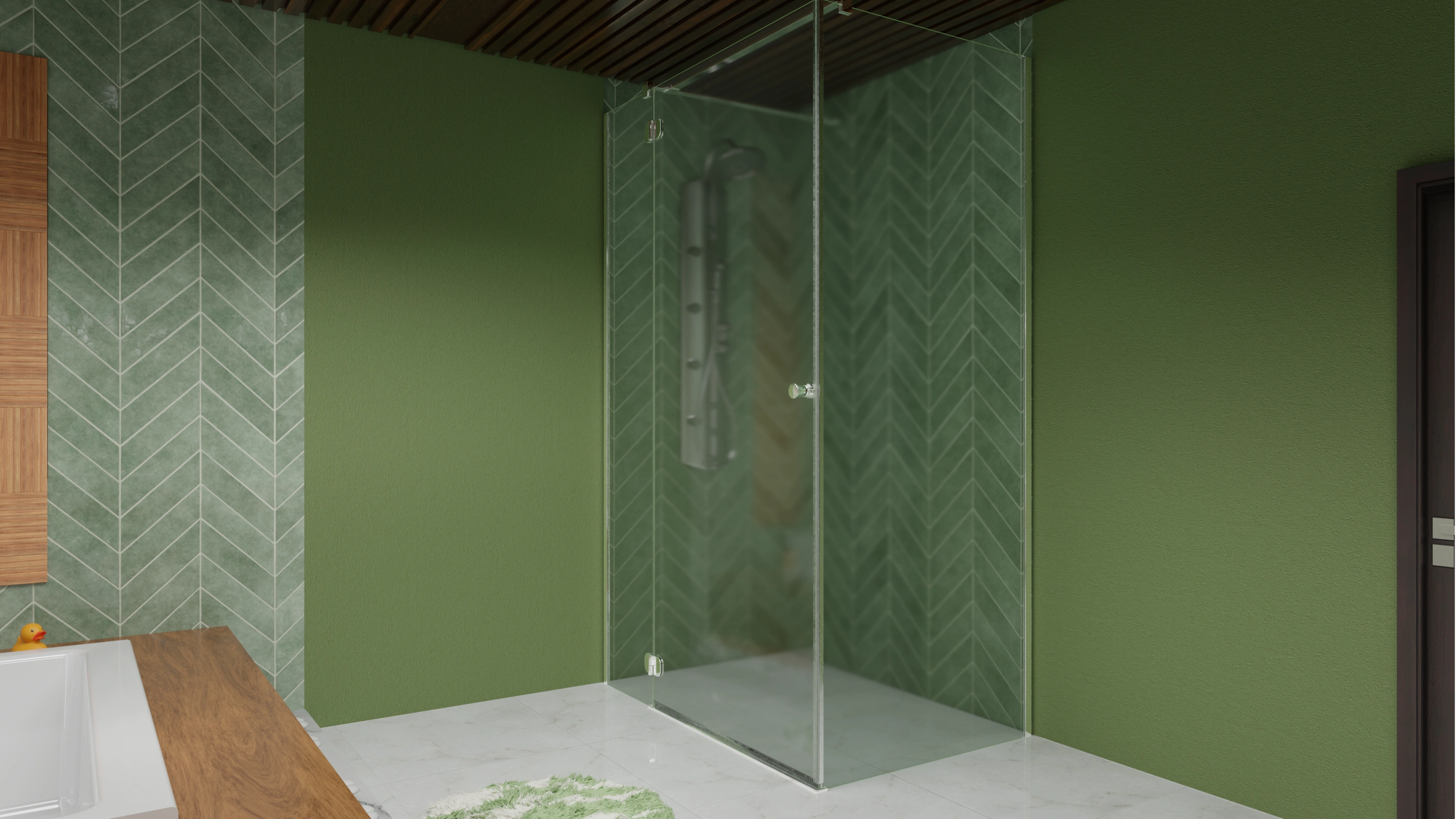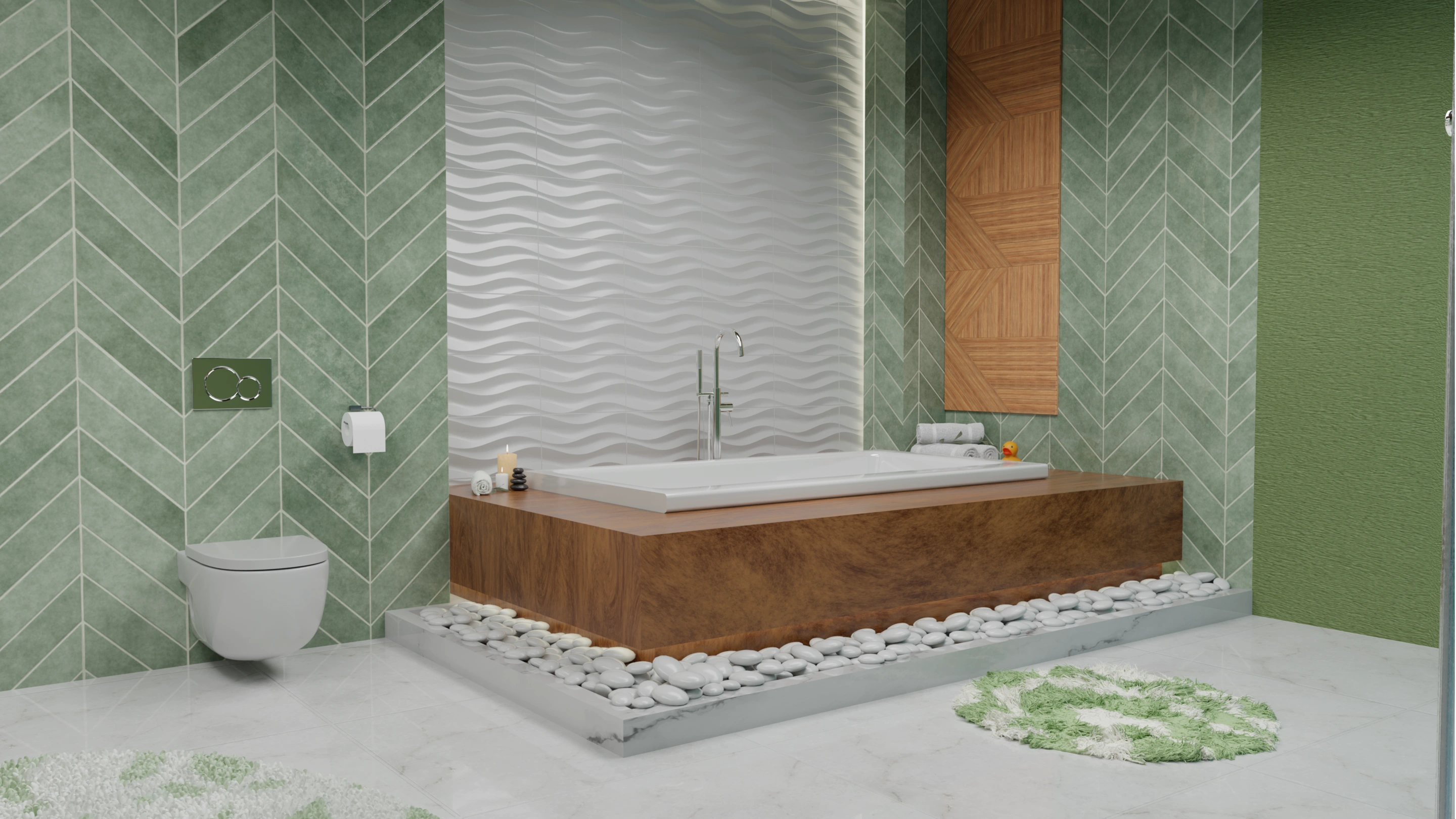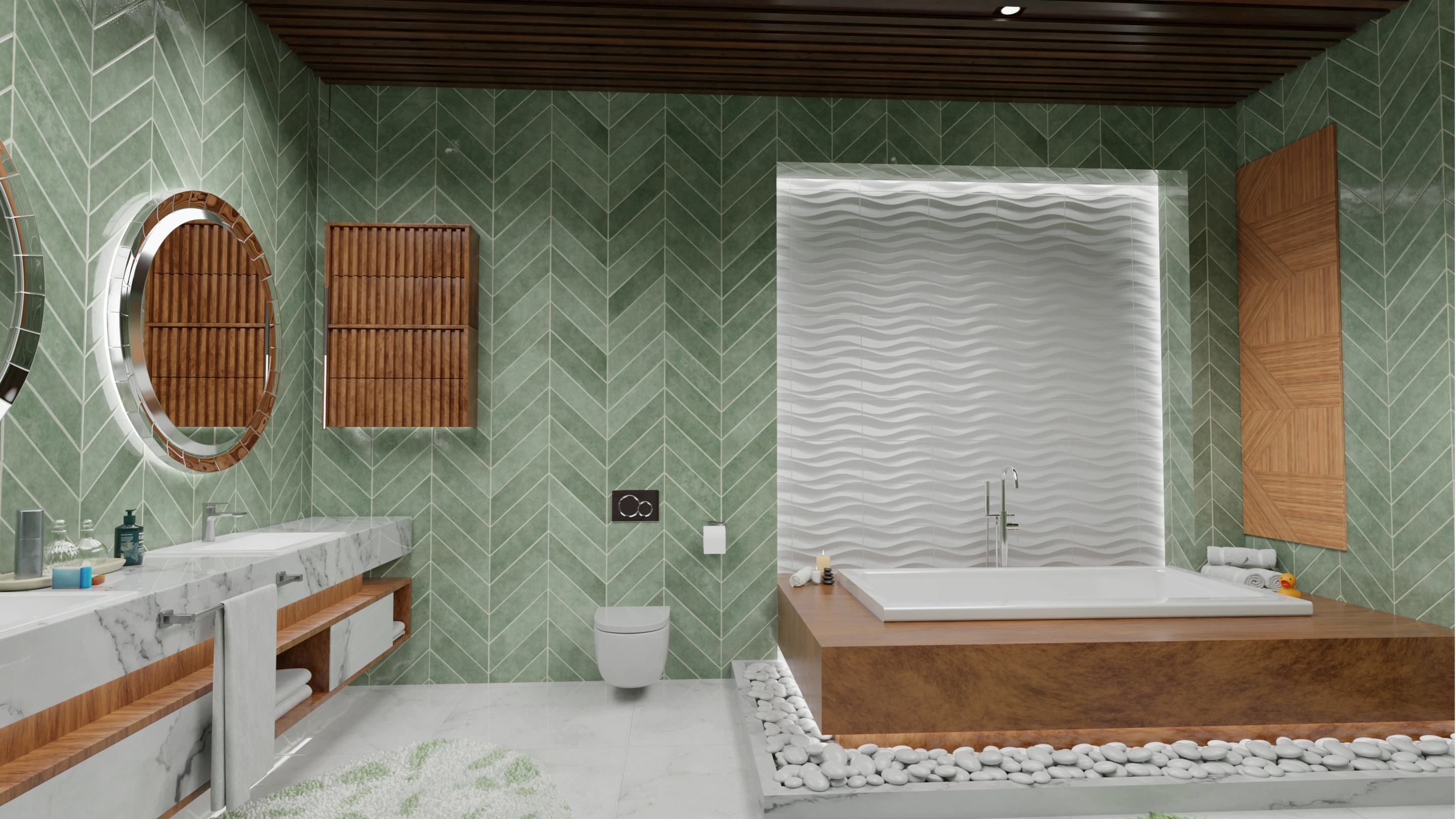This bathroom concept embraces a balance of minimalism and warmth. The design highlights green herringbone wall tiles, natural wood accents, and stone textures to create a spa-like atmosphere at home.