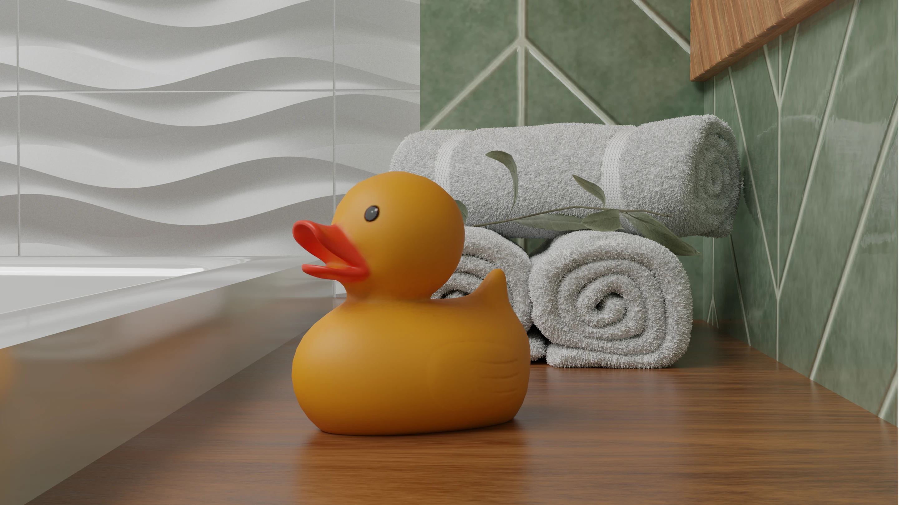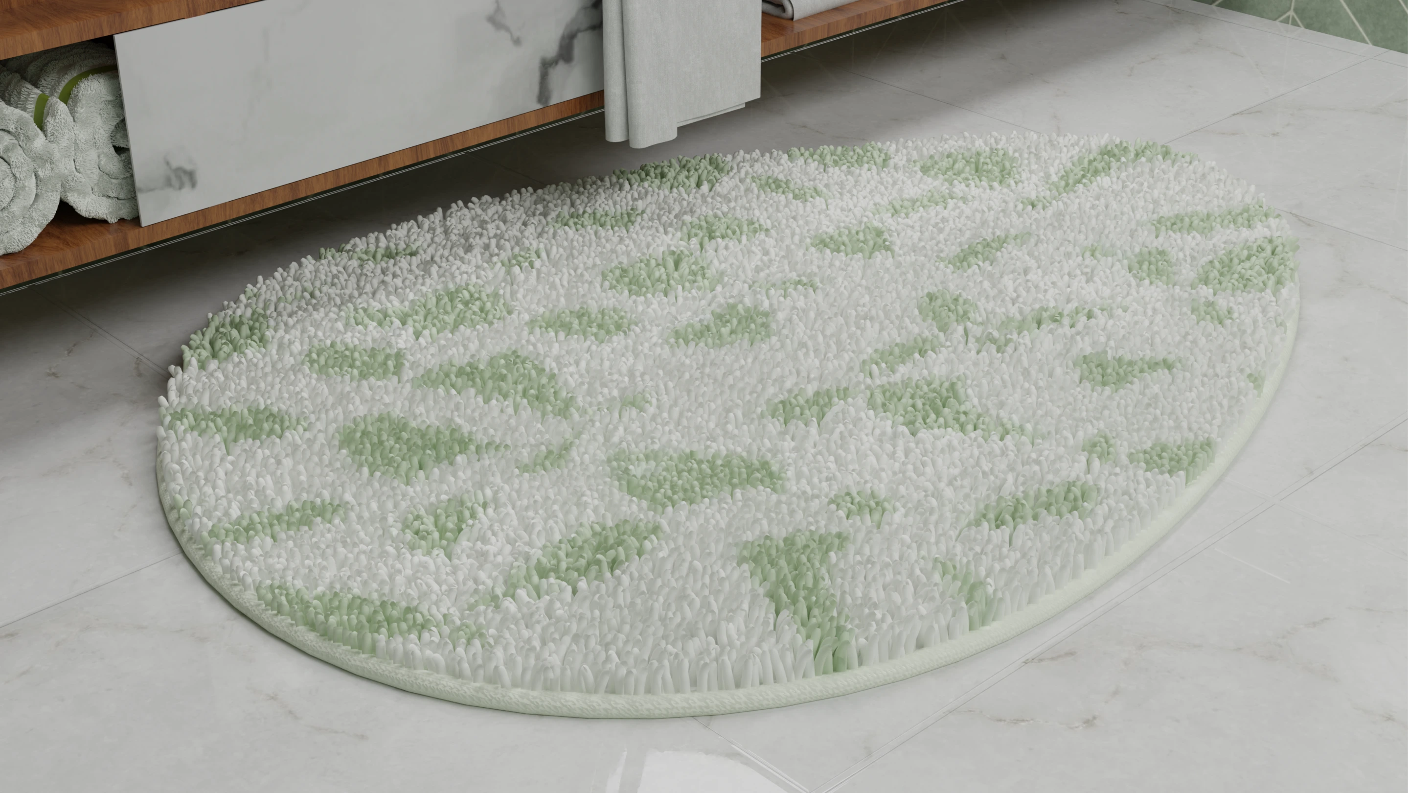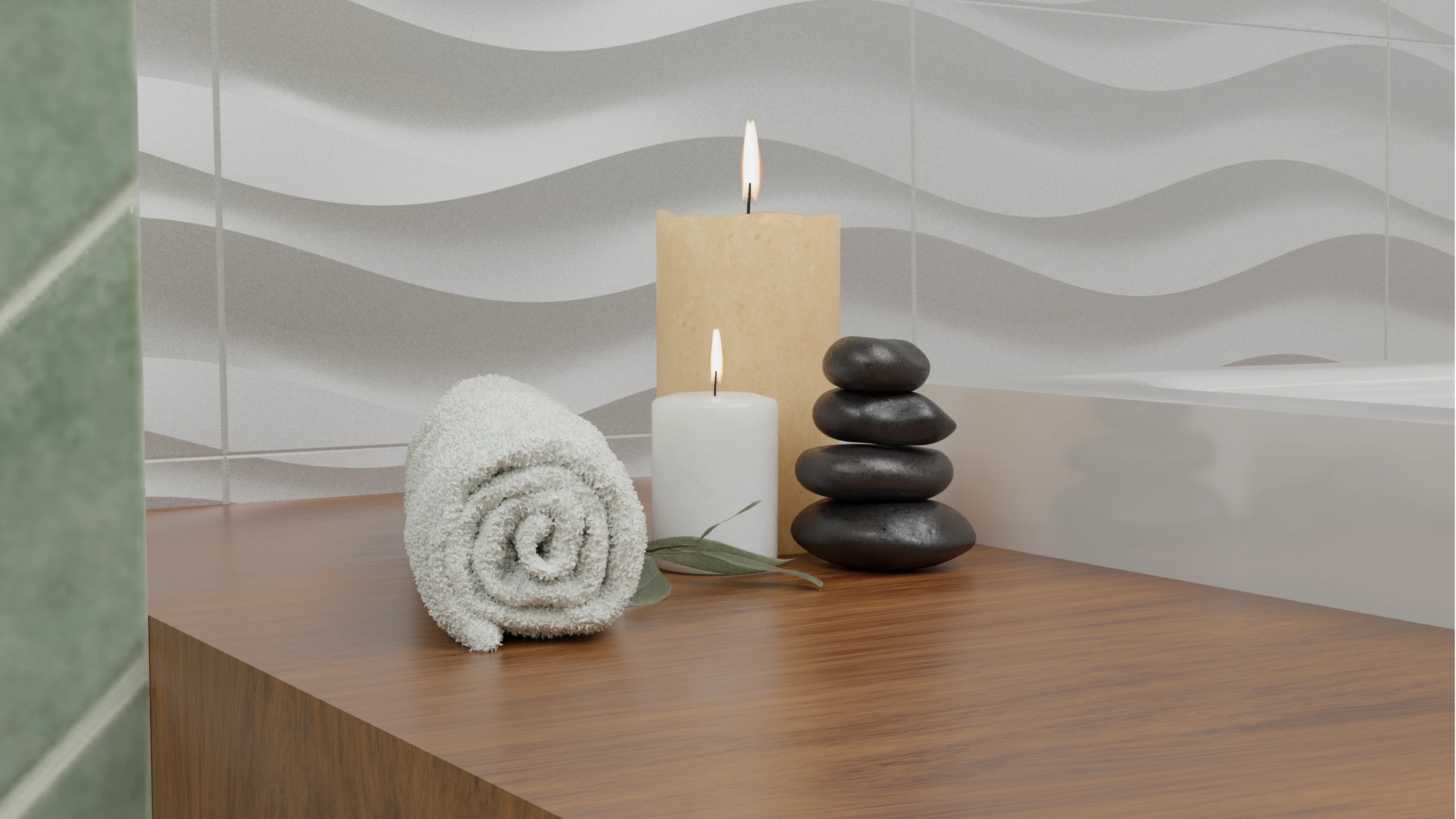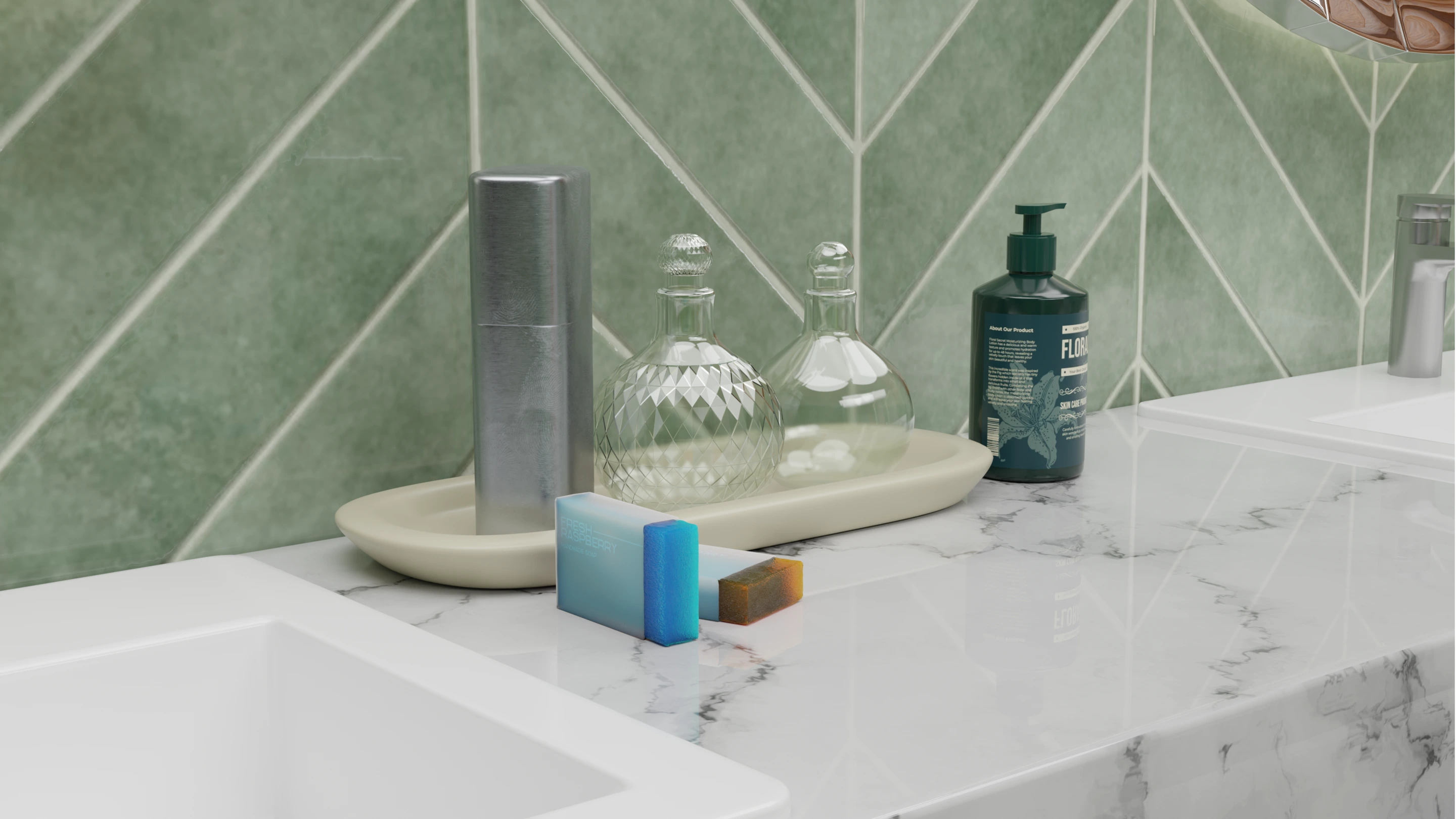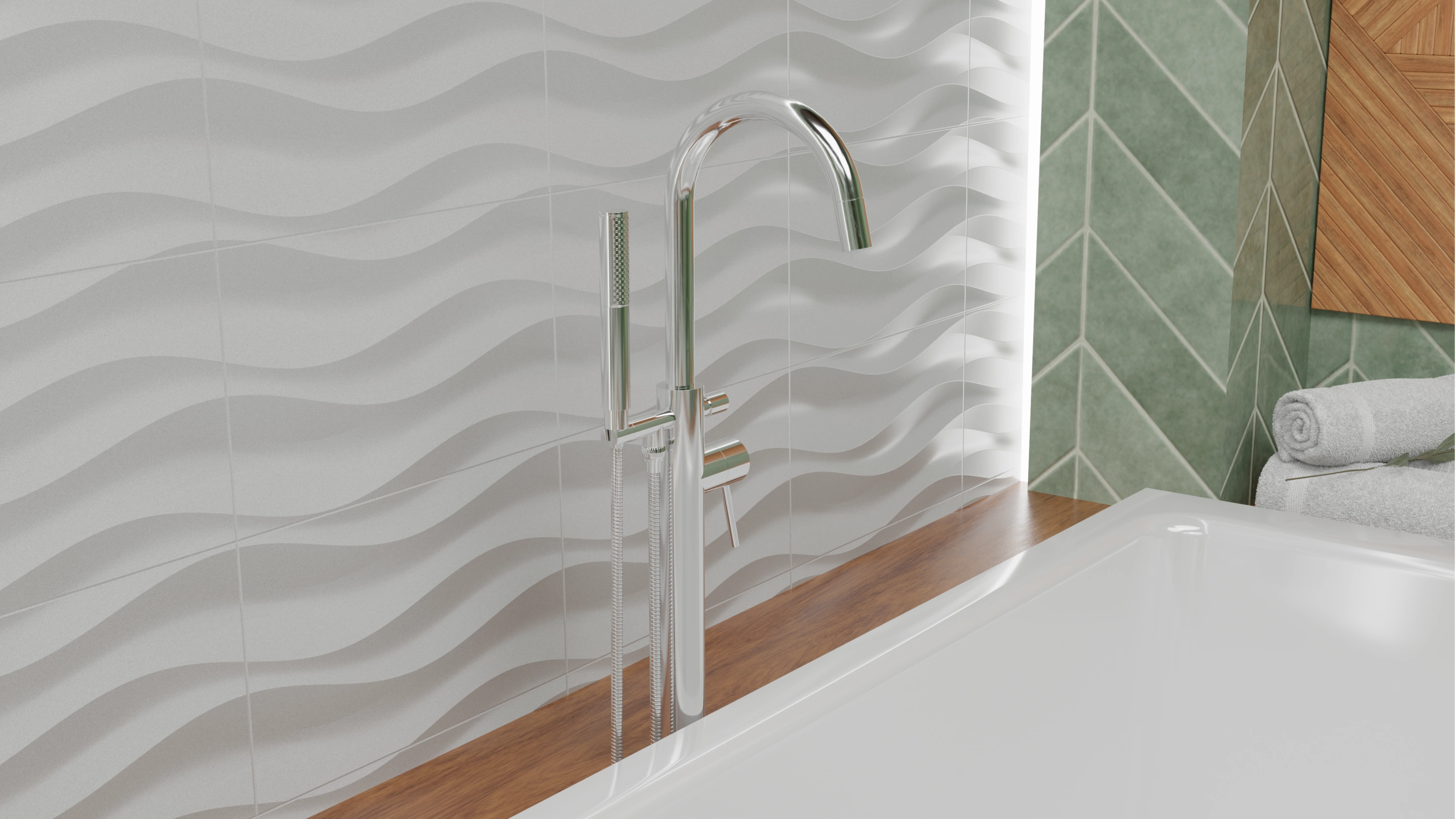 This bathroom concept embraces a balance of minimalism and warmth. The design highlights green herringbone wall tiles, natural wood accents, and stone textures to create a spa-like atmosphere at home.