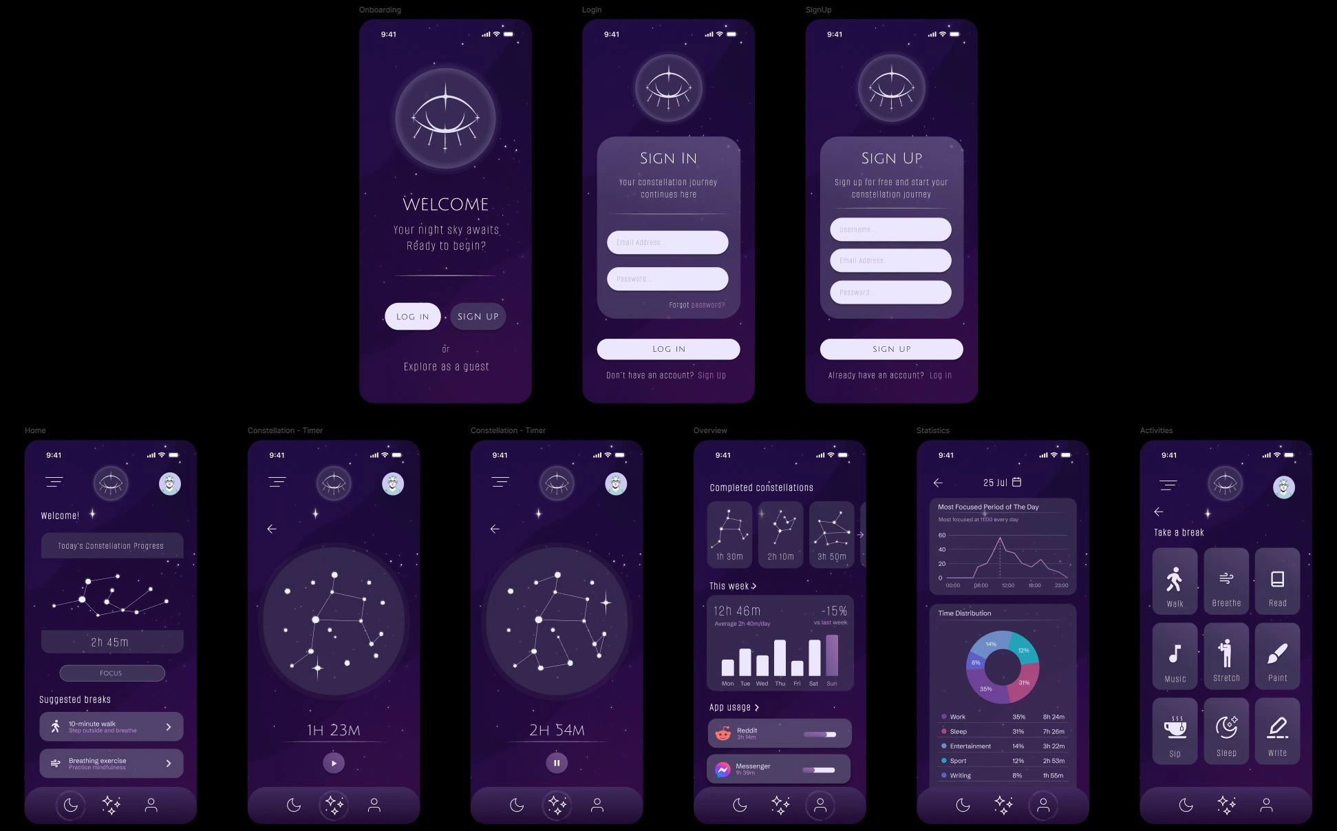 Designed a wellness app to reduce screen time and social media use, through calm focused sessions which grow your constellation.
