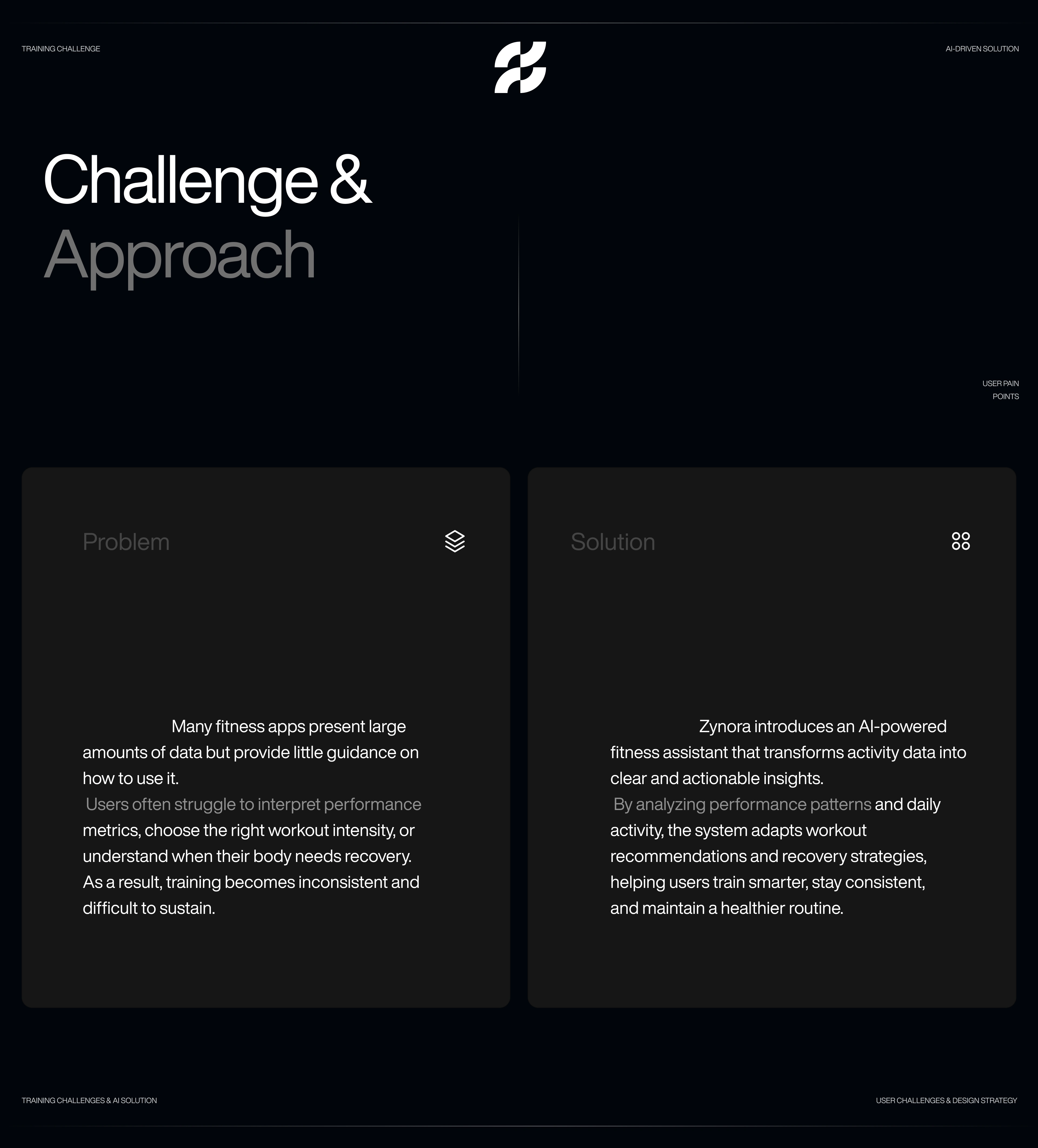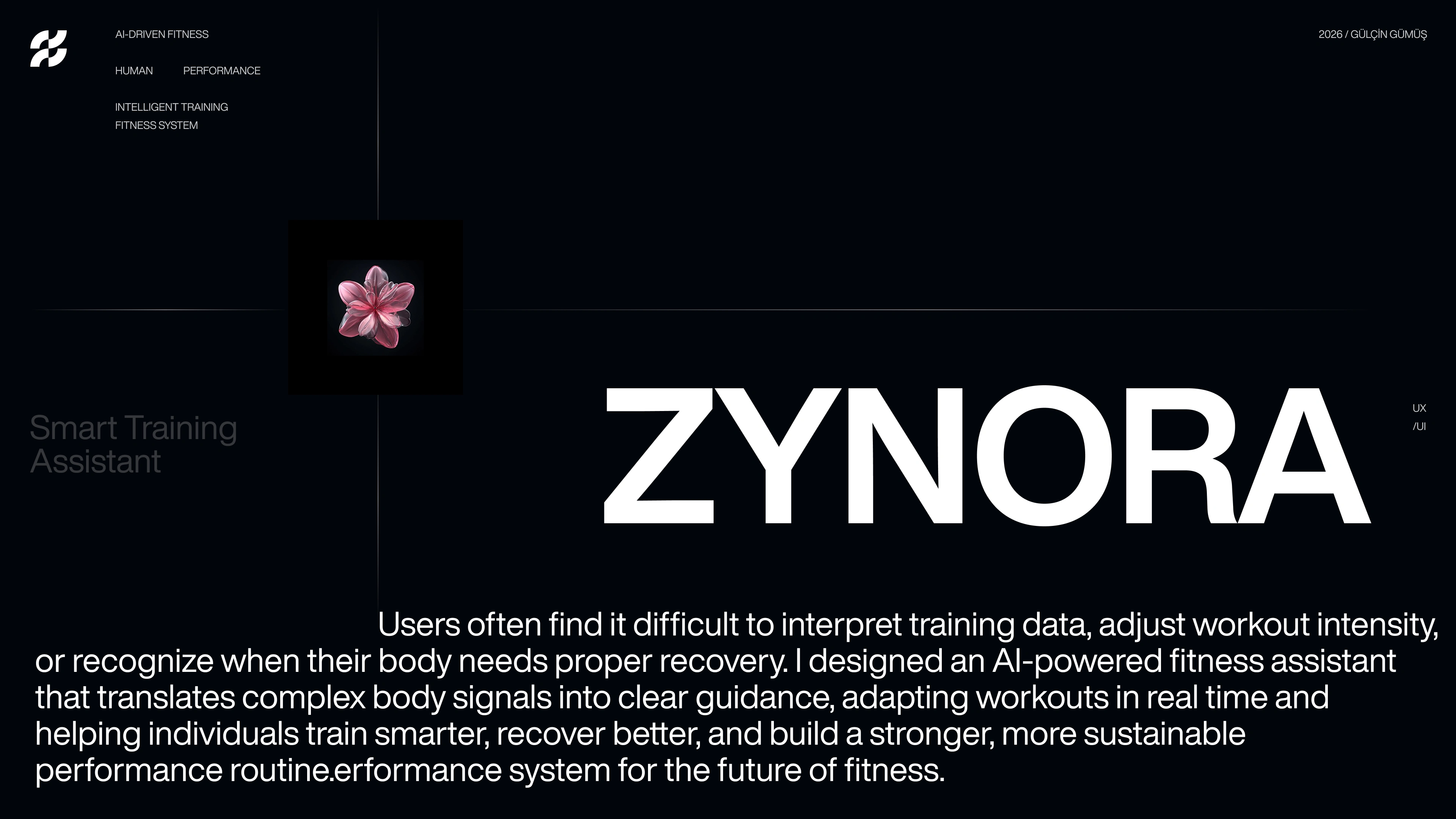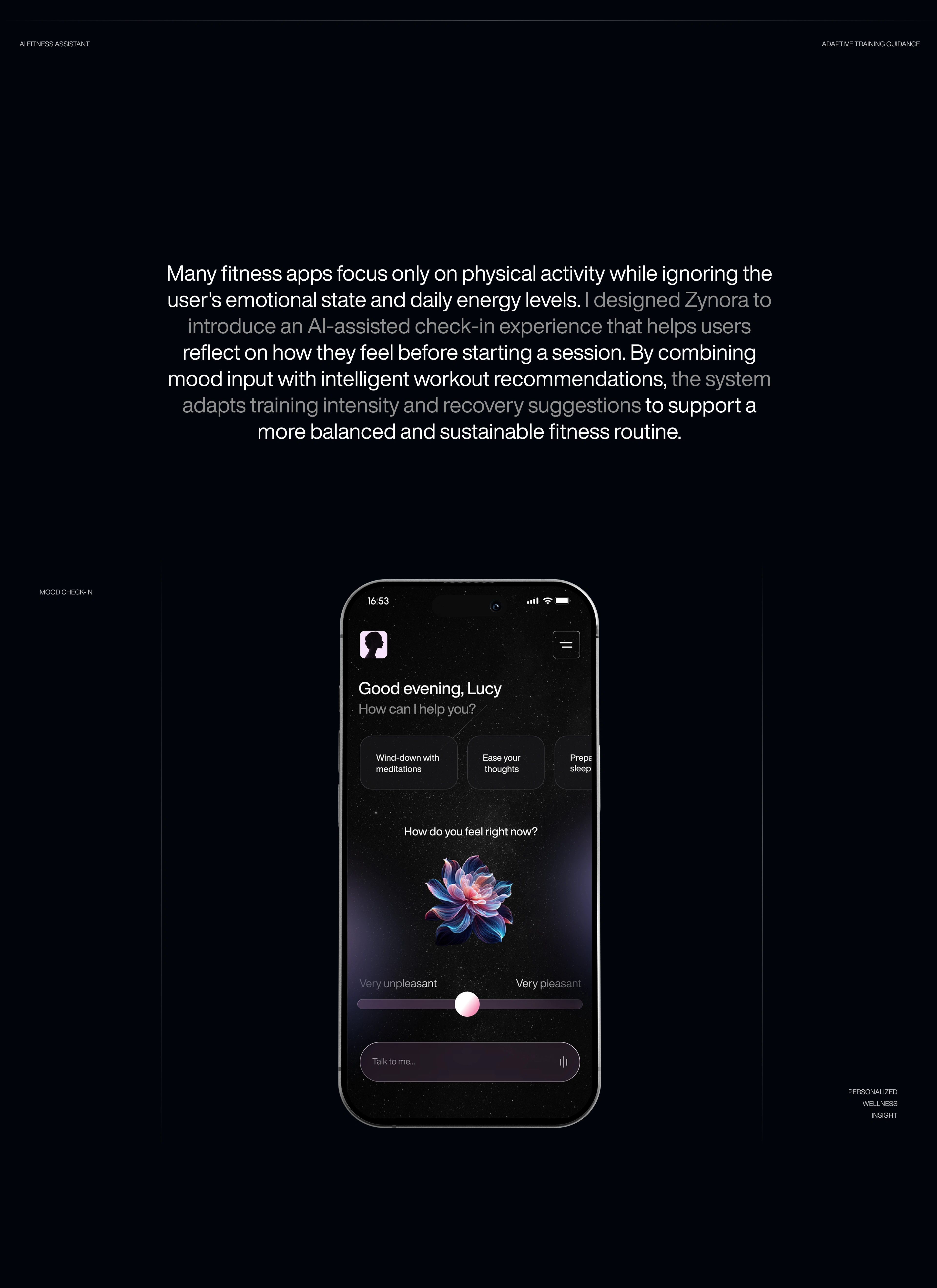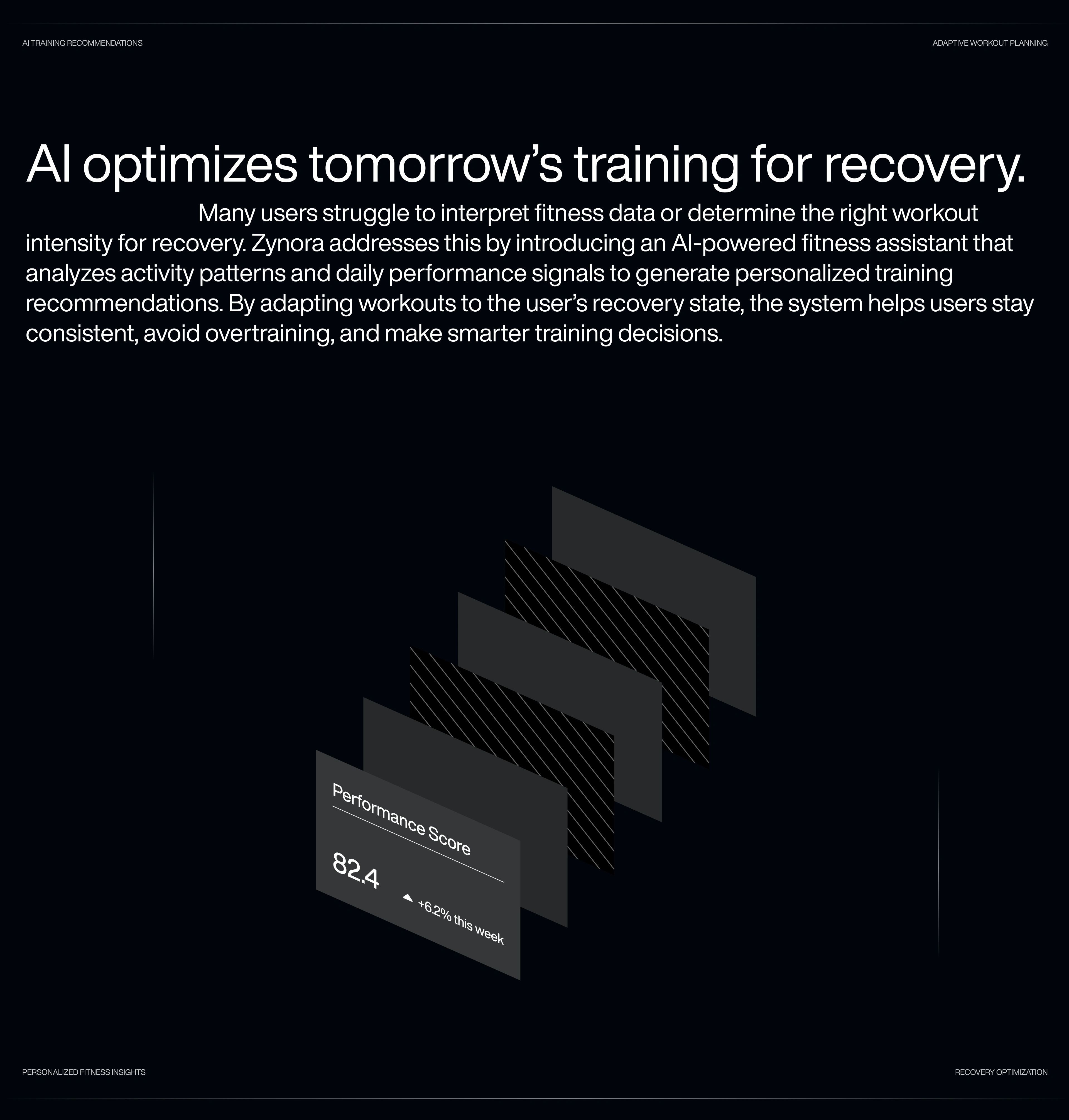 Zynora is an AI-powered fitness assistant designed to help users make smarter training decisions through real-time data interpretation. The goal was to simplify complex body signals and translate them into clear, actionable guidance — enabling users to train efficiently, recover properly, and maintain long-term performance.