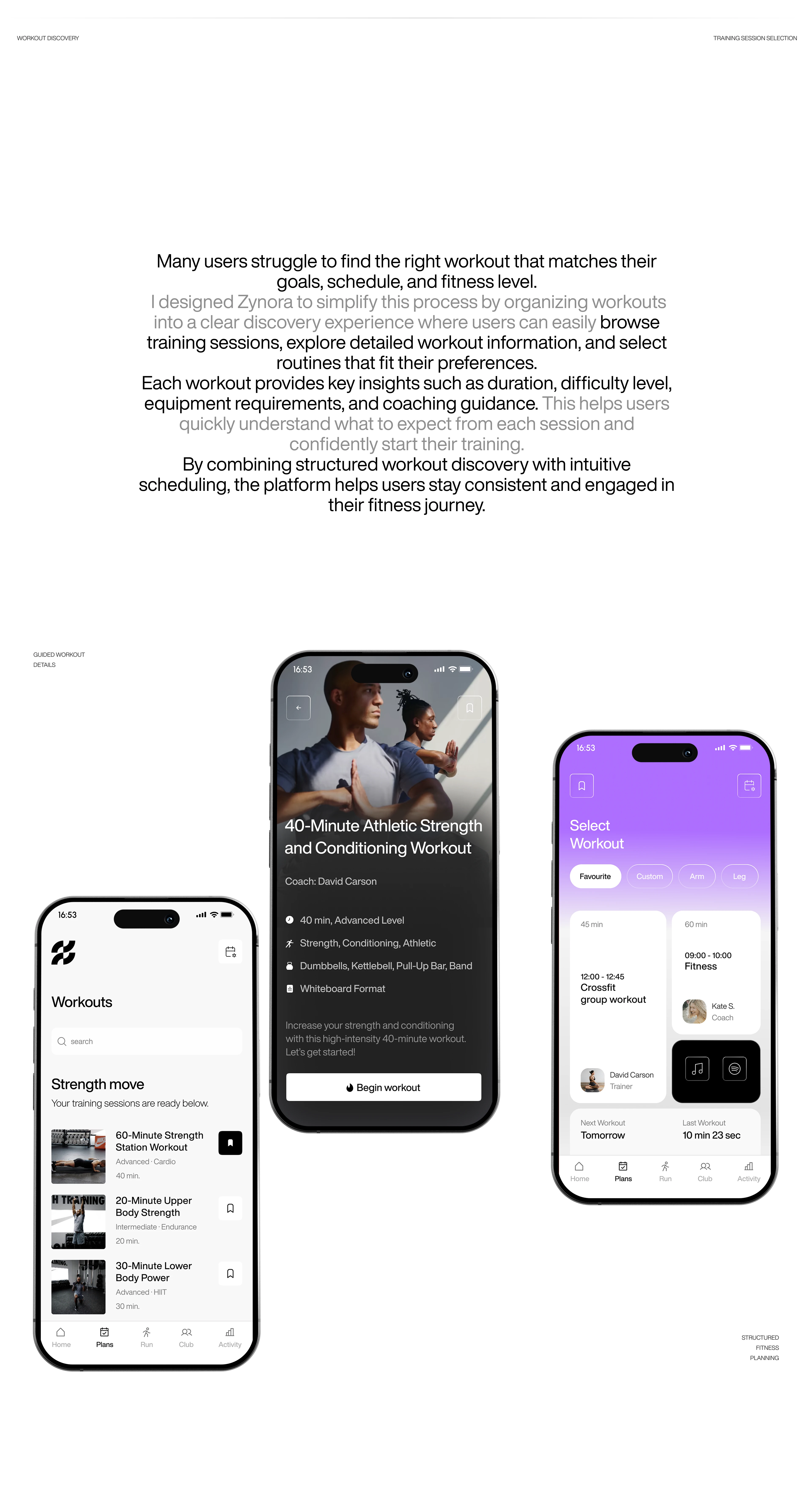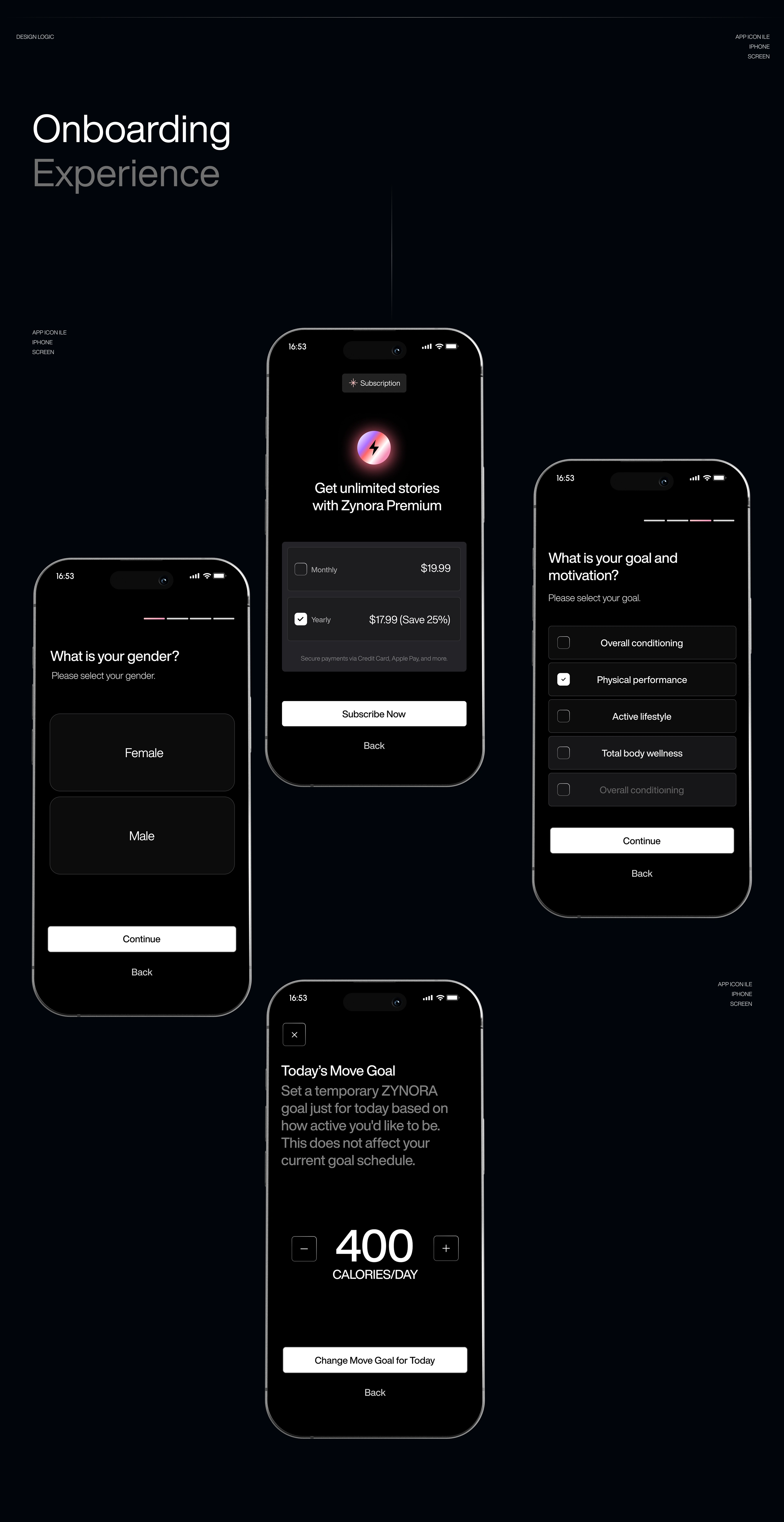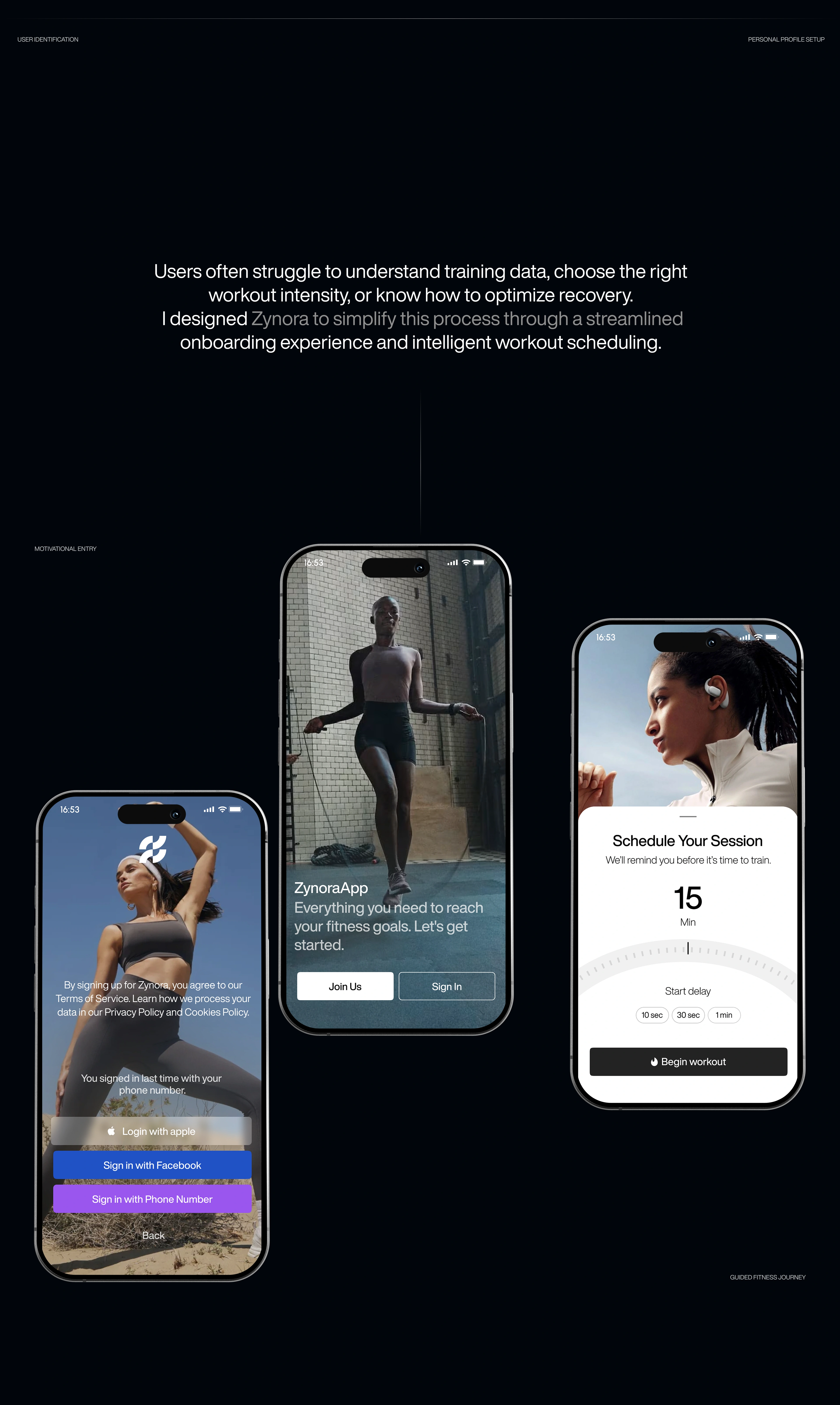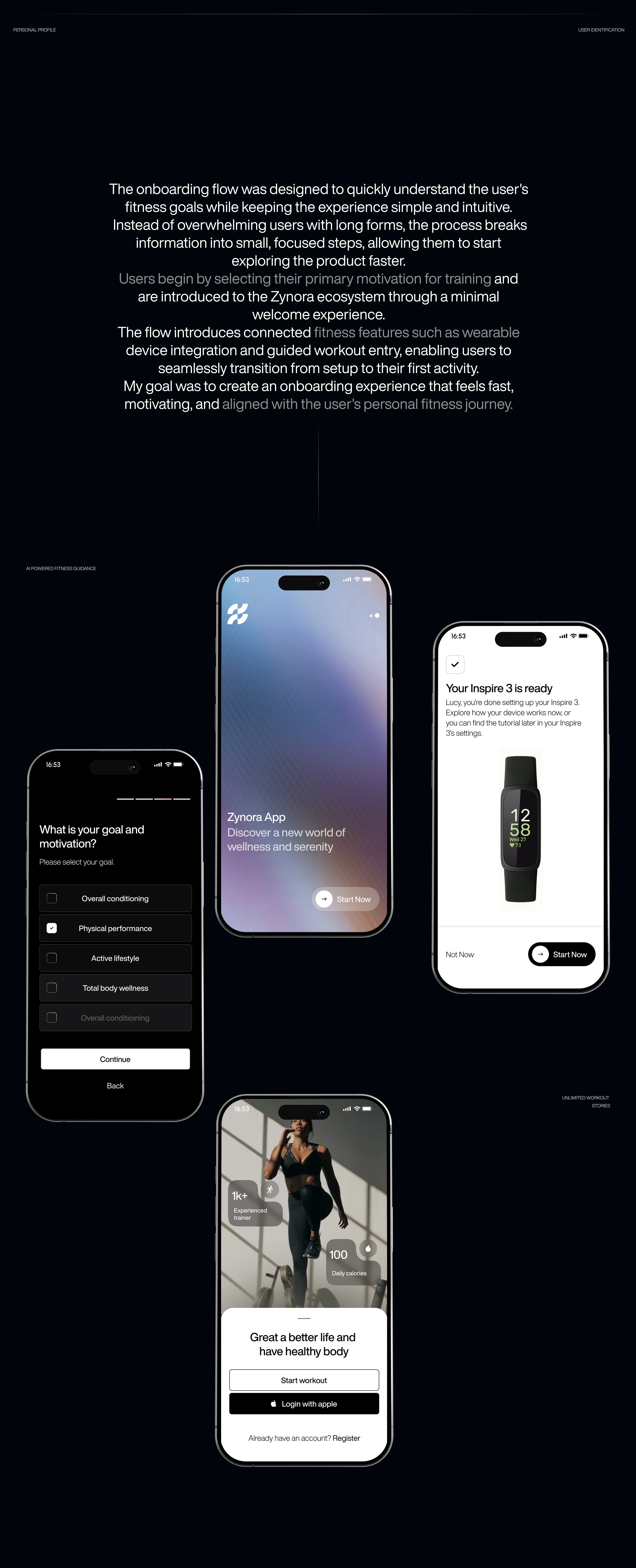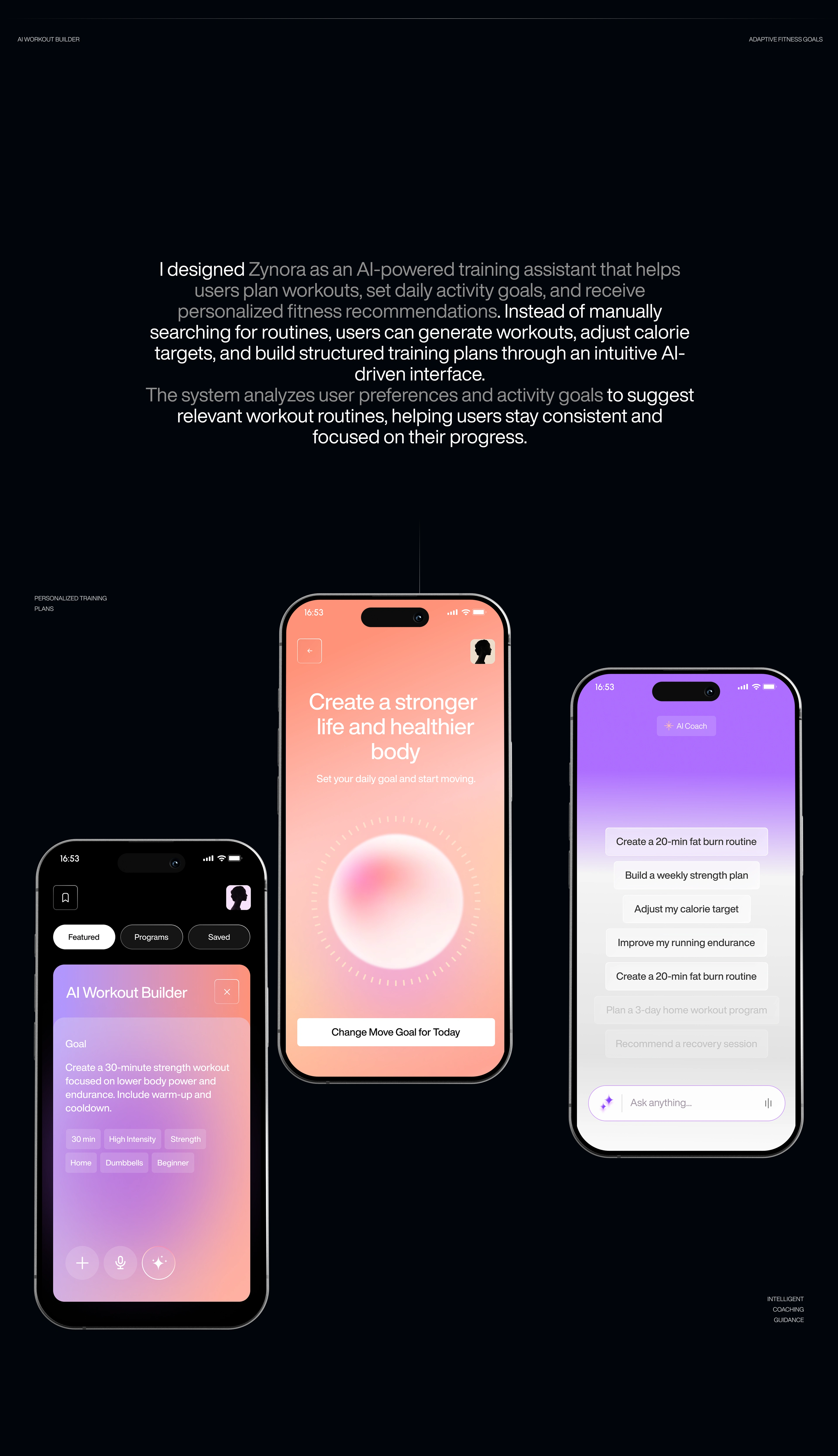 Zynora is an AI-powered fitness assistant designed to help users make smarter training decisions through real-time data interpretation. The goal was to simplify complex body signals and translate them into clear, actionable guidance — enabling users to train efficiently, recover properly, and maintain long-term performance.
