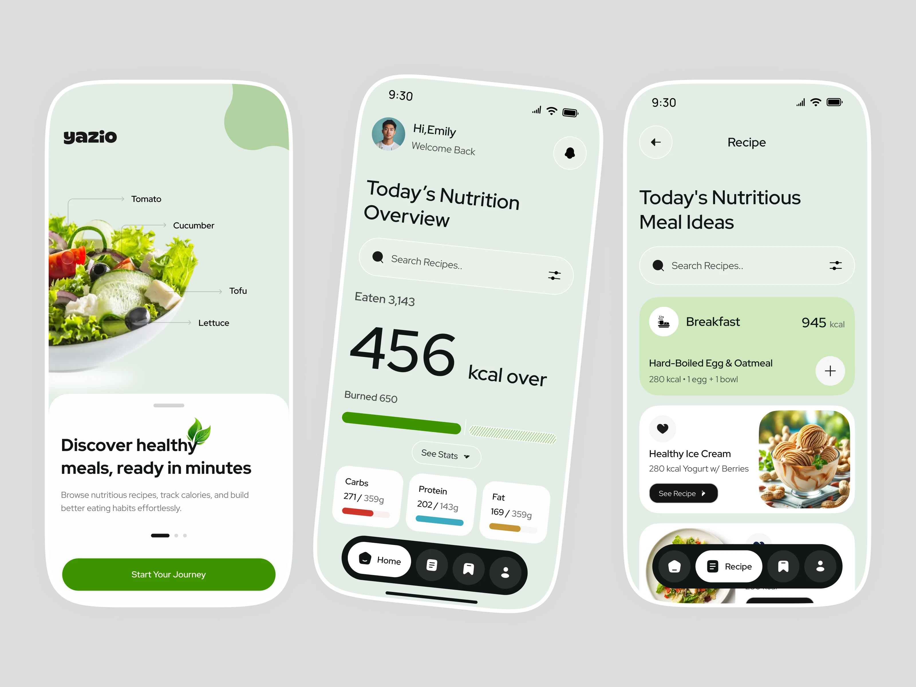 The experience includes a nutrition overview dashboard, daily calorie progress, macro tracking (carbs, protein, fat), and curated meal ideas with recipes—making healthy choices simple and motivating. Soft colors, clear typography, and intuitive layouts ensure the app feels calm, accessible, and easy to use.