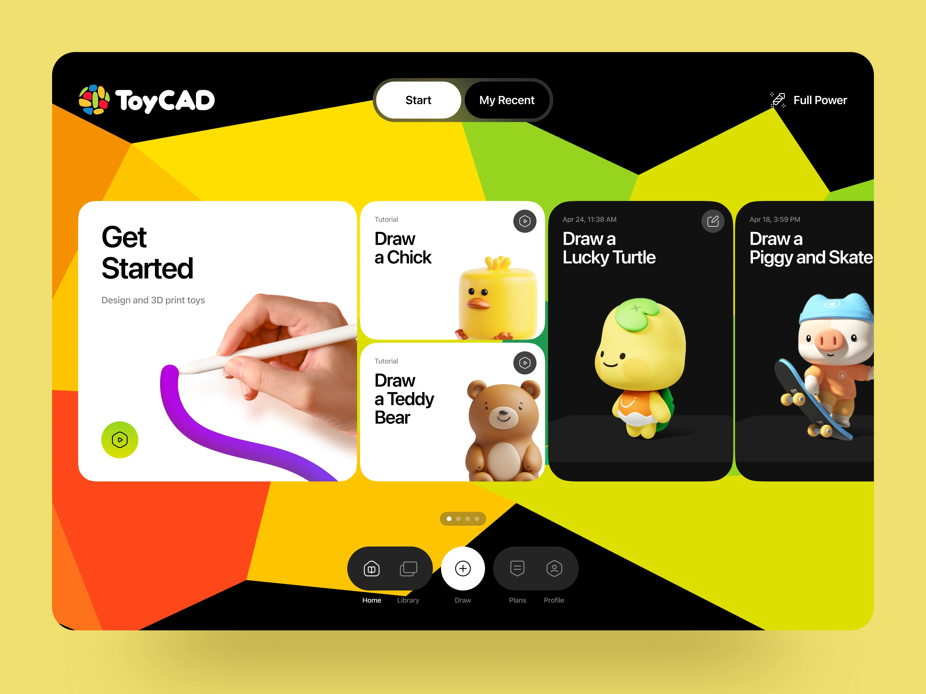 A colorful, easy-to-learn 3D creation web app built to help kids design and print their first toys. The interface blends a playful visual language with a clean, guided workflow so young creators can jump straight into drawing, sculpting, and exploring tutorials. The layout prioritizes clarity and accessibility using large card components for step-by-step lessons and friendly character previews that encourage discovery.