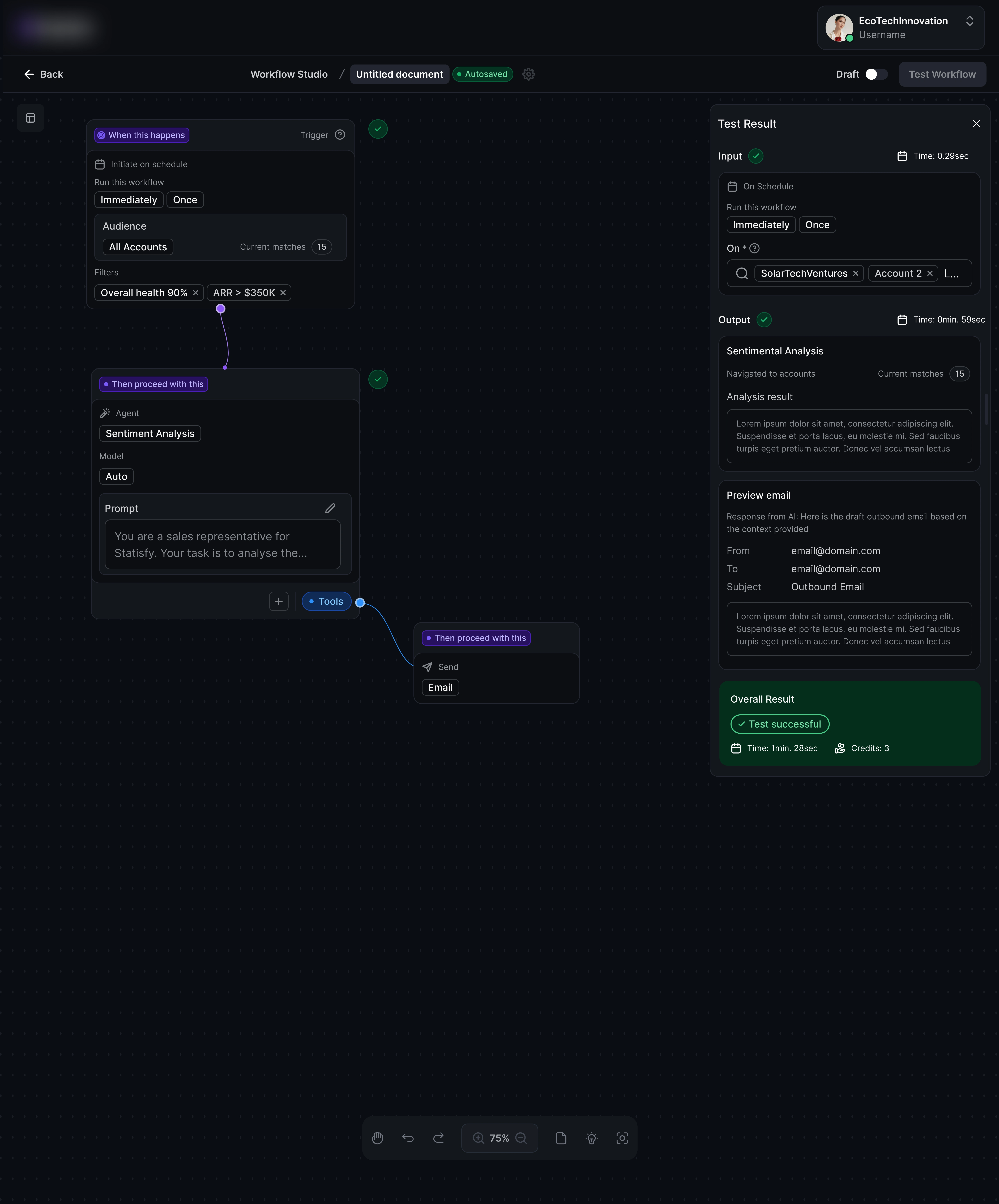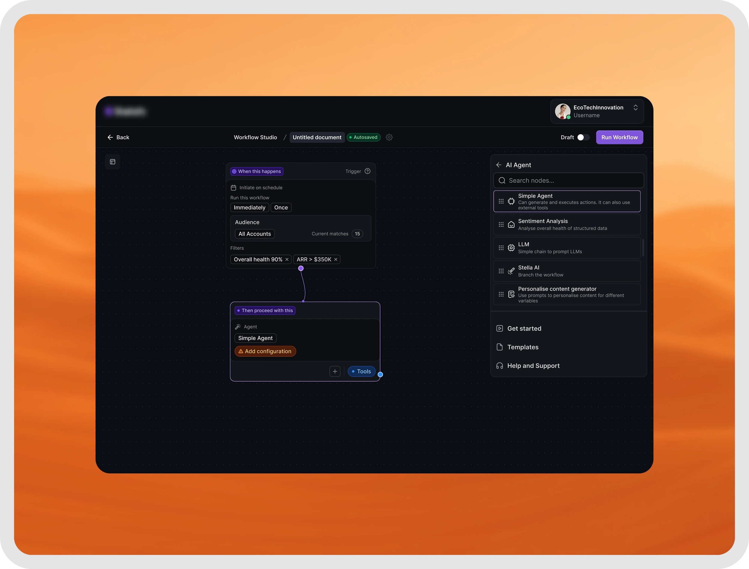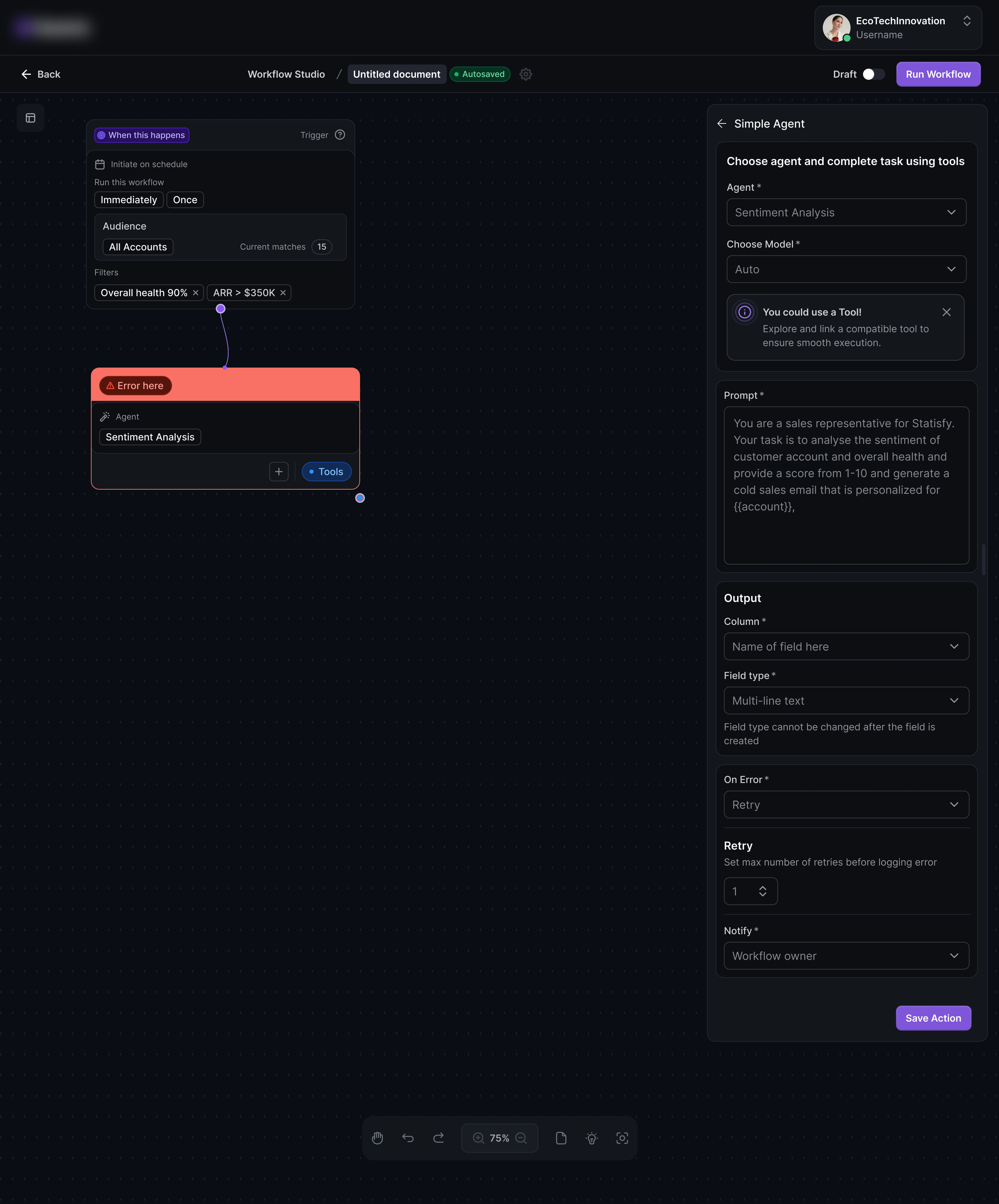 The Workflow Agent Studio is a new no-code workflow automation feature that allows teams to design and automate complex workflows within the Statisfy platform easily. Powered by Large Language Model (LLM) Agents, this feature provides intelligent task orchestration across multiple accounts or user groups. By leveraging both Statisfy’s built-in understanding of customer data and powerful AI-driven nodes, users can streamline workflows that previously required extensive manual intervention or were not feasible.