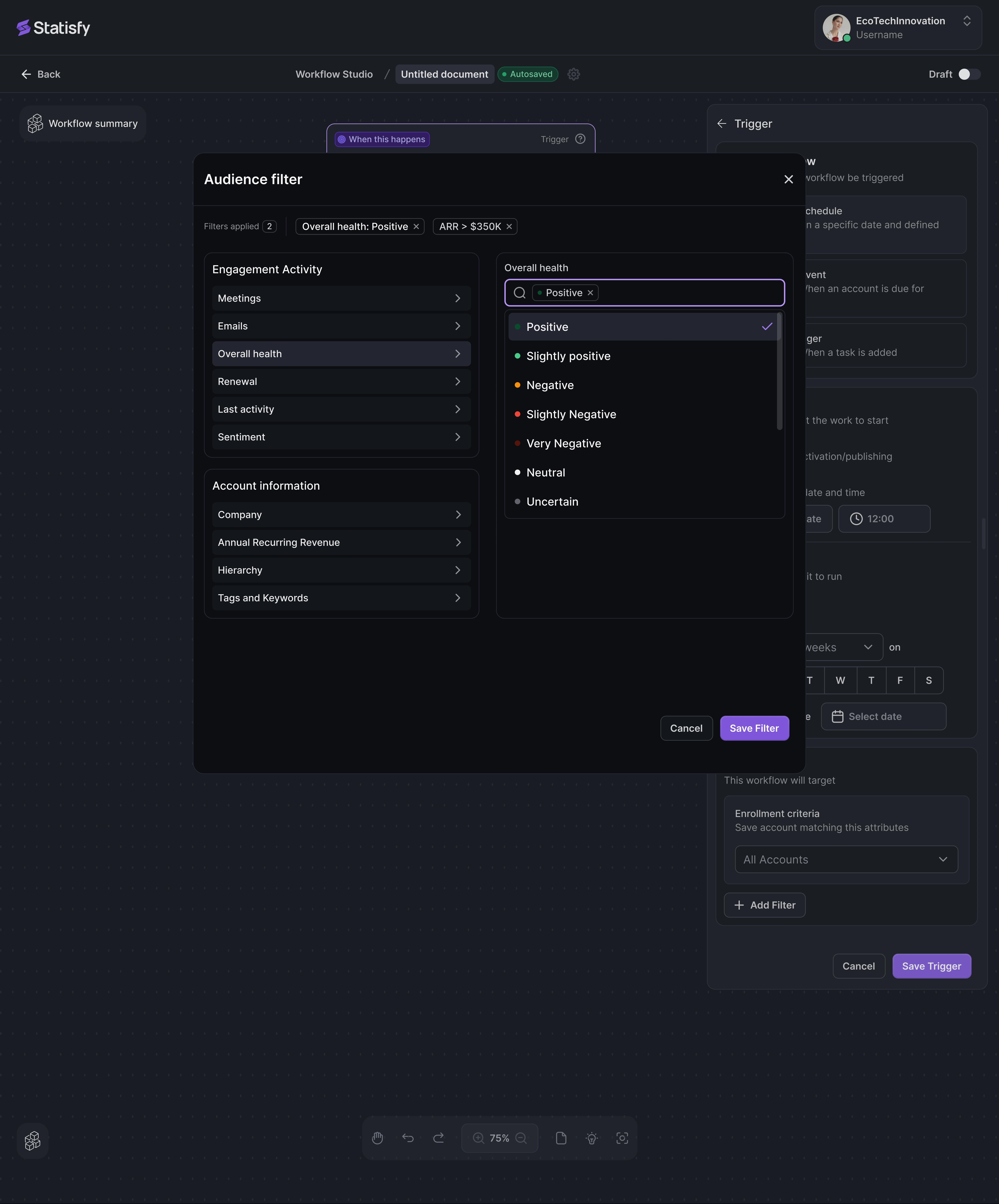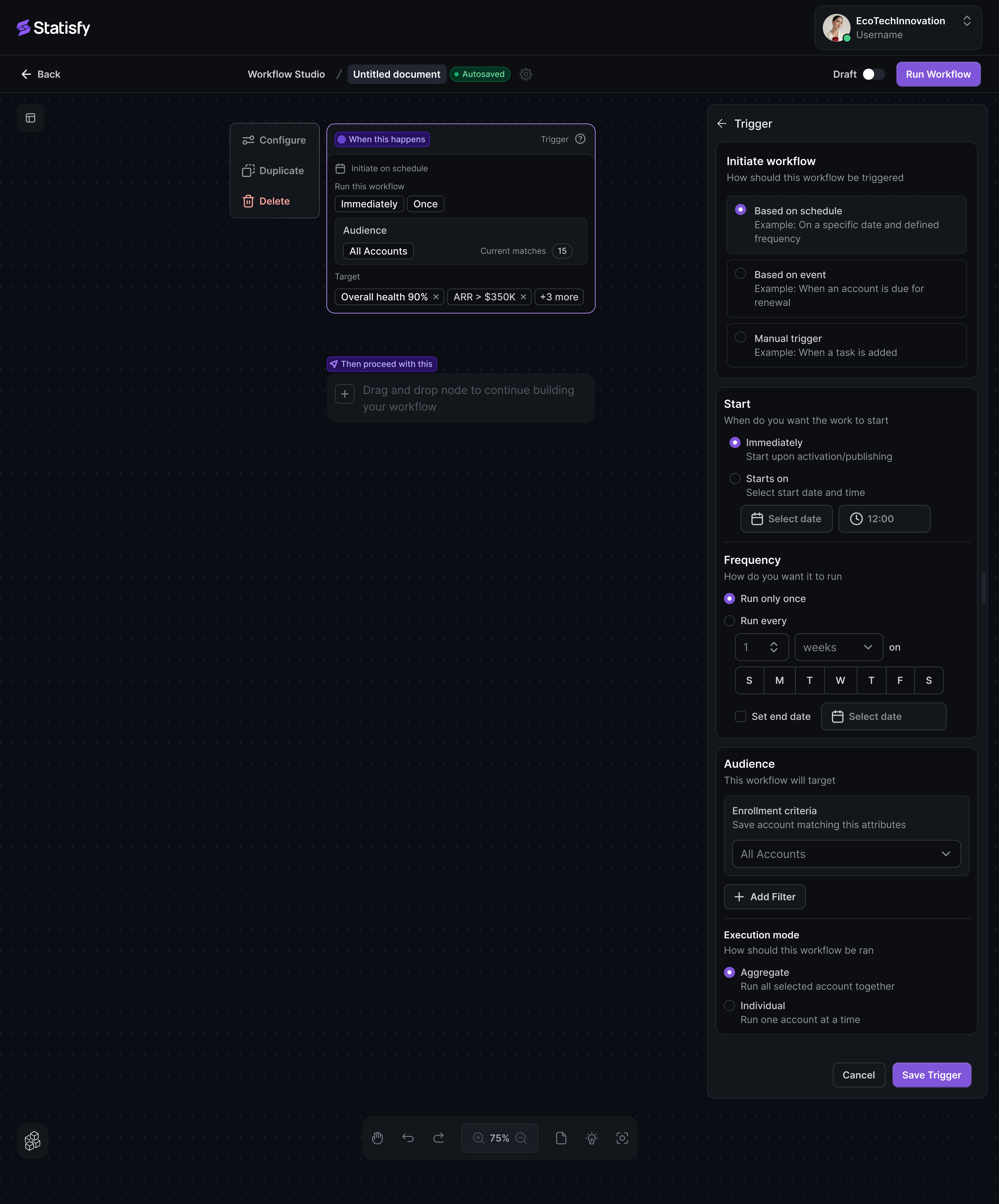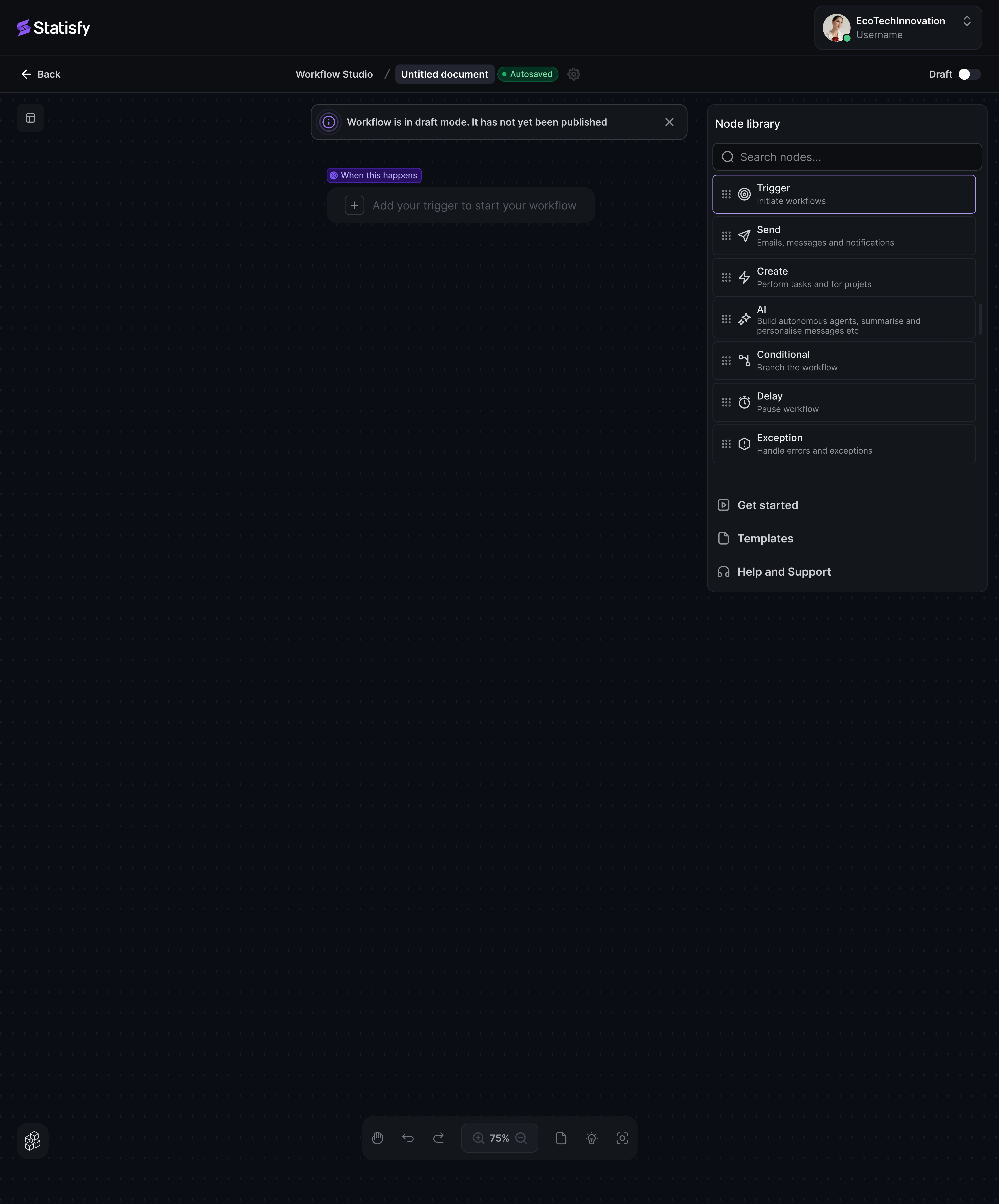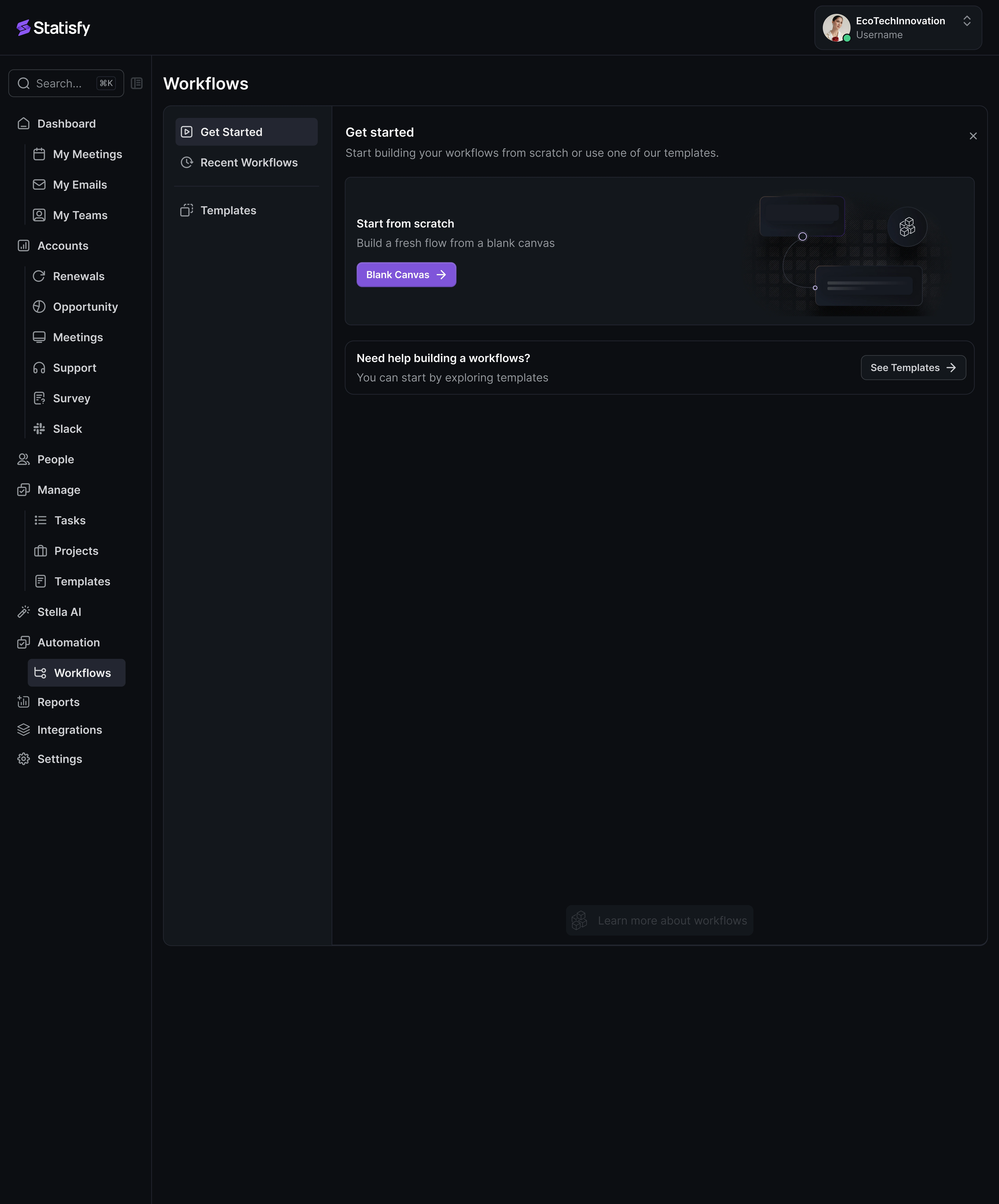The Workflow Agent Studio is a new no-code workflow automation feature that allows teams to design and automate complex workflows within the Statisfy platform easily. Powered by Large Language Model (LLM) Agents, this feature provides intelligent task orchestration across multiple accounts or user groups. By leveraging both Statisfy’s built-in understanding of customer data and powerful AI-driven nodes, users can streamline workflows that previously required extensive manual intervention or were not feasible.