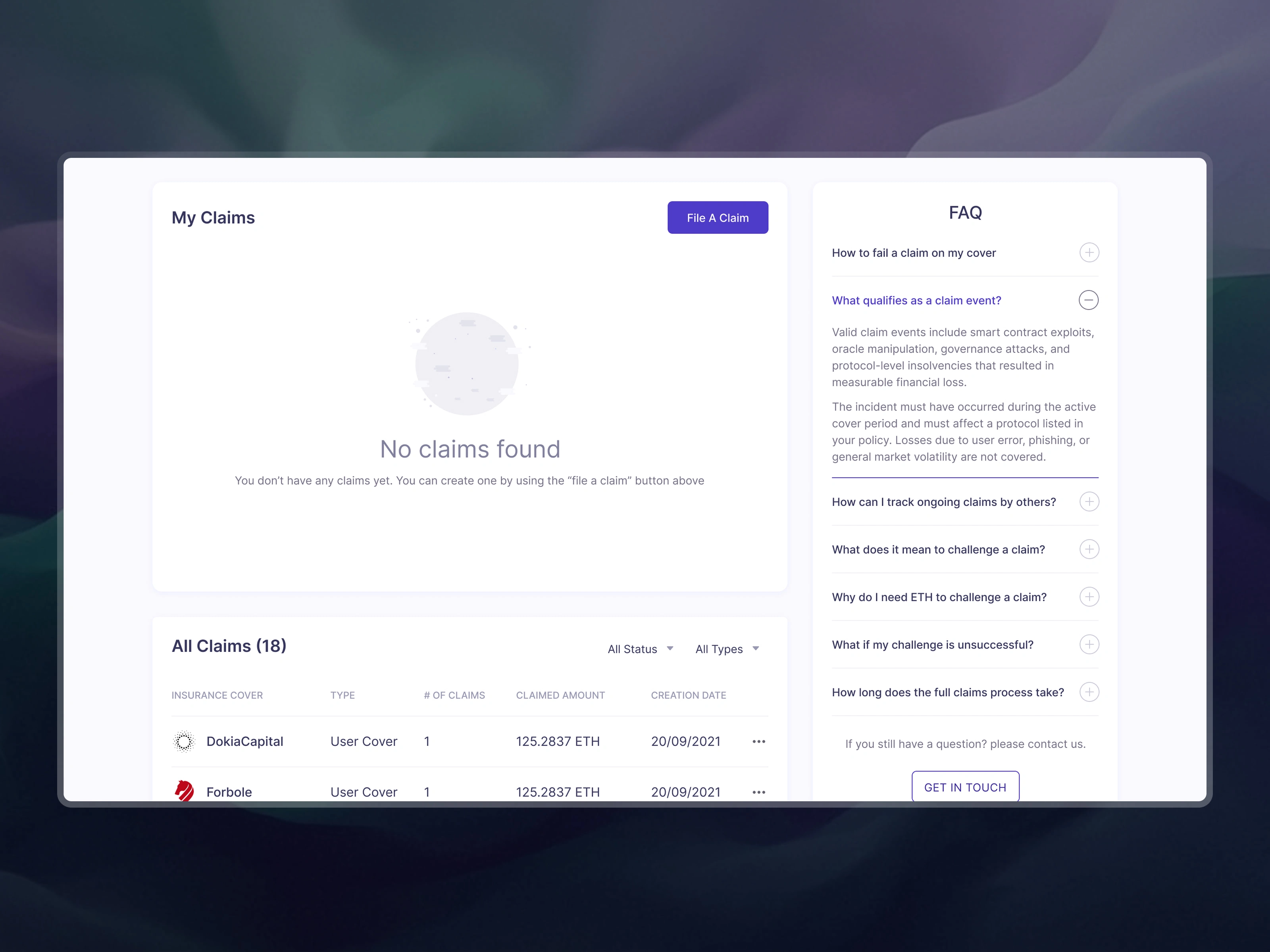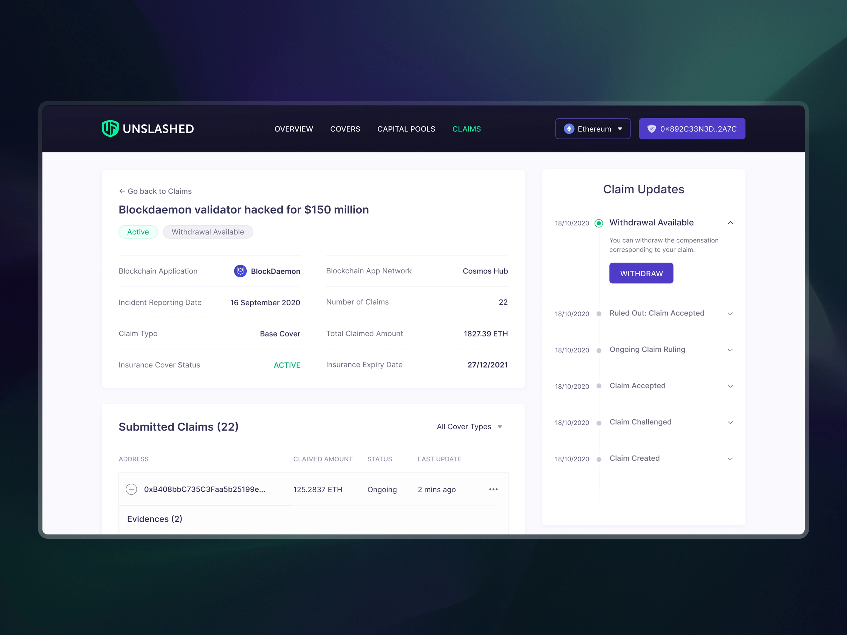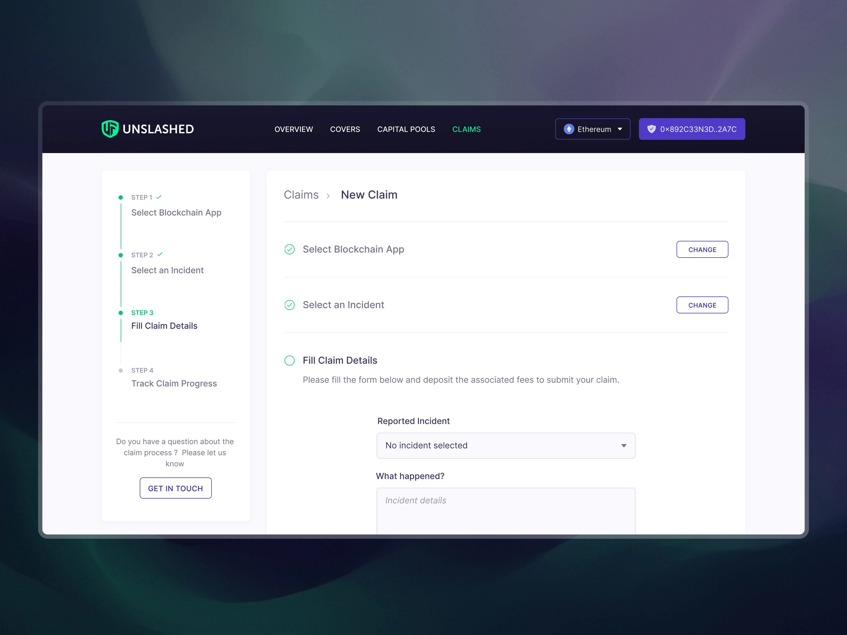 The claims process was the highest-stakes flow in the product. I designed a step-by-step guided experience: select protocol, choose incident type, specify compensation, understand deposit requirements, and submit. Every step surfaces the right context at the right time, because in DeFi, clarity is the difference between trust and abandonment.