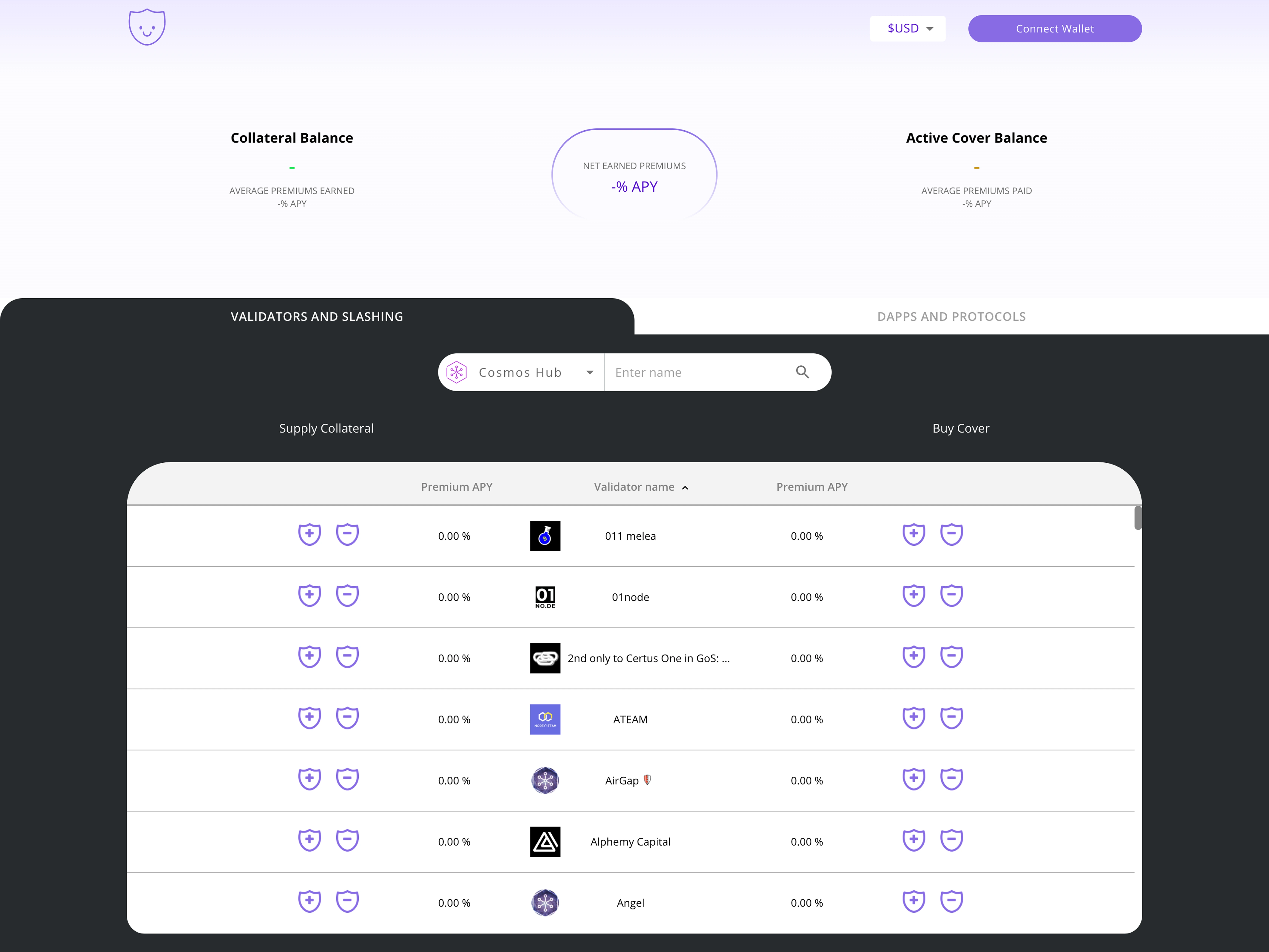 The platform supported three core journeys: Collaterals, where capital providers deposit into markets, track APY, and manage withdrawals. Covers, where buyers browse, purchase, and manage protection policies. And Claims, where users file incidents and navigate deposit requirements, challenge periods, and dispute resolution through Kleros arbitration.