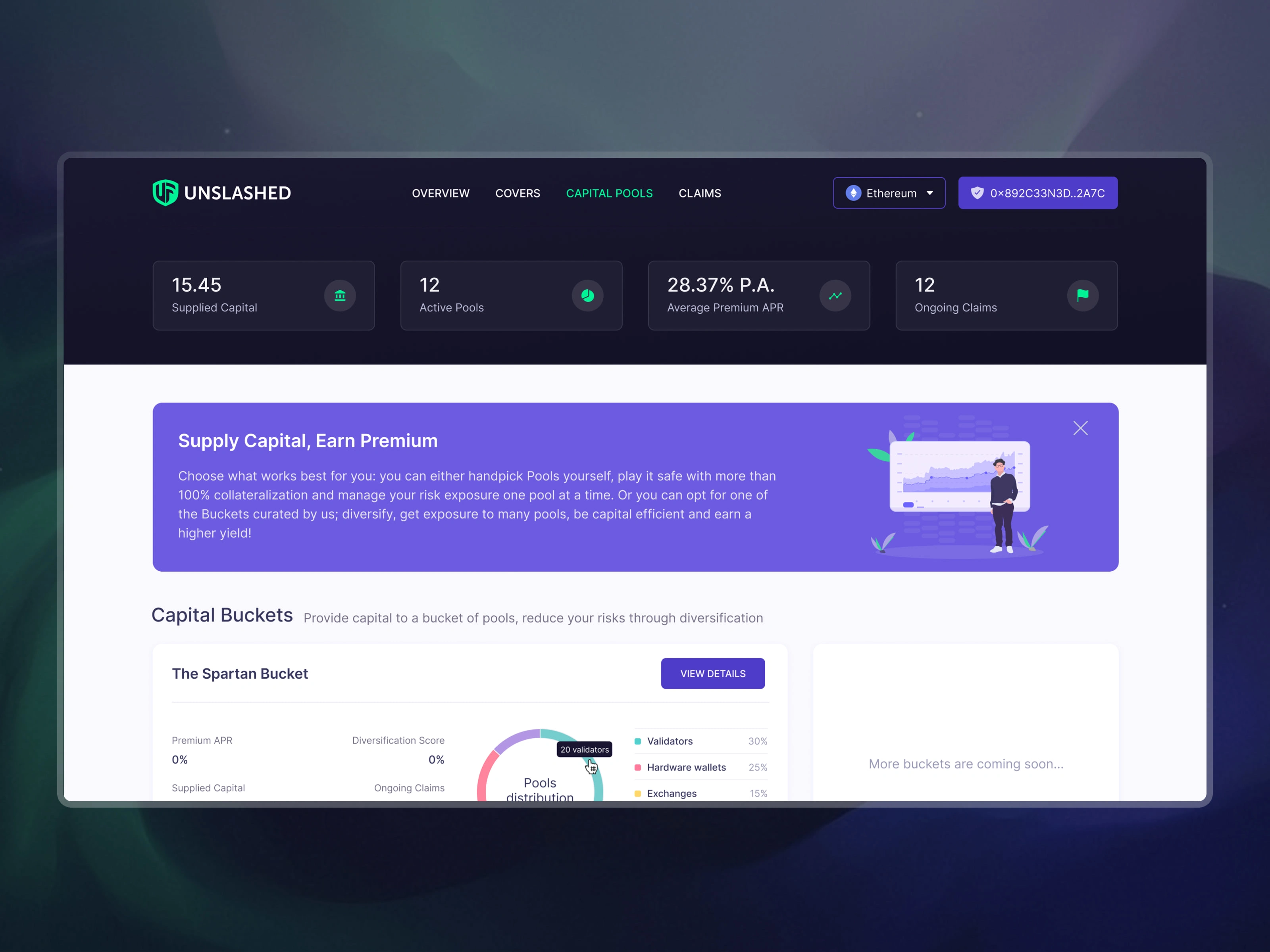 Capital Pools screen, where users can supply capital to a specific protocol cover policy and earn yield on their stake