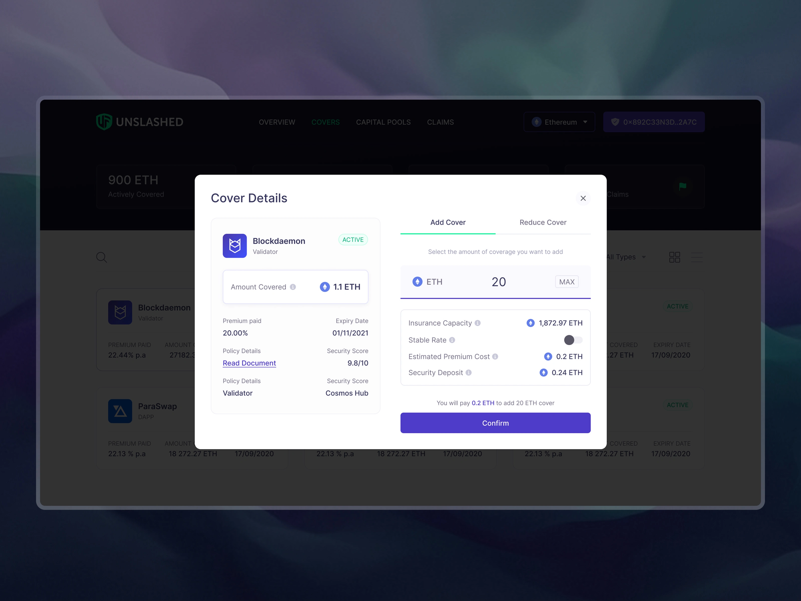 The details view of an insurance policy cover allows users to add or reduce capital to their coverage.