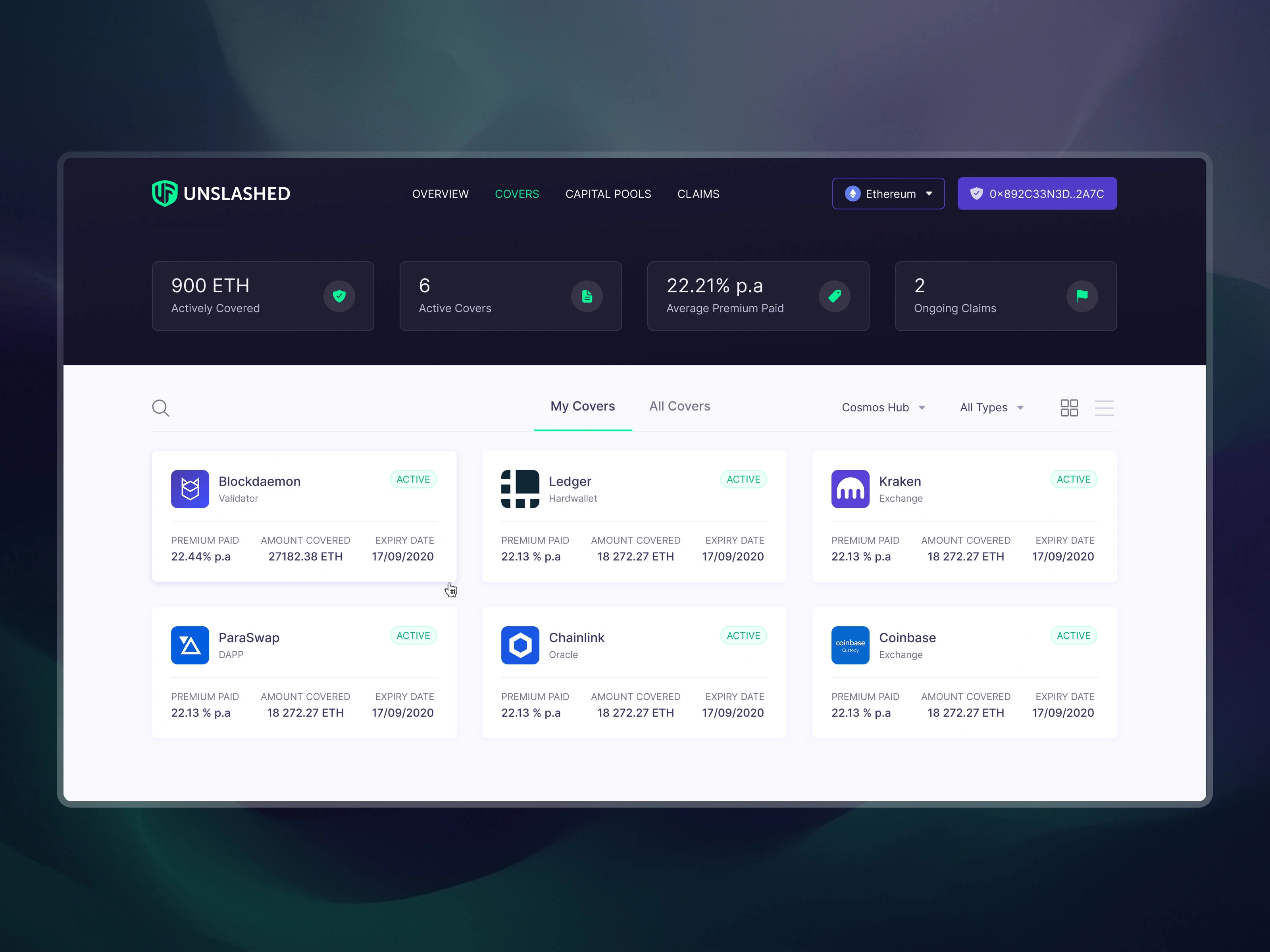 The card's view of the Covers screen, where users can purchase insurance cover to mitigate risks of protocols they're using on the blockchain