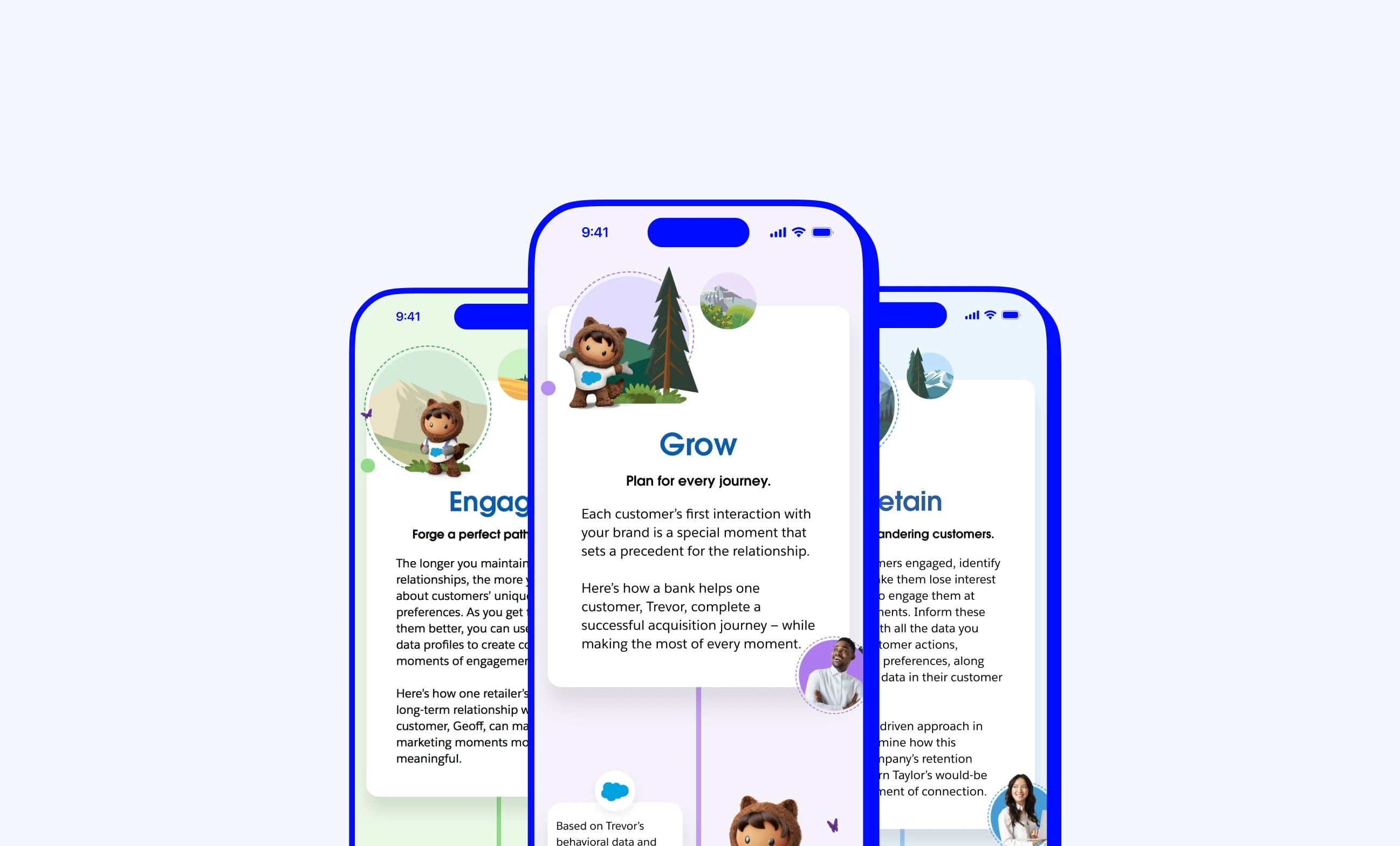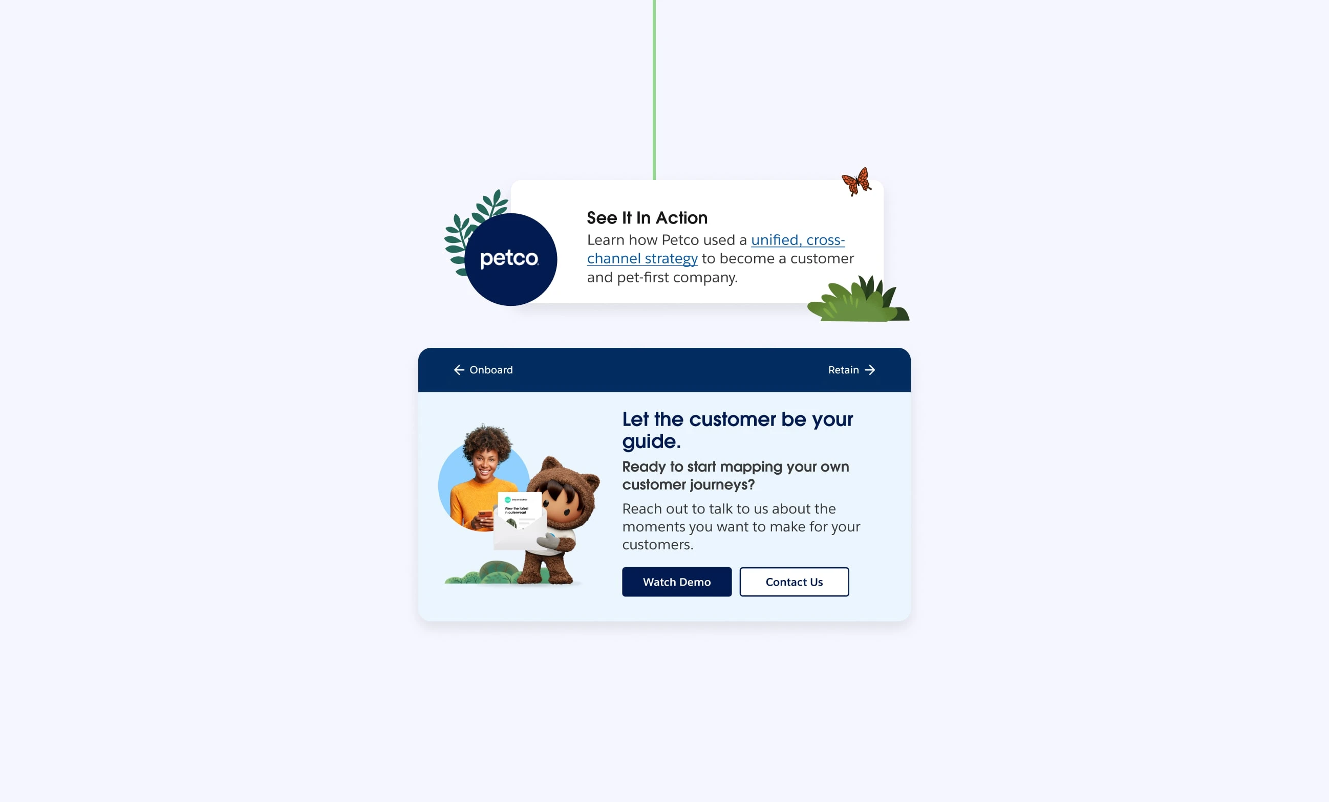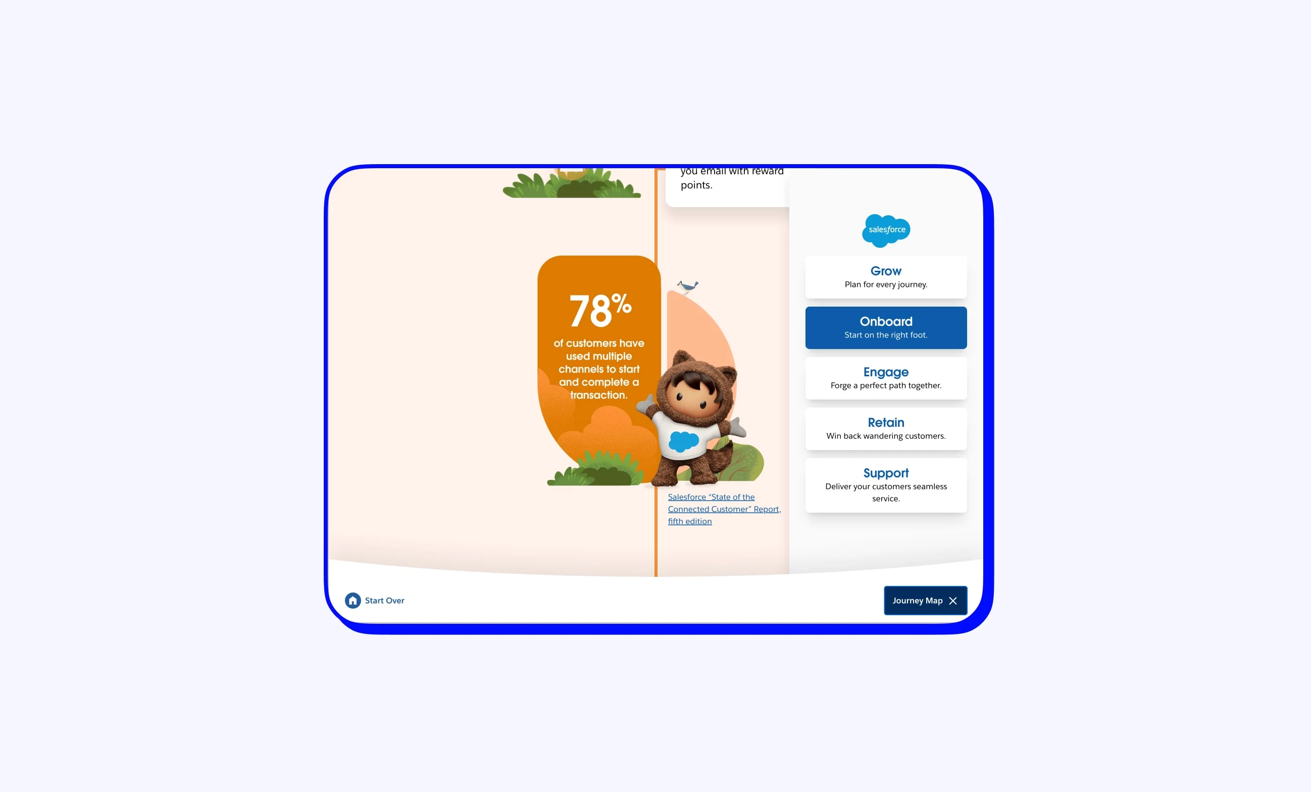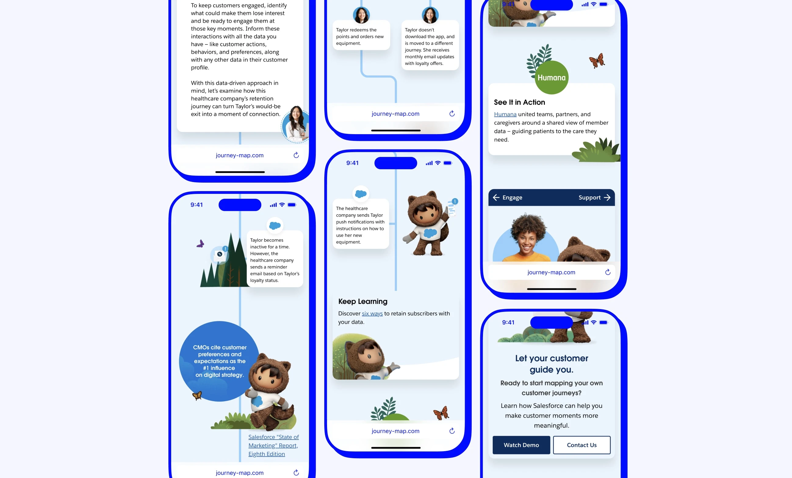 Salesforce sought to revamp their static, single-page PDF sales tool into a dynamic, interactive microsite. The goal was to illustrate five unique customer journeys while engaging users with an enhanced digital experience, showcasing how Salesforce solutions could drive loyalty and ROI.