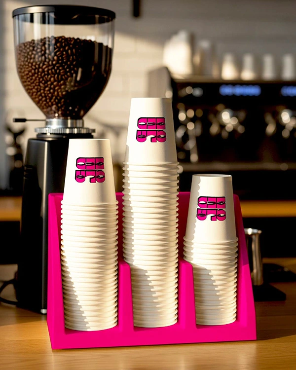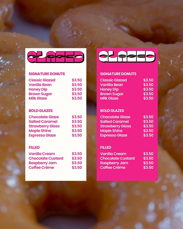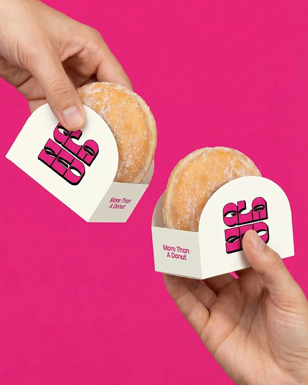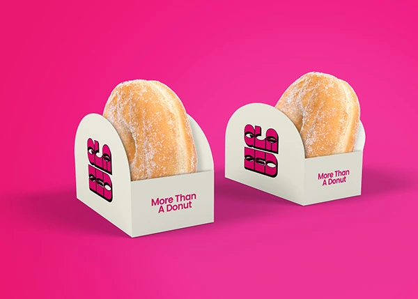 From donut wraps to in store menu boards, the bold pink and cream colour pairing keeps everything cohesive while maintaining a clean, modern feel.