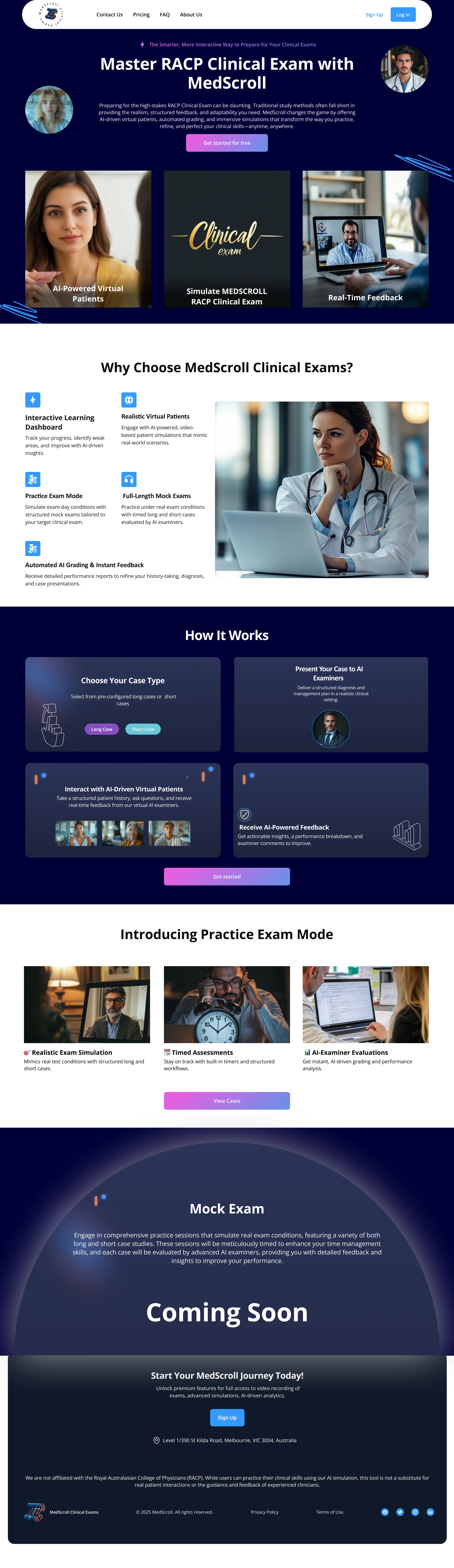 This is a Landing page for an AI-driven medical education platform designed to help doctors, medical students, nursing students, and junior doctors prepare for exams in a simulated environment. Whether you're studying for OSCEs, PACES, or aiming to boost confidence for ward rounds, this platform is tailored to support your clinical exam prep. I was responsible for designing and generating all images used in this platform