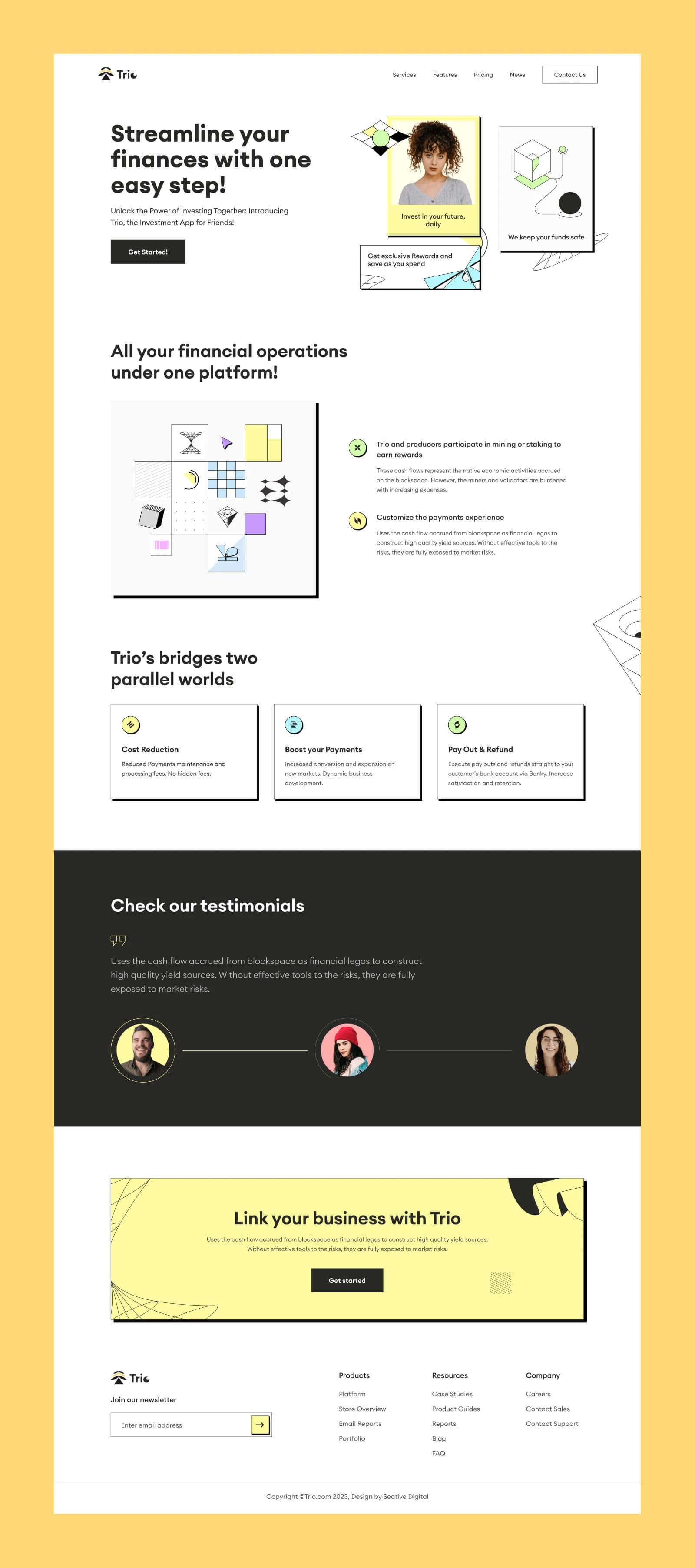 I have created an home page for the Trio fintech company. Trio is allow everyone across the globe to easily manage their money on the fly with help of web platform.