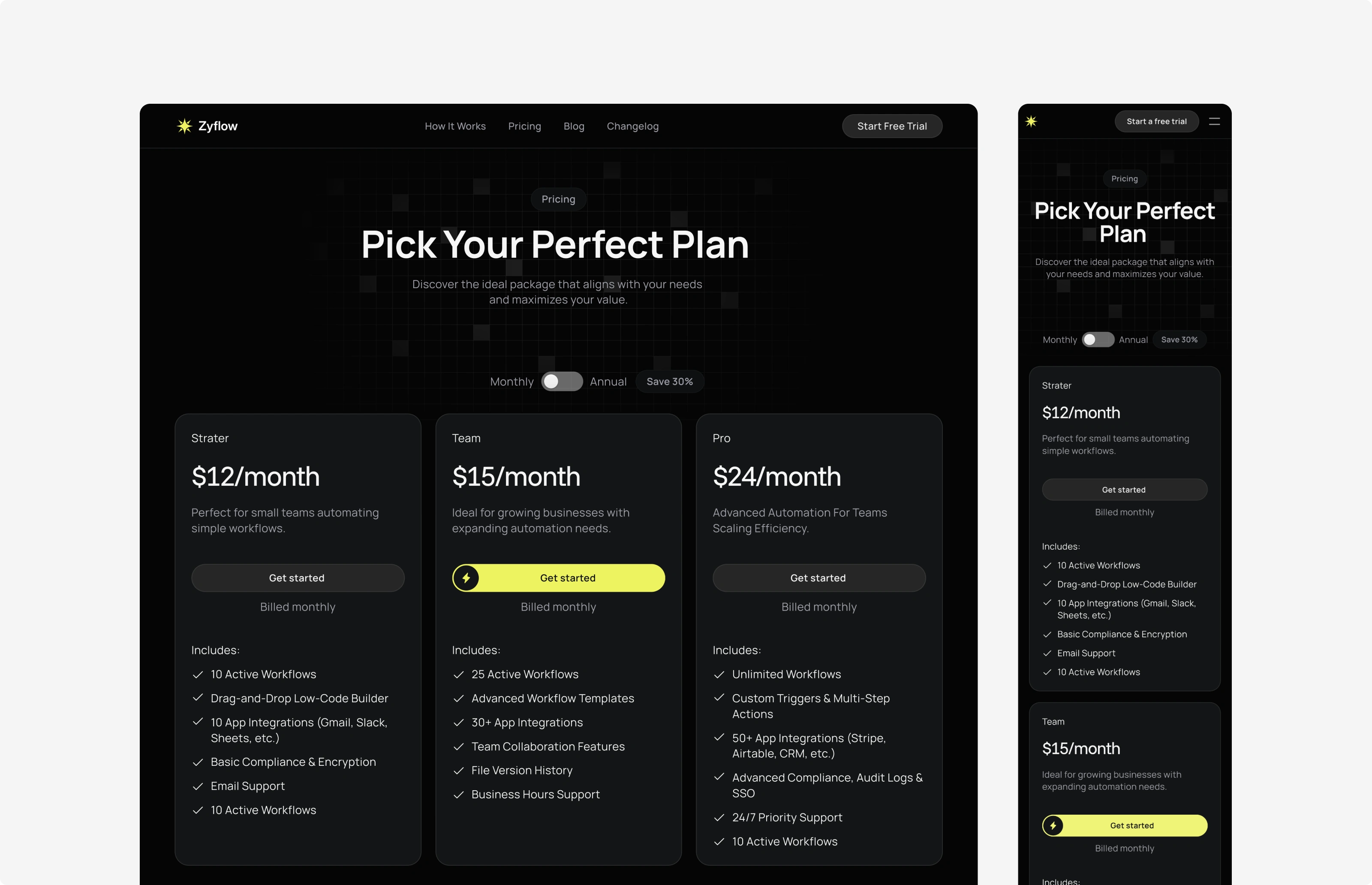 A high-converting pricing interface designed with clear visual hierarchy to distinguish plan tiers and highlight the best value. Features an interactive monthly/annual toggle and a fully responsive layout that adapts seamlessly to mobile devices.