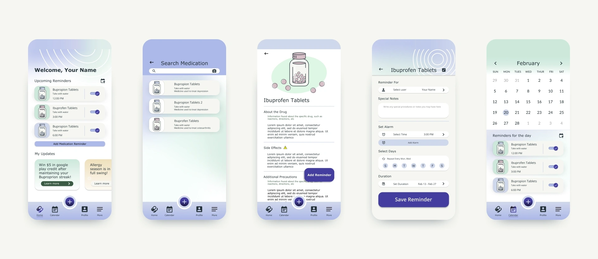 • Medication Reminder Flow Mobile interface for setting daily alarms, with clear dose tracking and snooze options.