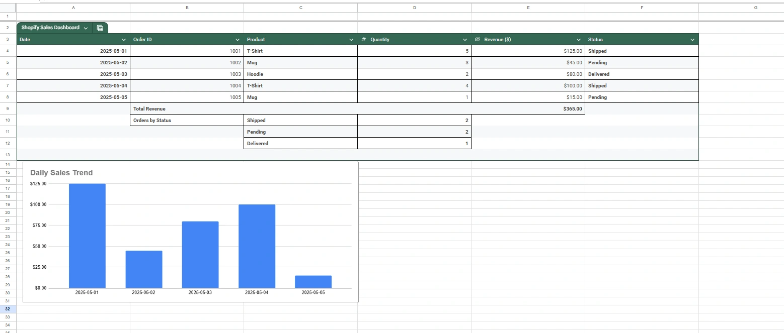 Developed a Shopify Sales Dashboard for an e-commerce client to automate order tracking and sales reporting. The goal was to streamline operations and monitor revenue in real-time. I built a Google Sheets solution with dynamic totals, status tracking, and a sales trend chart, mimicking Shopify API integration. Delivered in 48 hours, the dashboard saved the client 20+ hours/week on manual tasks, enabling better inventory decisions and a 15% increase in operational efficiency. Tech: Google Apps Script, Sheets formulas.