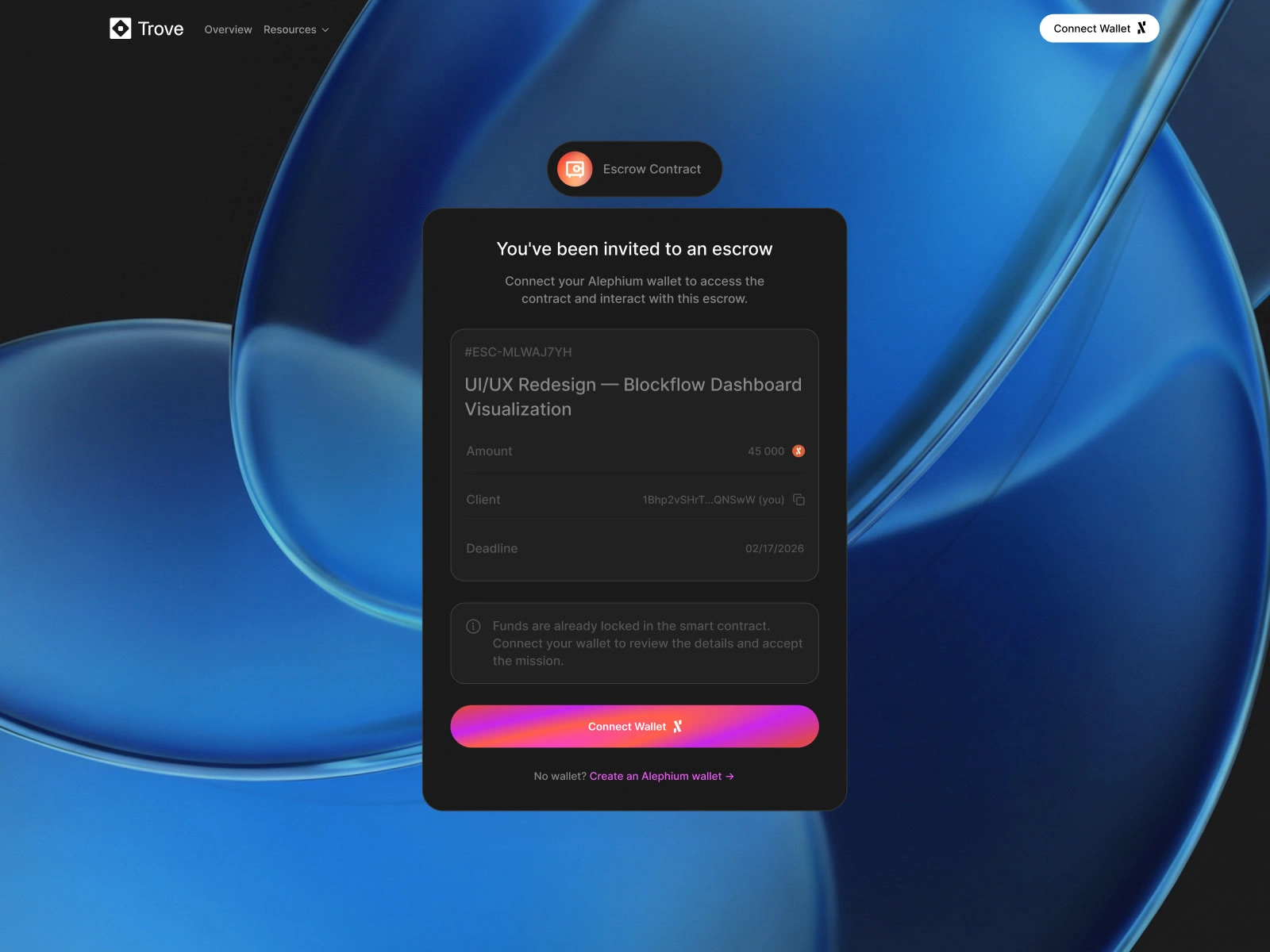 Full UI/UX design and front-end for a DeFi escrow protocol. Escrow creation, contract dashboard, onboarding, and dispute resolution on Alephium.
