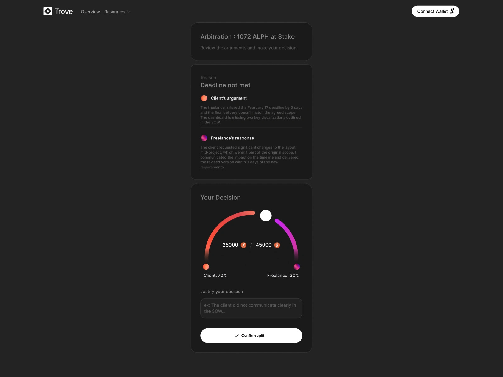 When there's a dispute, an on-chain arbiter reviews both arguments. Then makes a decision using a slider that visually splits the funds between both parties.