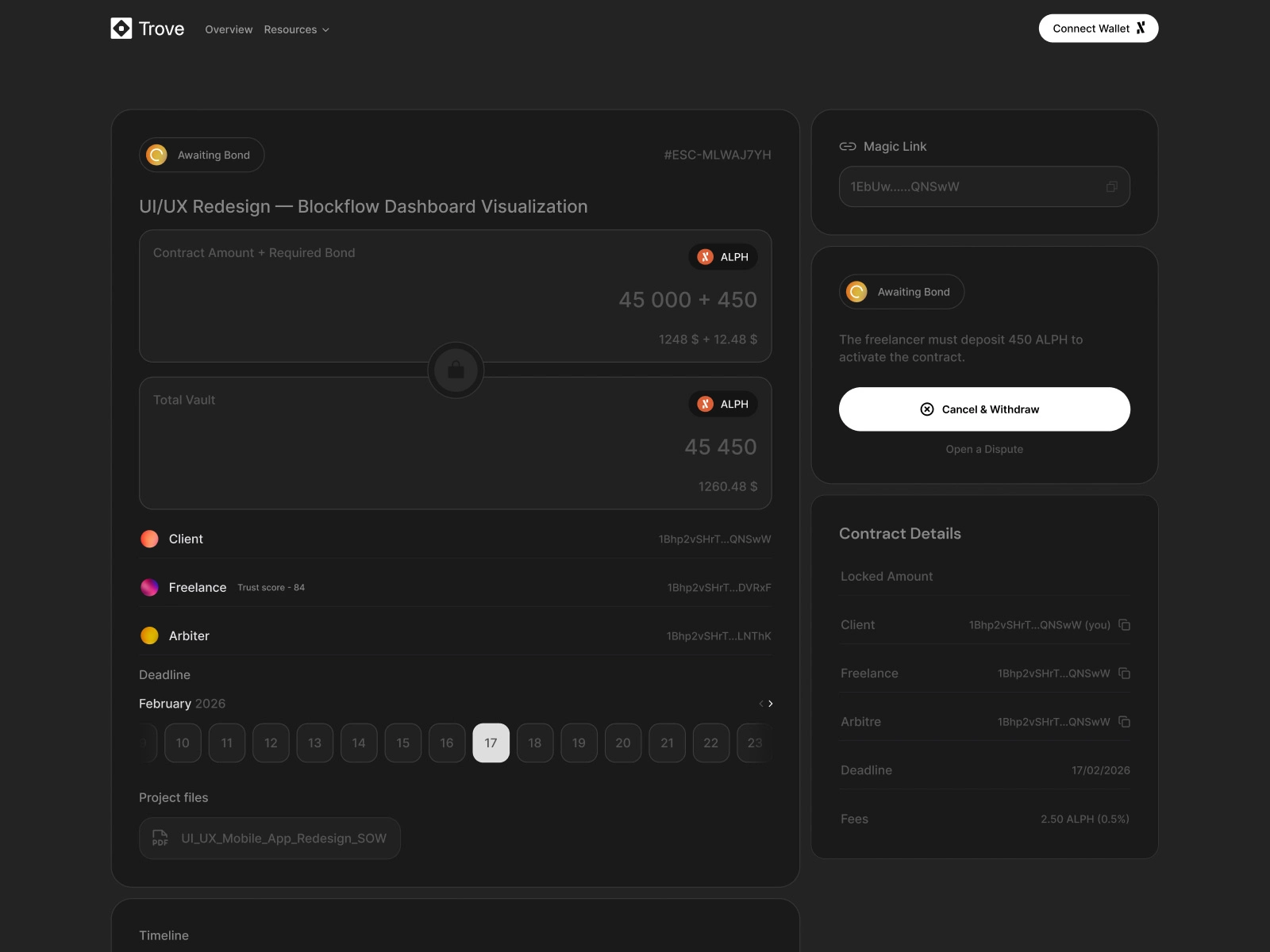 Once the escrow is live, both parties see the same dashboard: contract amount, required bond, total vault, wallet addresses, deadline, project files, and a full timeline of on-chain events.
