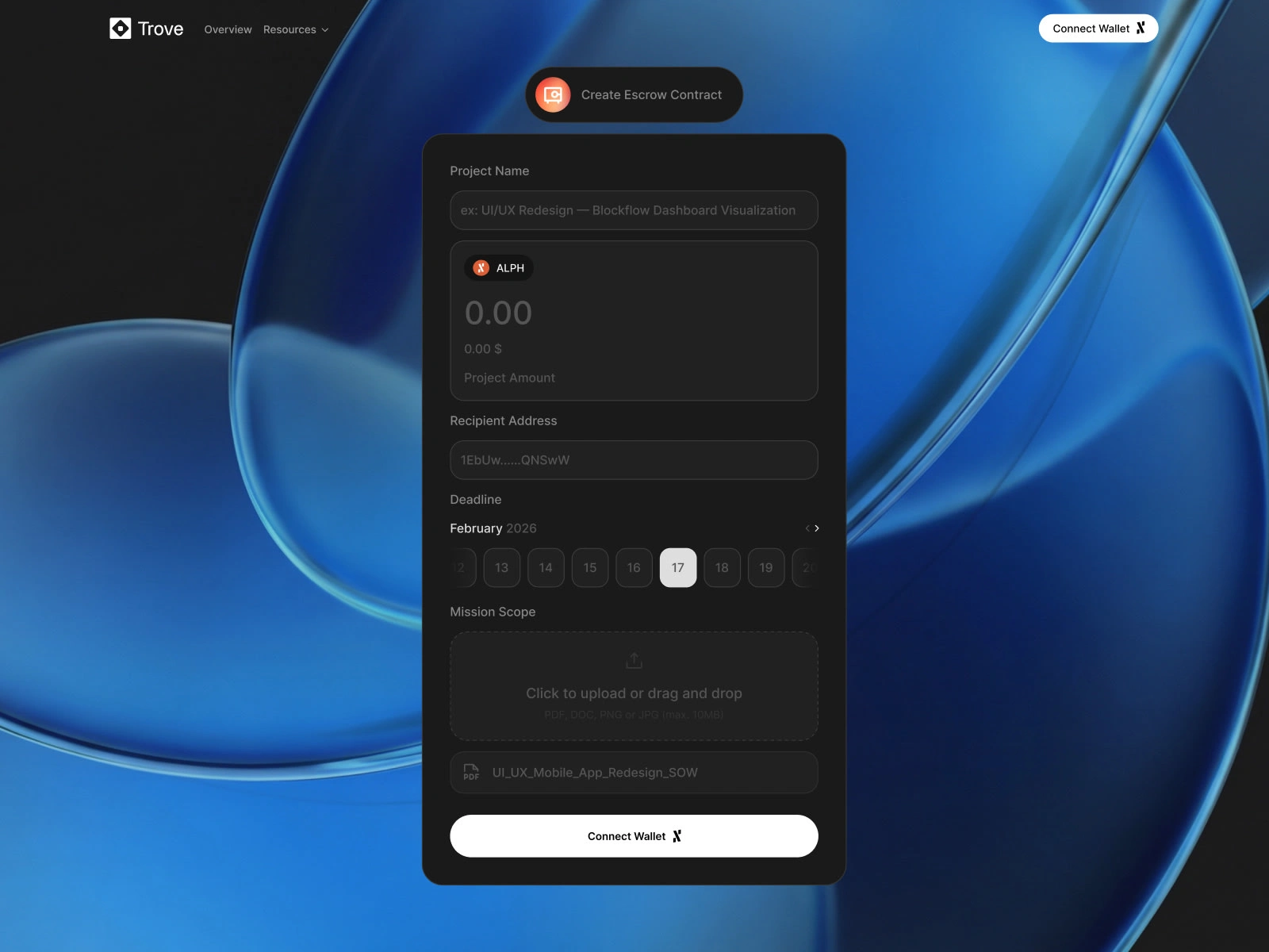 The client names the project, sets the amount in ALPH, adds the freelancer's address, picks a deadline, and uploads the scope of work. One page, one action. Everything needed to deploy a smart contract, nothing more.