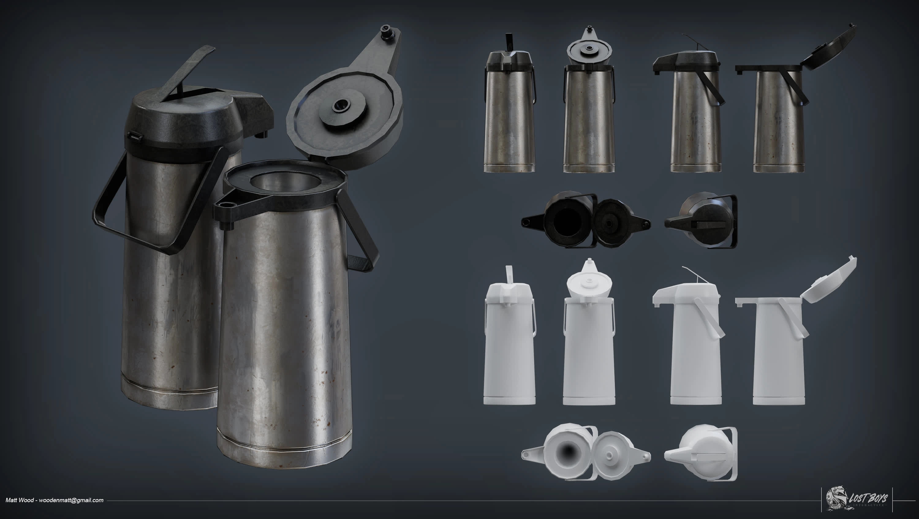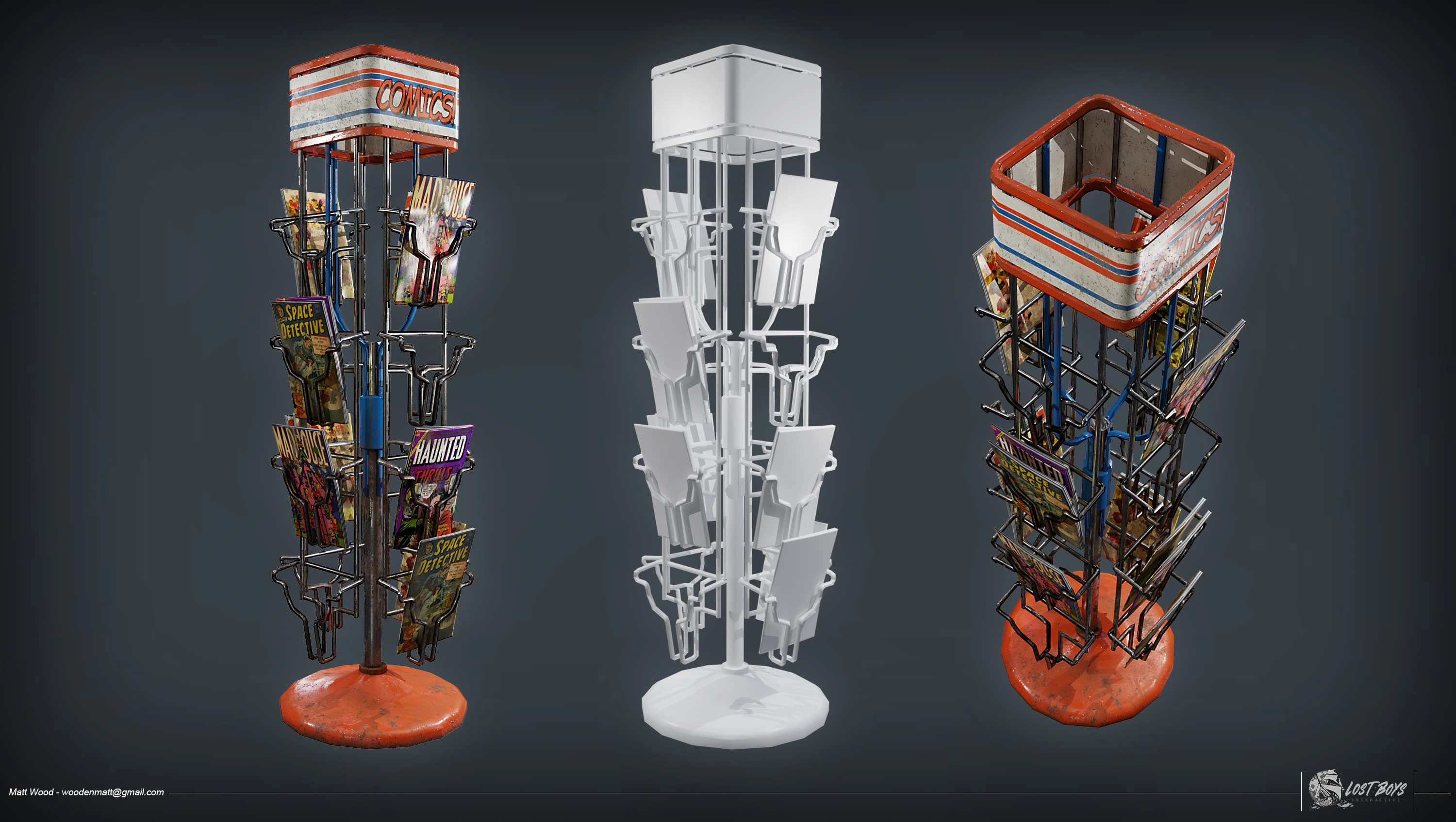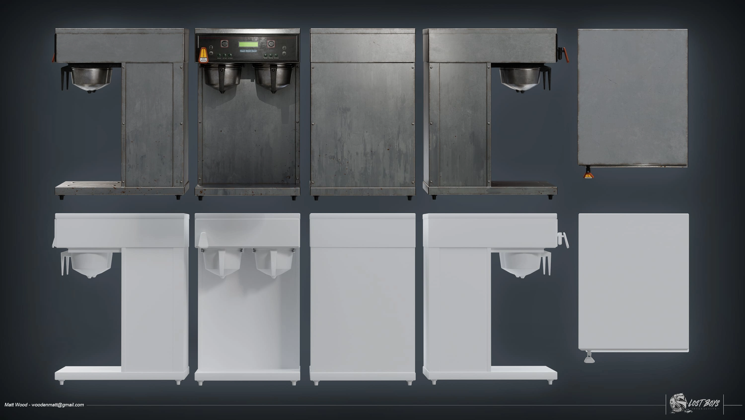Realistic coffee maker and comic stand prop for AAA video game.