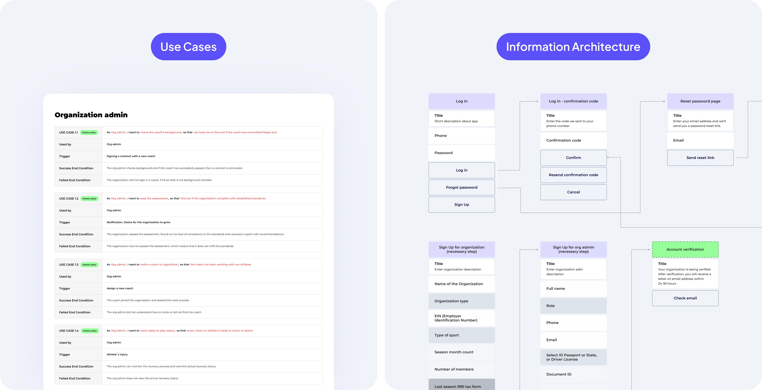 To define functional requirements and prioritize features, I developed use cases for 6 primary user roles and created information architecture
