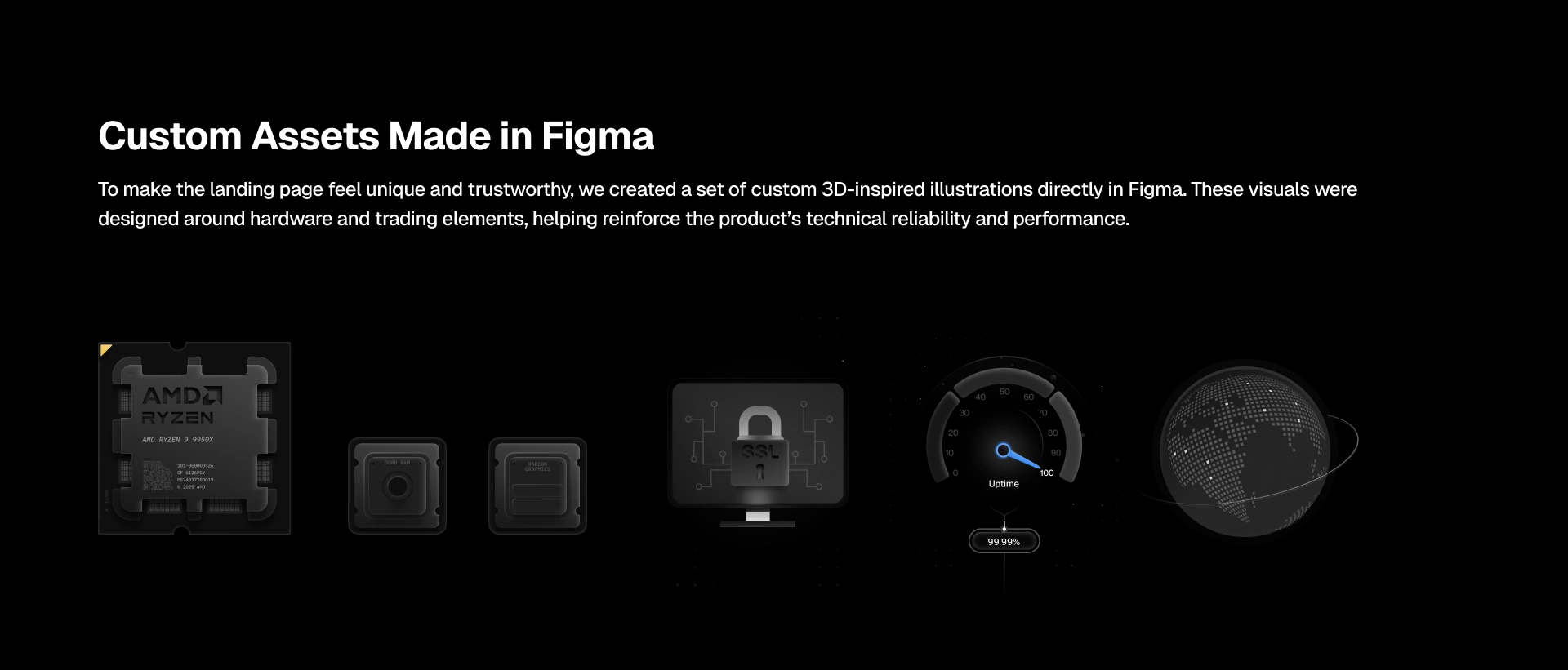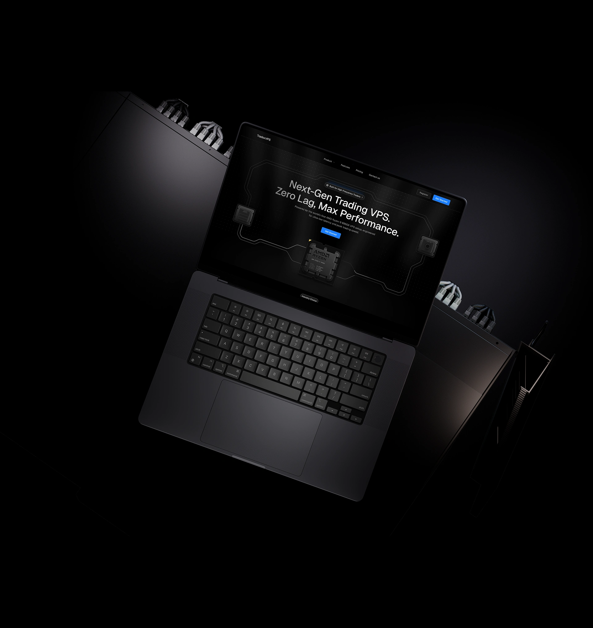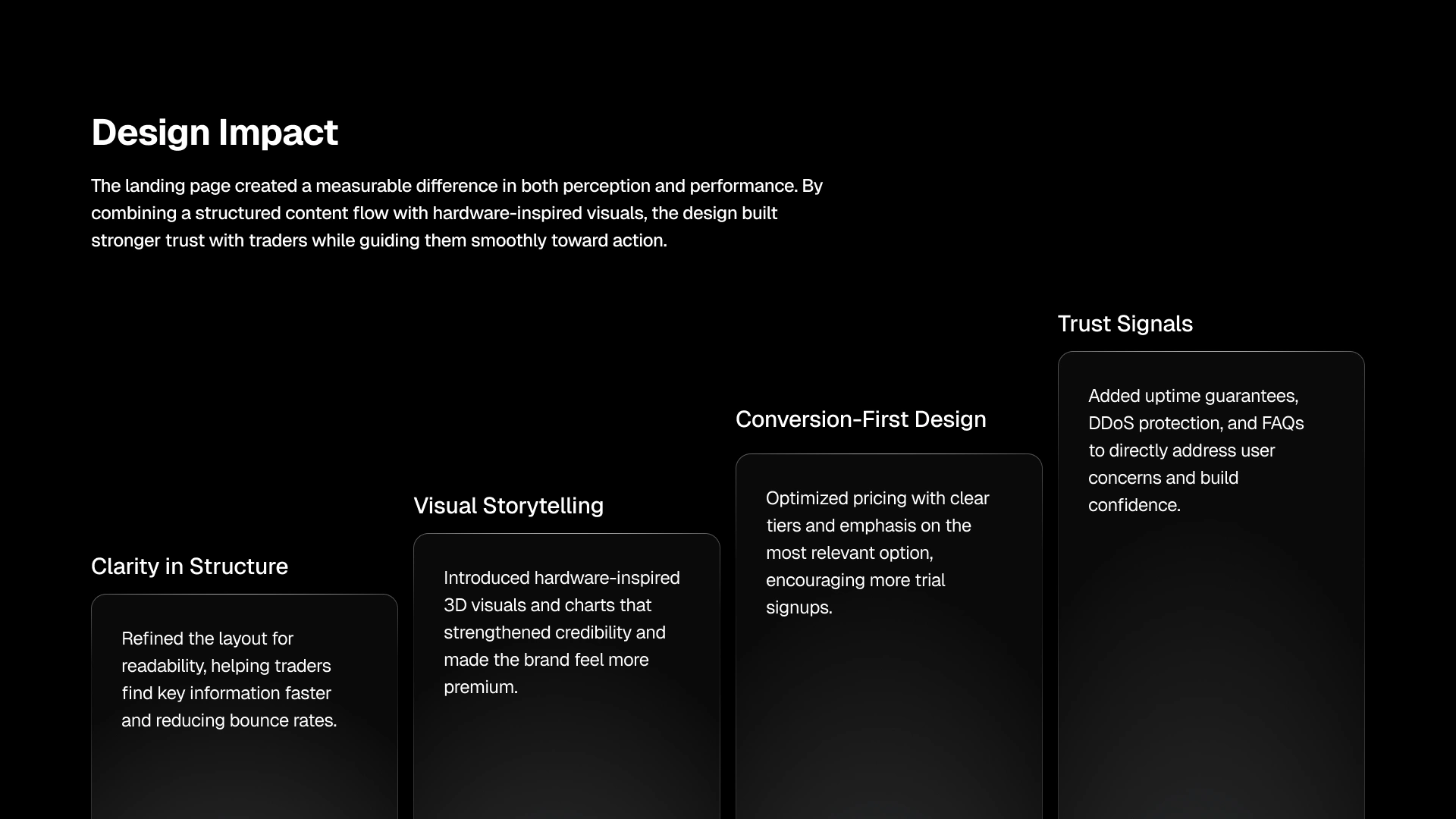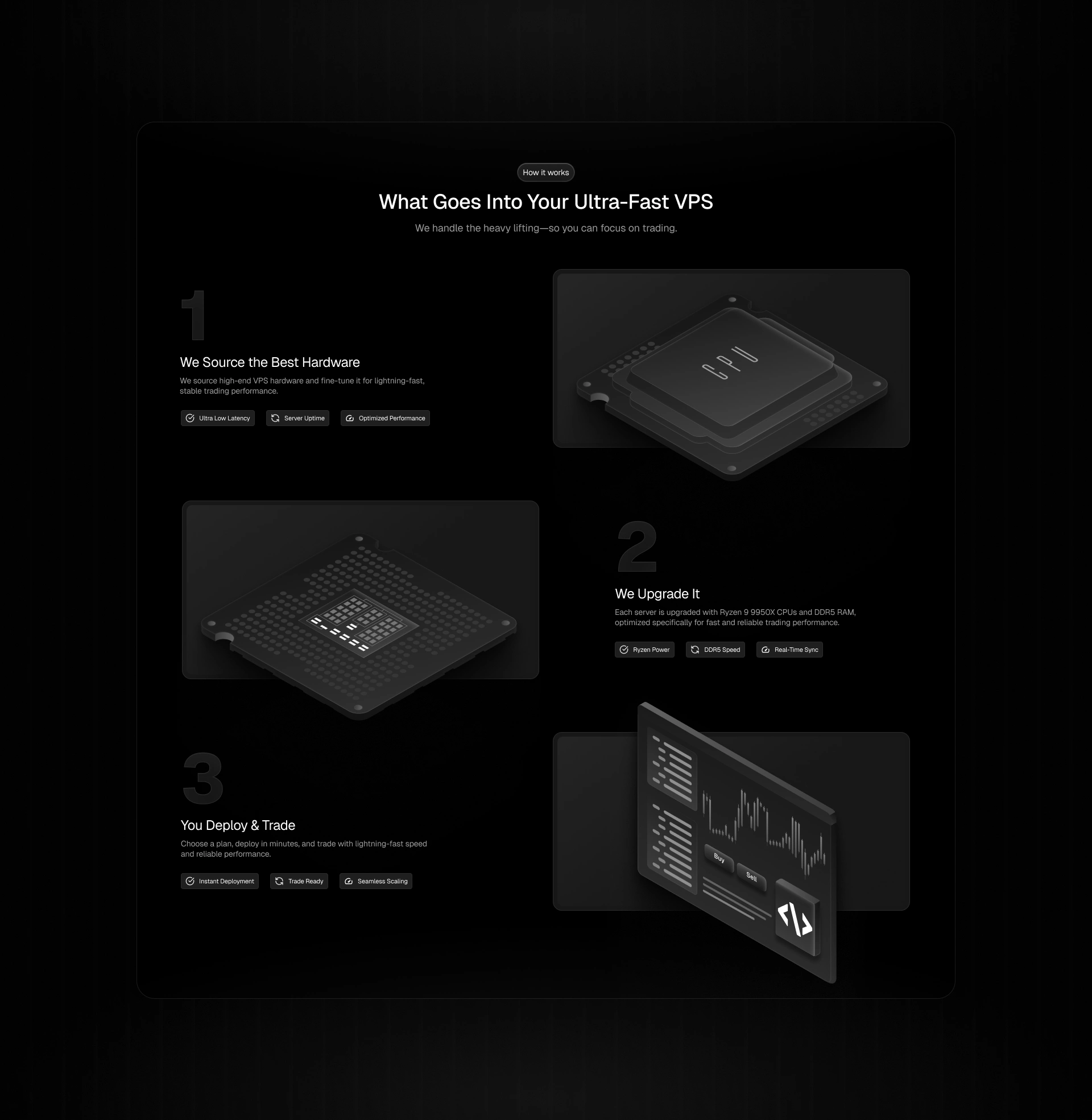 Our goal was to build a landing experience that was both easy to understand and proven to trust. Traders don’t have time to dig through clutter—so we crafted a flow where the value, benefits, and pricing are clear within seconds. At the same time, we reinforced credibility with hardware-inspired 3D illustrations, performance metrics, uptime guarantees, and custom animations.