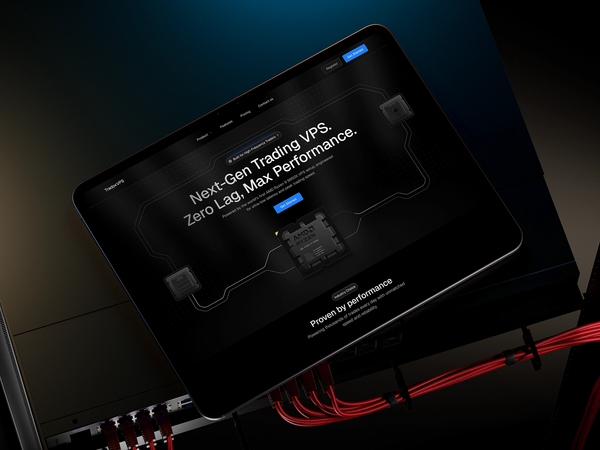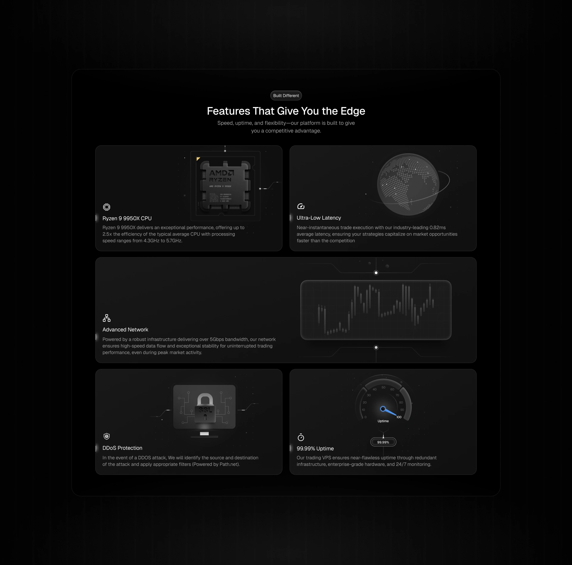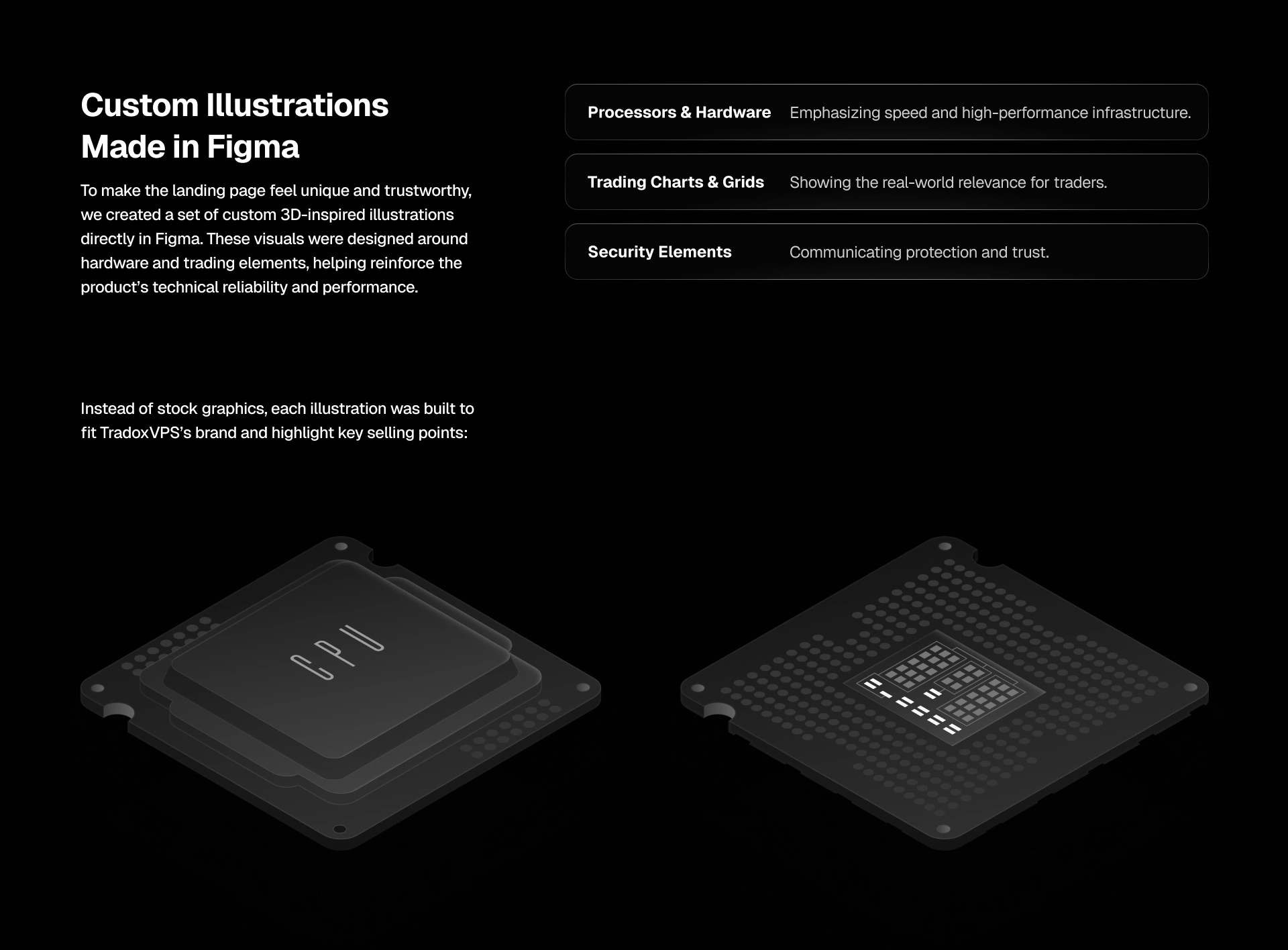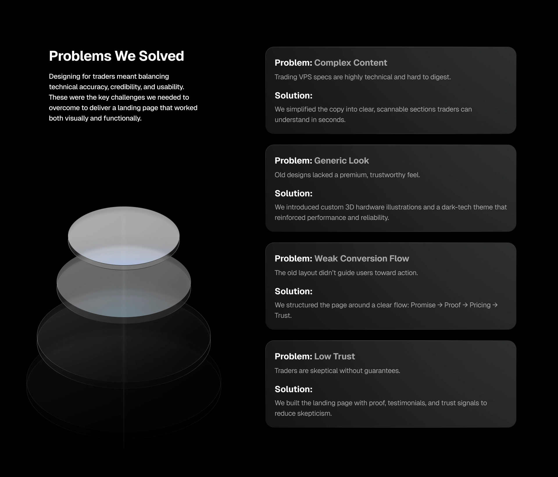Our goal was to build a landing experience that was both easy to understand and proven to trust. Traders don’t have time to dig through clutter—so we crafted a flow where the value, benefits, and pricing are clear within seconds. At the same time, we reinforced credibility with hardware-inspired 3D illustrations, performance metrics, uptime guarantees, and custom animations.