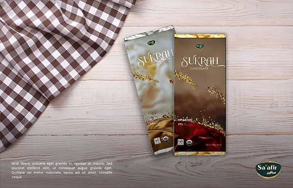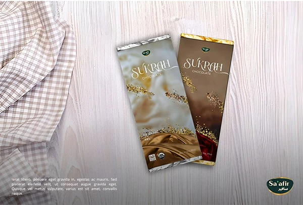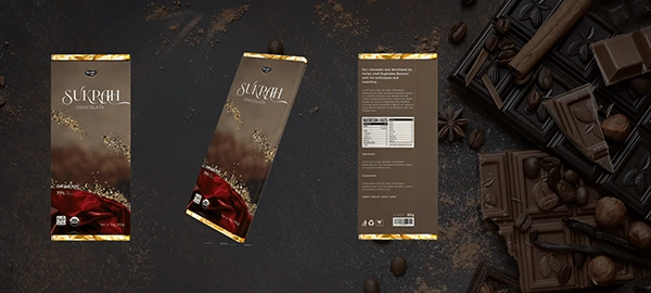 The final packaging features a striking abstract design: dark chocolate with gold flakes and a red velvet background, and white chocolate with a soft, elegant finish. These designs emphasize Sukrah’s premium quality and market distinction, achieving the perfect balance between creativity and sophistication.