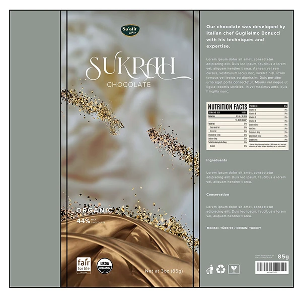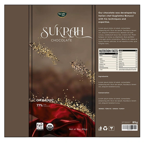 Safir, a Turkish company, tasked me with designing the packaging for Sukrah, their chocolate bar brand. The goal was to create a classy, abstract design that stood apart from traditional chocolate packaging. Inspired by an Italian chef’s Guglielmo Bonucci recipe, the packaging needed to reflect sophistication and premium quality while allowing me creative freedom.