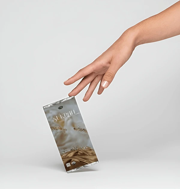Türk şirketi Safir, Sukrah markalı çikolata barları için ambalaj tasarımı yapmamı istedi. Hedef, geleneksel çikolata ambalajlarından farklı, soyut ve şık bir tasarım oluşturmaktı. İtalyan bir şefin tarifinden ilham alan bu ambalaj, hem zarafeti hem de premium kaliteyi yansıtmalıydı ve yaratıcı özgürlük sunmalıydı.