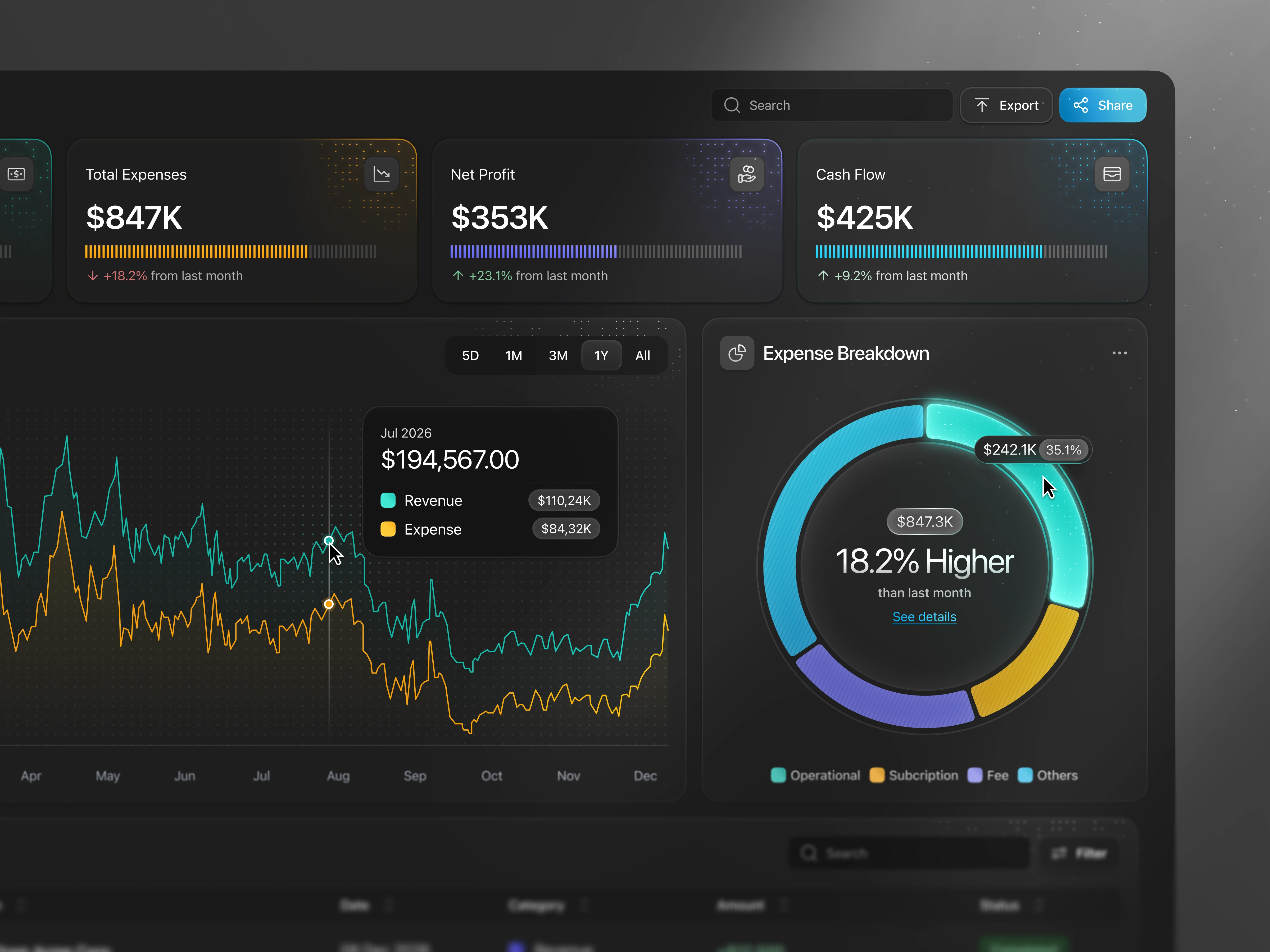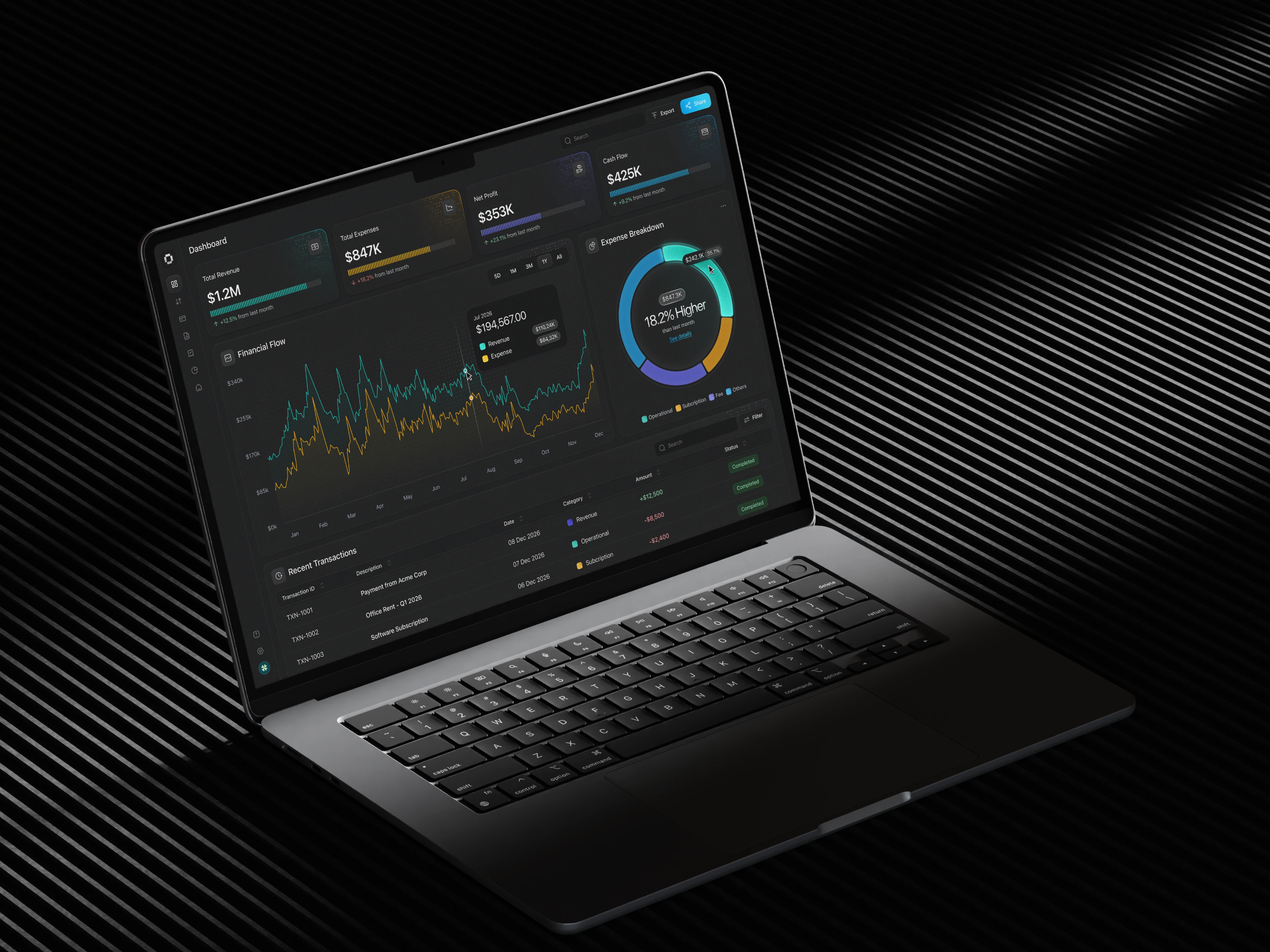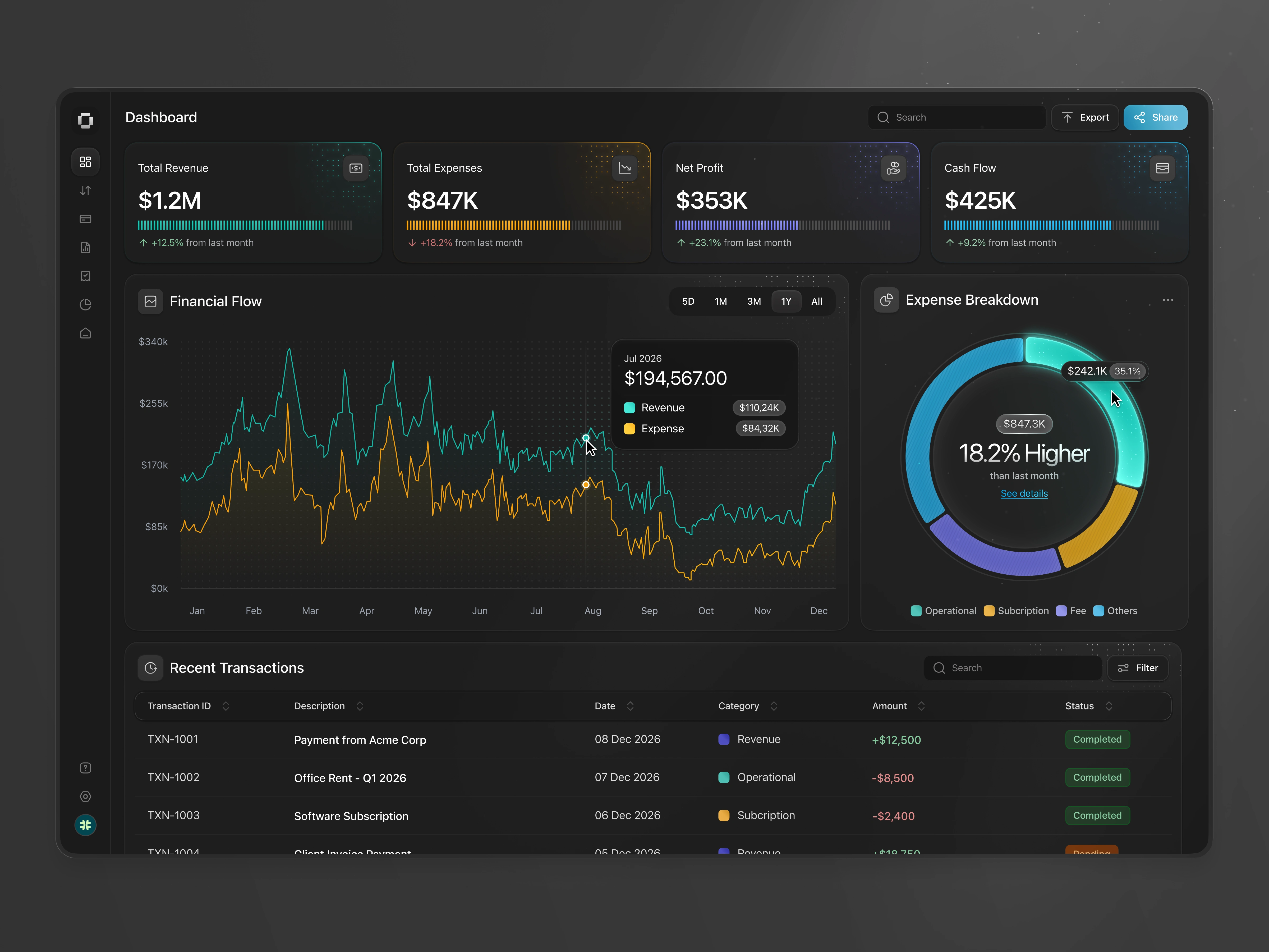 We designed the dashboard with a strong emphasis on hierarchy and visual clarity. Key financial metrics such as total revenue, expenses, net profit, and cash flow are highlighted upfront, supported by trend charts and breakdown visualizations. Dark UI styling and subtle color accents help differentiate data categories while maintaining focus.