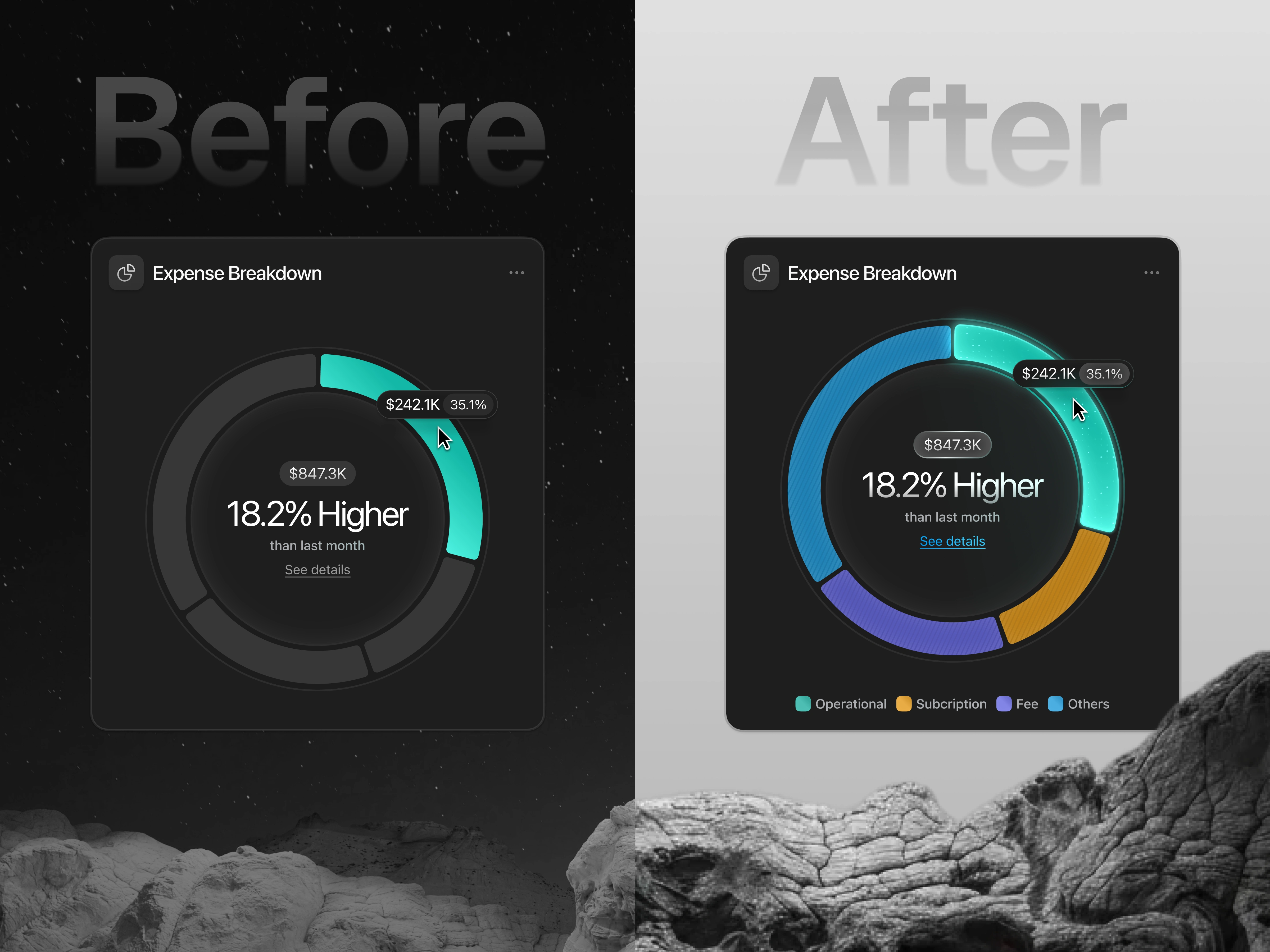 In the Before design (left), the chart relies heavily on muted tones with minimal color variation. While visually calm, this approach weakens category differentiation. Users must rely on tooltips or cognitive effort to understand which expense segments are significant, slowing insight discovery.