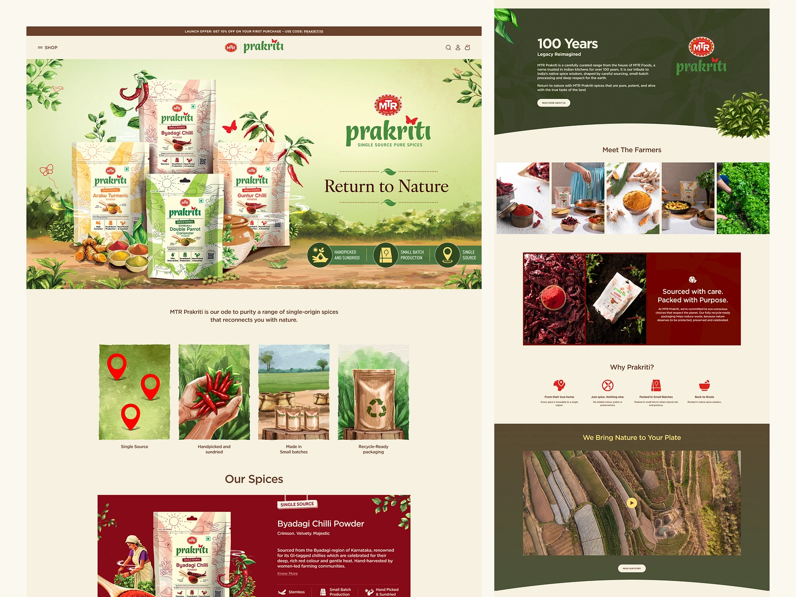 We crafted a product detail page for MTR Prakruti that highlights single-origin spices with clear product information origin story, flavor notes, health benefits, weight variants, reviews, and pricing all wrapped in a clean, intuitive add-to-cart experience. The focus is on storytelling and simplicity while keeping the buying journey frictionless.