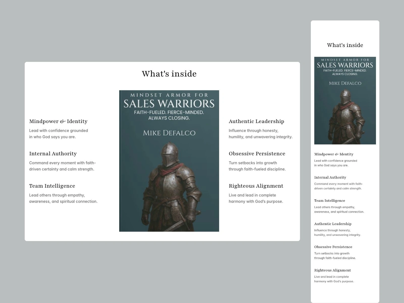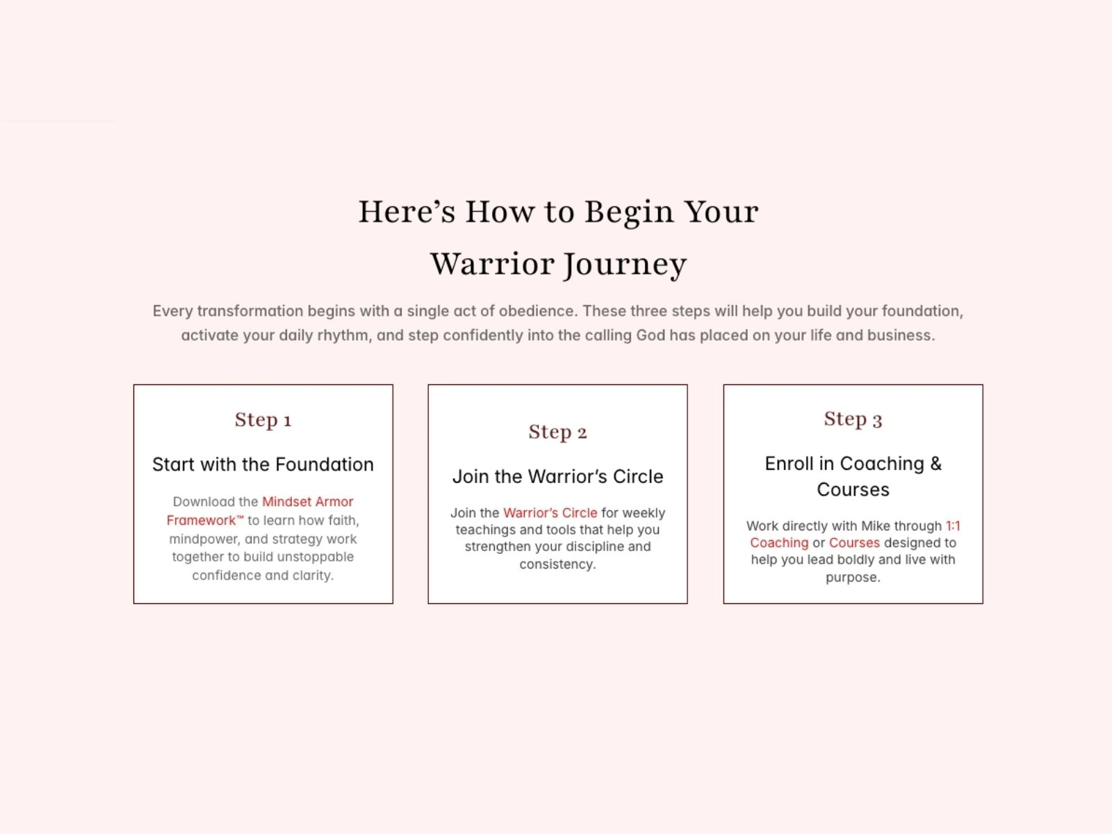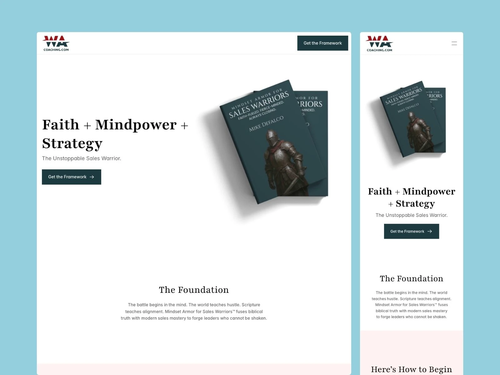 I designed and developed the landing website for Warrior Armor, a faith-driven coaching brand created by sales leader Mike Defalco. The focus was to visually communicate strength, identity, and clarity — while guiding users into the Mindset Armor Framework and his coaching ecosystem.